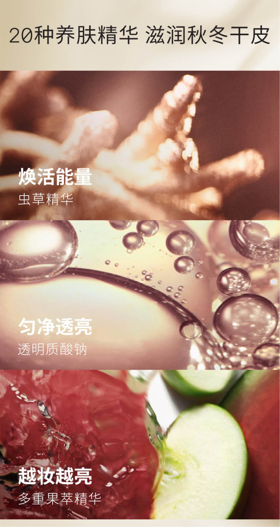 双介面丝滑粉底液,专业校正你的肌肤底色,只需一个简单步骤,即刻匀净与修饰肤色。注入以奢贵冬虫夏草与卤虫组成的焕活水光复合成分,此粉底配方能重新赋活肌肤表面,即刻唤醒光采,打造看起来自然焕亮的妆容。蕴含活性六胜肽与抗UVA/UVB紫外线防护功能,保护肌肤免受外界污染侵害,同时有助预防胶原蛋白损伤,卓效抵御肌肤显着的老化痕迹。