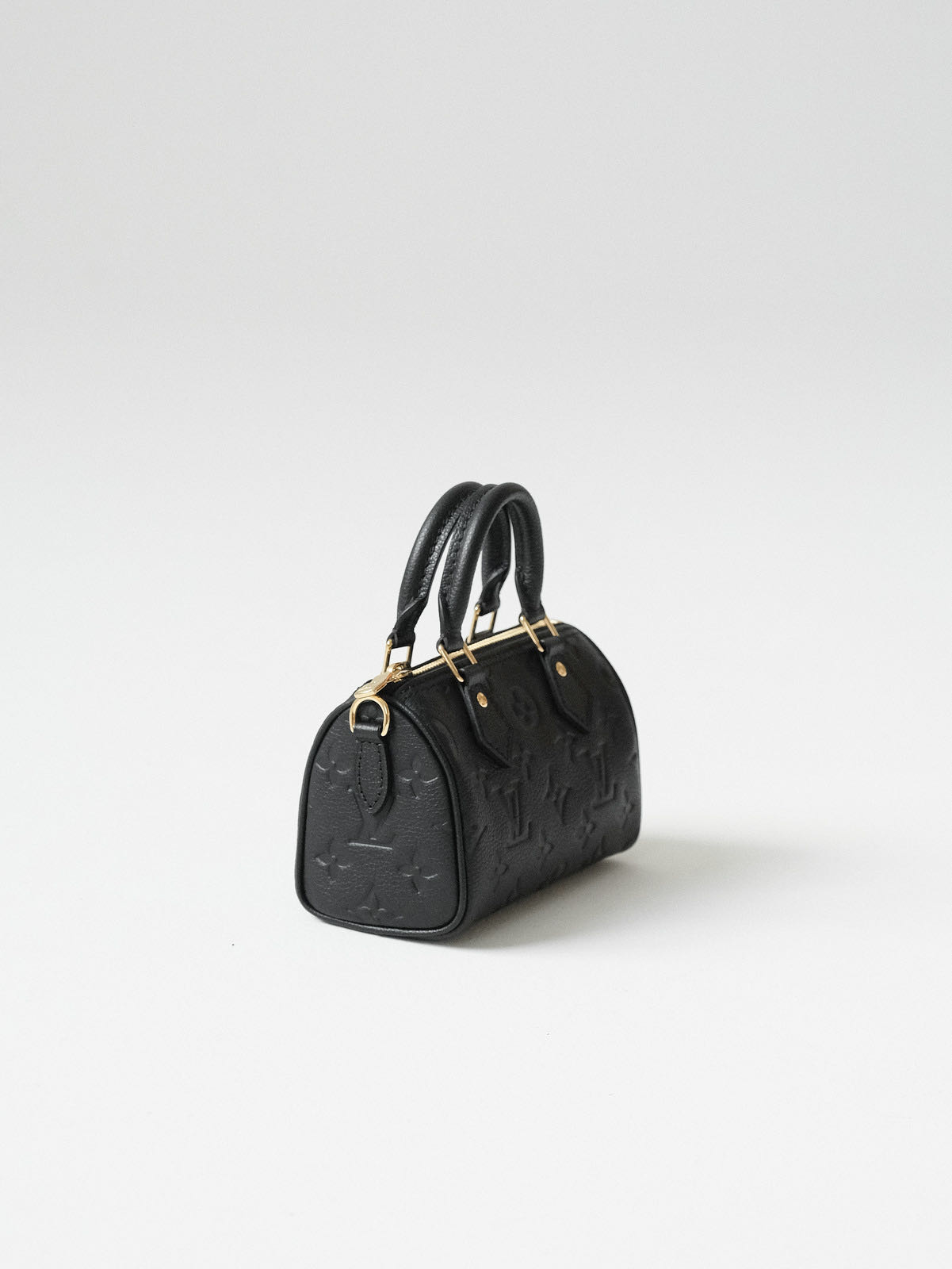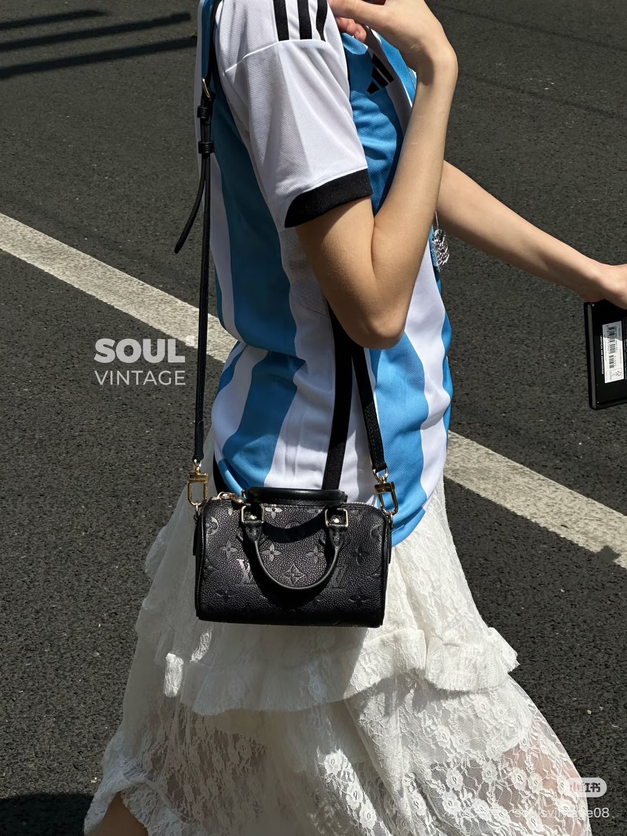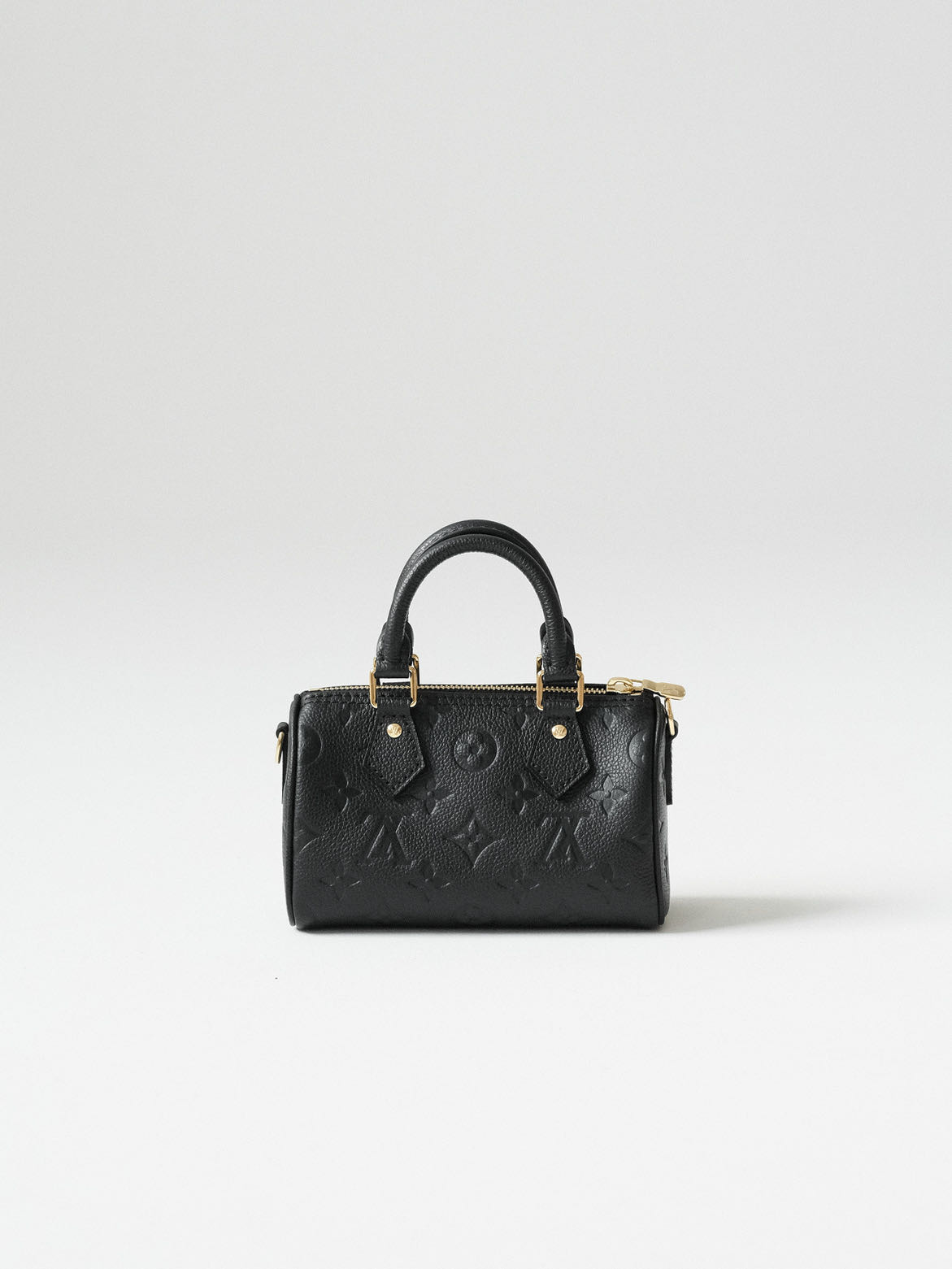 全皮nano迷你枕头包系列本款浓缩Speedy手袋的经典轮廓,为Monogram Empreinte 粒面皮革压印Monogram图案,成就柔软贴身的圆润构型。顶部手柄和可拆卸并调节的肩带实现多种背携方式。Nano Speedy手袋,散发极致女人味,全皮压花丝印可调节肩带迷你枕头包,是您携带日常用品的理想之选。这款手袋是原型Speedy手袋的完美迷你版,缝线精致,轻盈无比,顶部手柄和可拆卸并调节的肩带实现多种背携方式。
