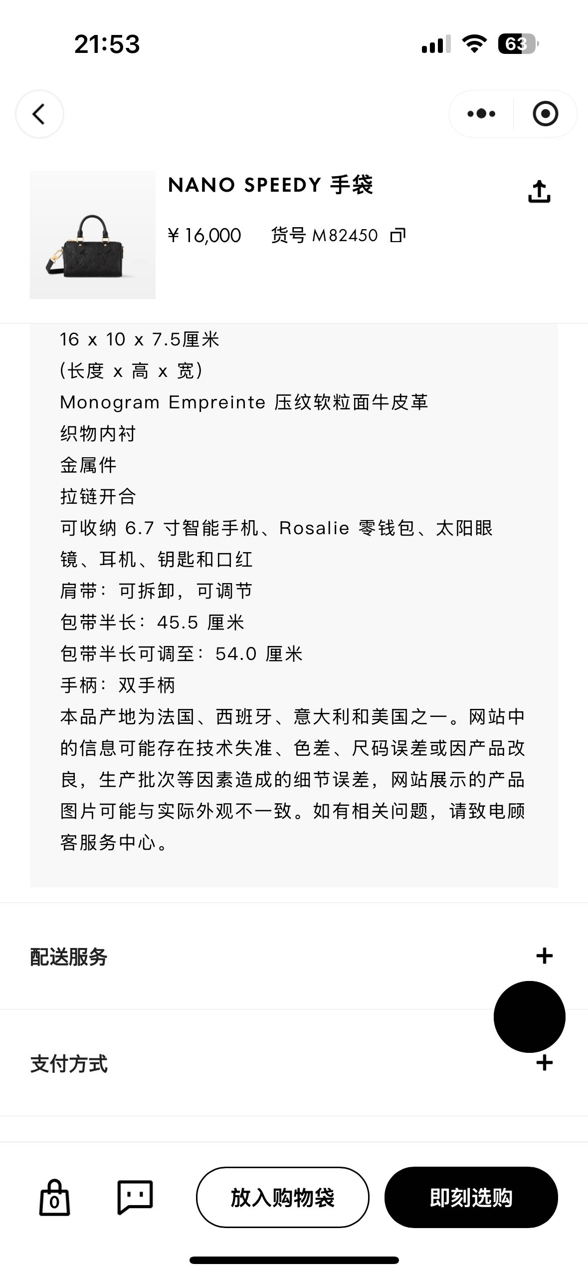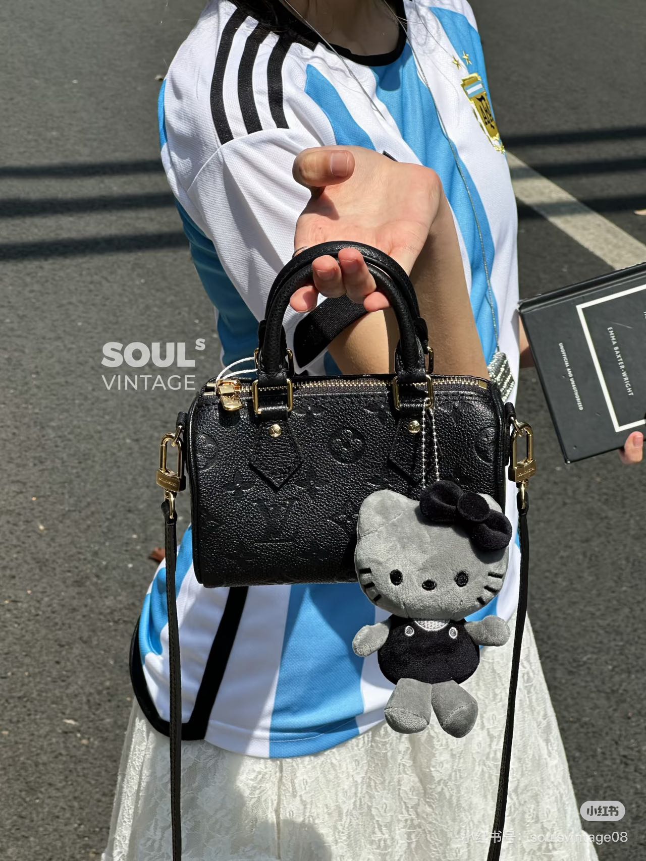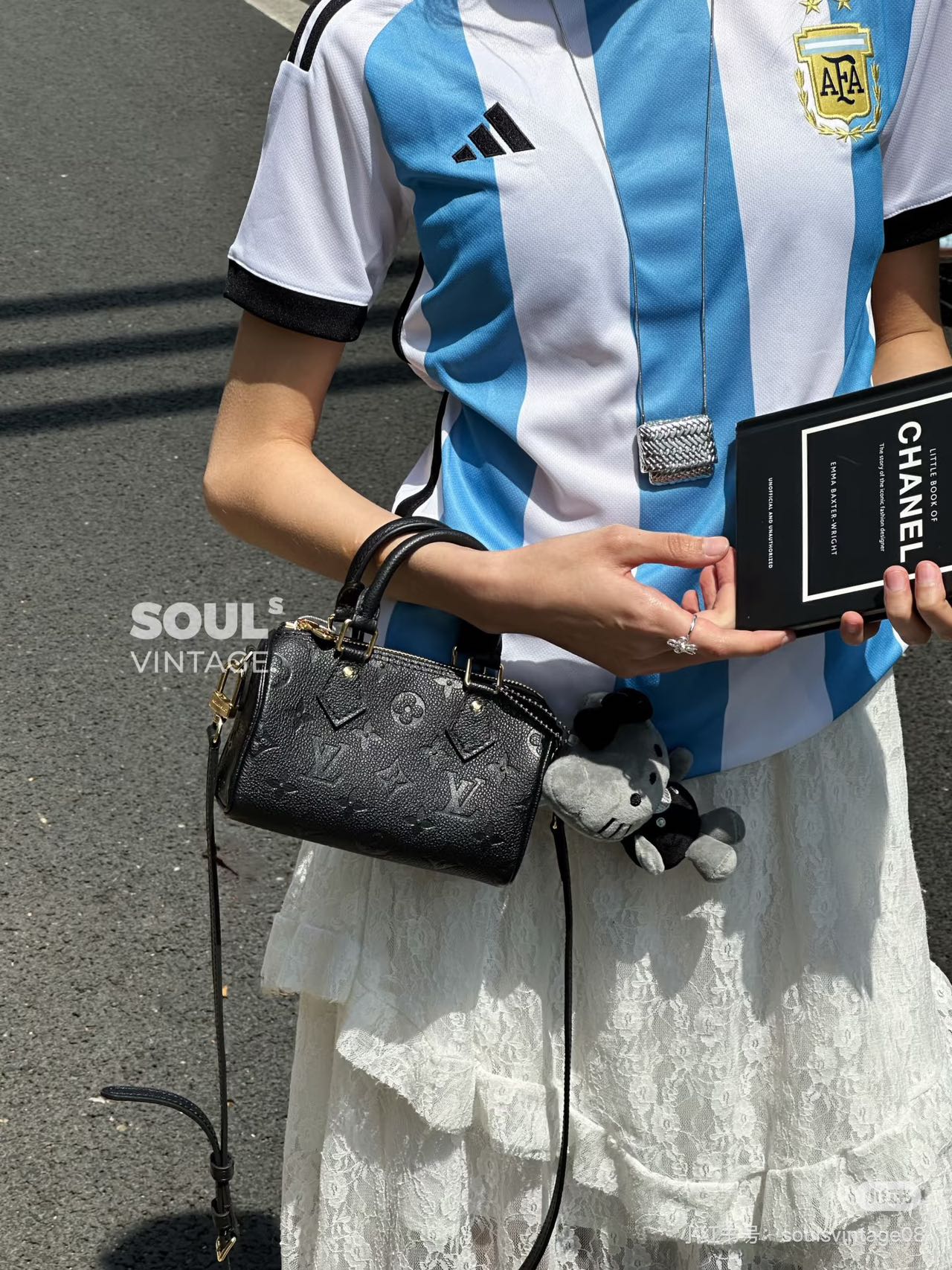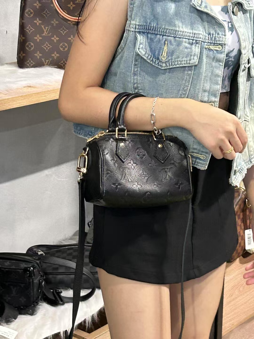 全皮nano迷你枕头包系列本款浓缩Speedy手袋的经典轮廓,为Monogram Empreinte 粒面皮革压印Monogram图案,成就柔软贴身的圆润构型。顶部手柄和可拆卸并调节的肩带实现多种背携方式。Nano Speedy手袋,散发极致女人味,全皮压花丝印可调节肩带迷你枕头包,是您携带日常用品的理想之选。这款手袋是原型Speedy手袋的完美迷你版,缝线精致,轻盈无比,顶部手柄和可拆卸并调节的肩带实现多种背携方式。