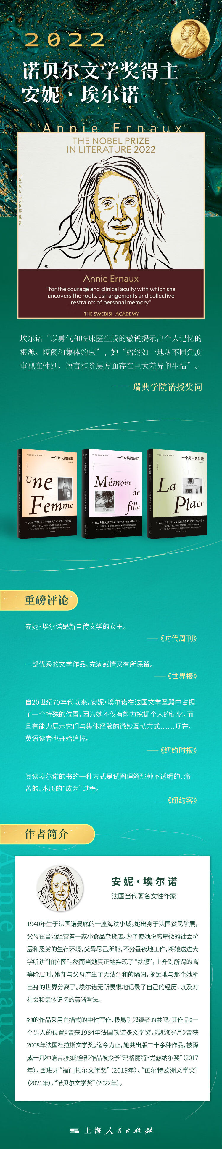 法国当代著名女性作家。1940年生于法国诺曼底的一座海滨小城。她出身于法国贫民阶层,父母在当地经营着一家小食品杂货店。为了使她脱离卑微的社会阶层和恶劣的生存环境,父母尽己所能,不分昼夜地工作,将她送进大学听讲“柏拉图”。然而当她真正地实现了“梦想”,上升到所谓的高等阶层时,她却与父母产生了无法调和的隔阂,永远地与那个她所出身的世界分离了。埃尔诺无所畏惧地记录了自己的经历,以及对社会和集体记忆的清晰看法。她的作品采用白描式的中性写作,极易引起读者的共鸣。
