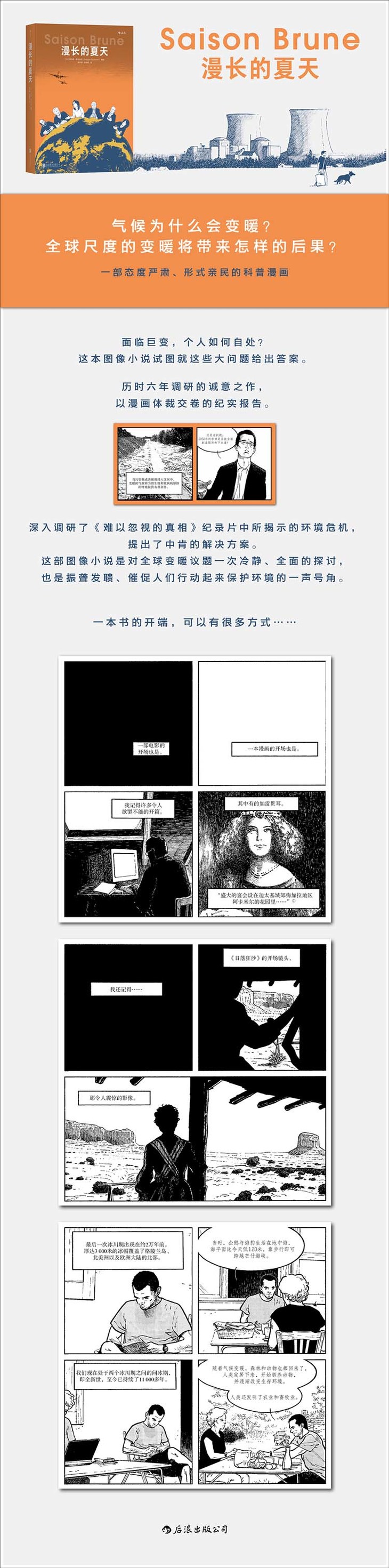 《漫长的夏天》是漫画结合纪录片、纪实报道和科普文学等体裁的一次大胆尝试,也是一部平易近人、而又发人深省的作品。它深入调研了《难以忽视的真相》纪录片中所揭示的环境危机,提出了中肯的解决方案。这部图像小说是对全球变暖议题一次冷静、全面的探讨,也是振聋发聩、催促人们行动起来保护环境的一声号角。