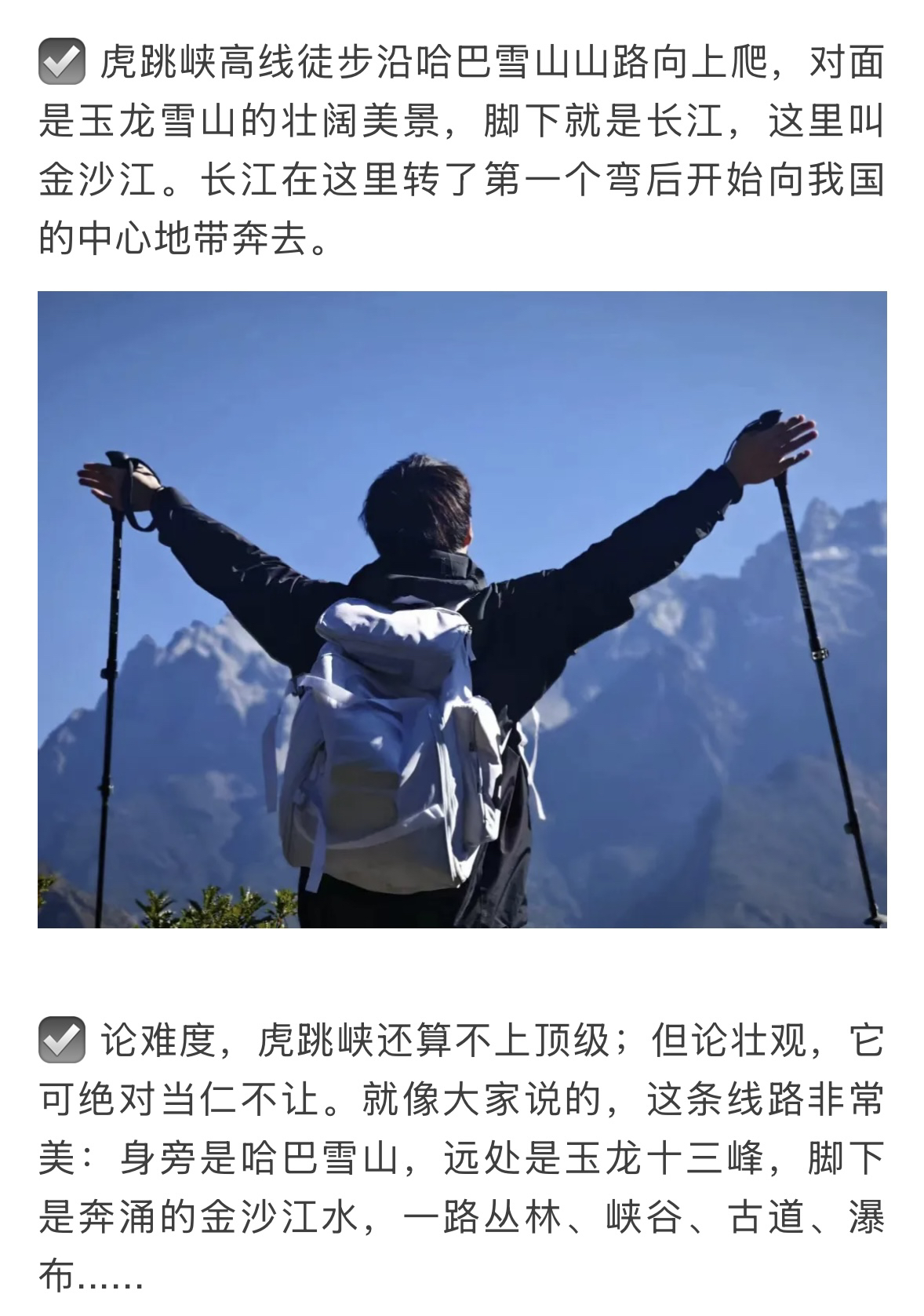 被《国家地理》安利的世界TOP级徒步路线有多绝!虎跳峡高路被誉为世界十大最美经典徒步路线之一,吸引着不同肤色、不同国度的驴友来此徒步,一路上外国人却比国内人要多得多,是一条徒步者"外国人比中国人还多"的路线,沿途许多指引标识甚至都不是中文。