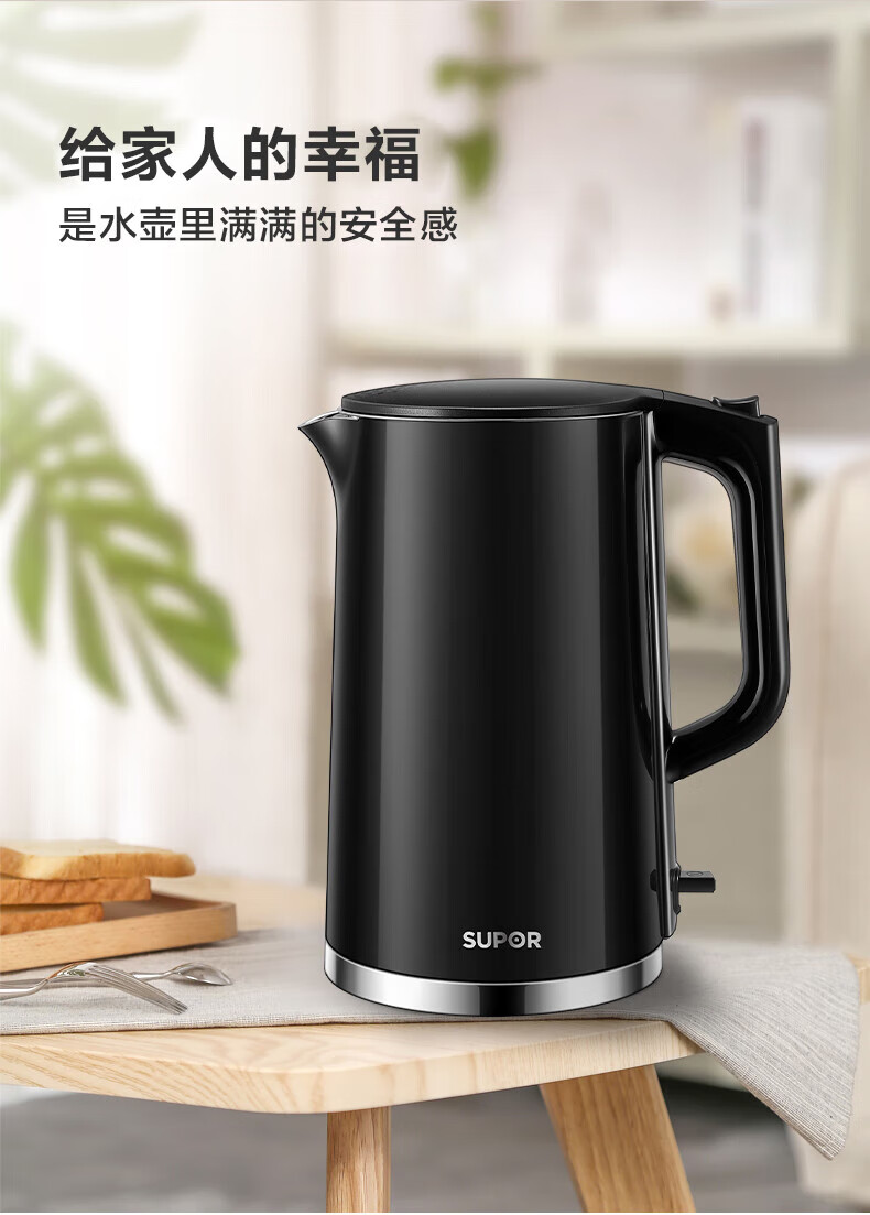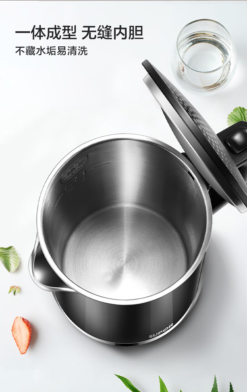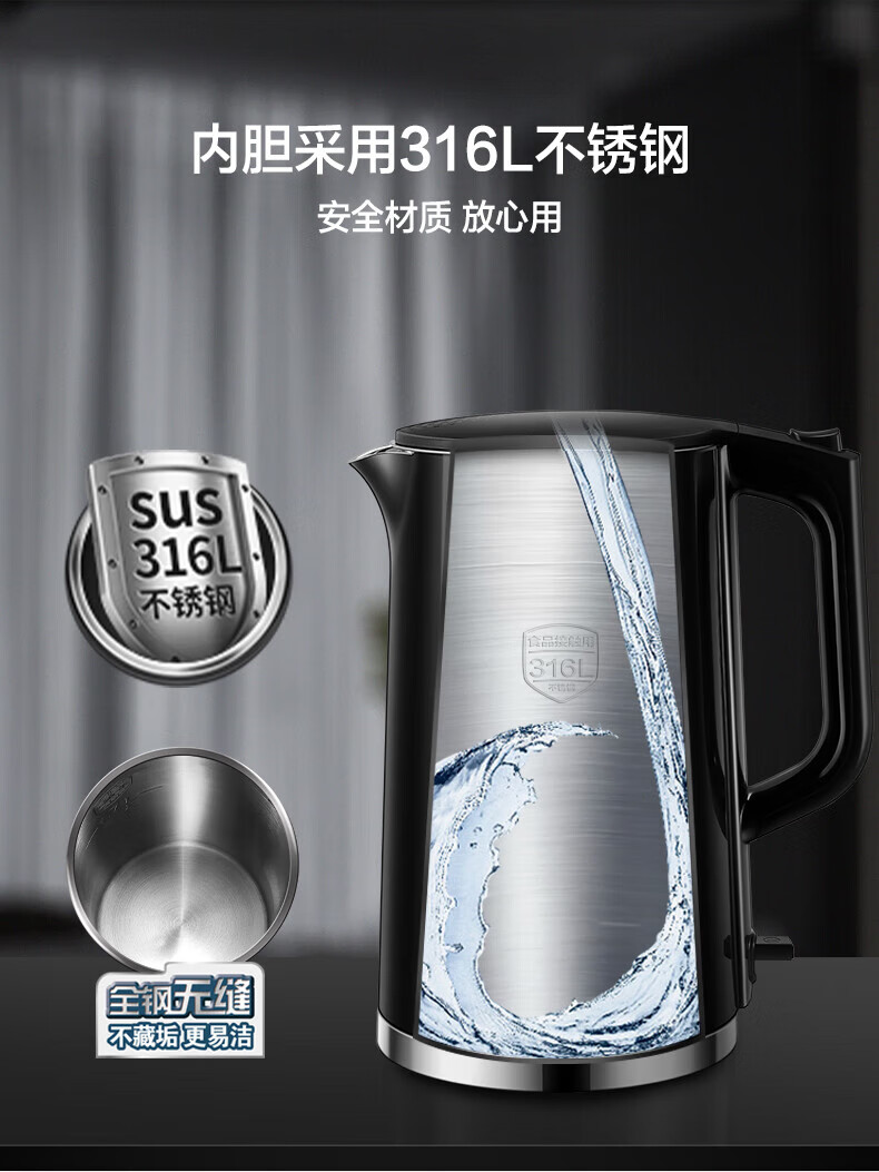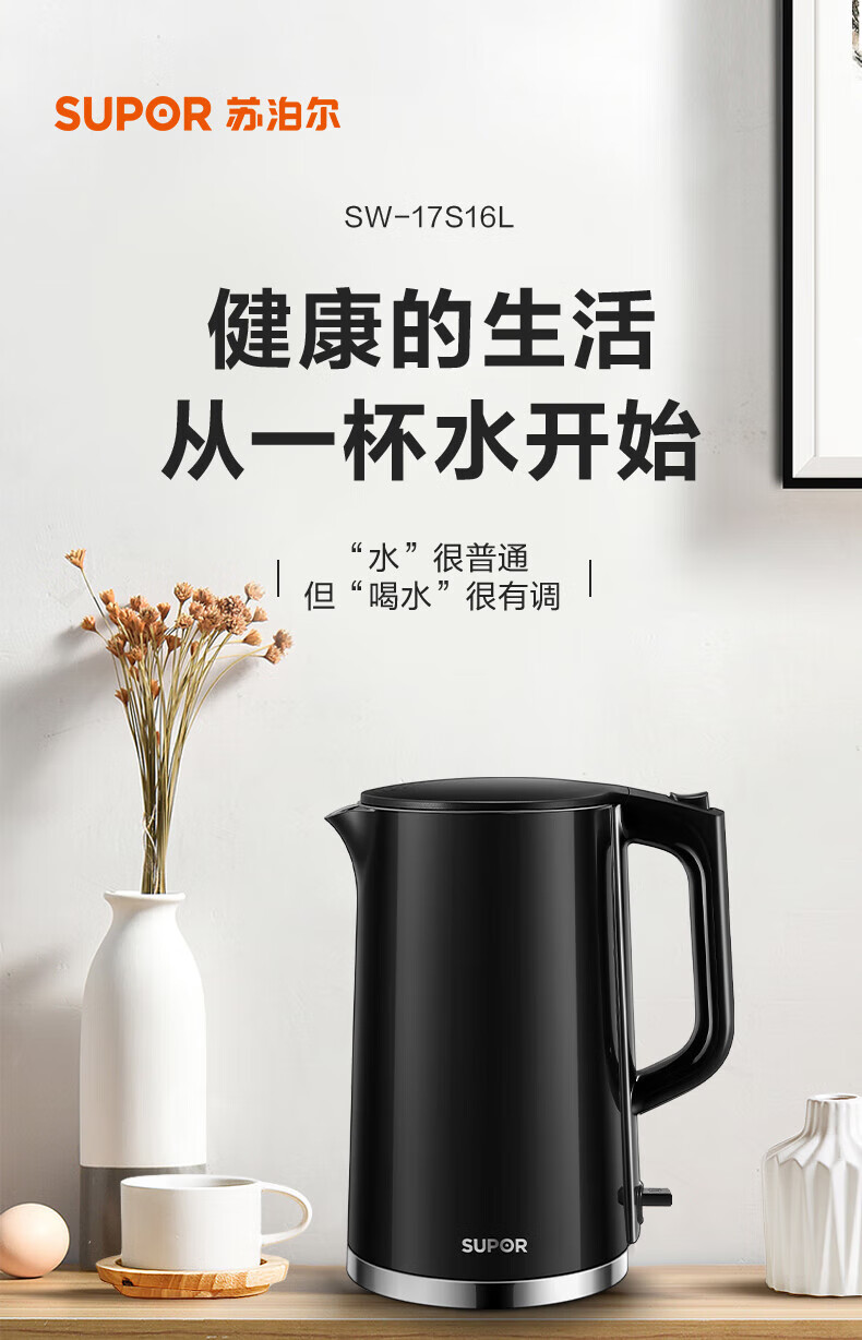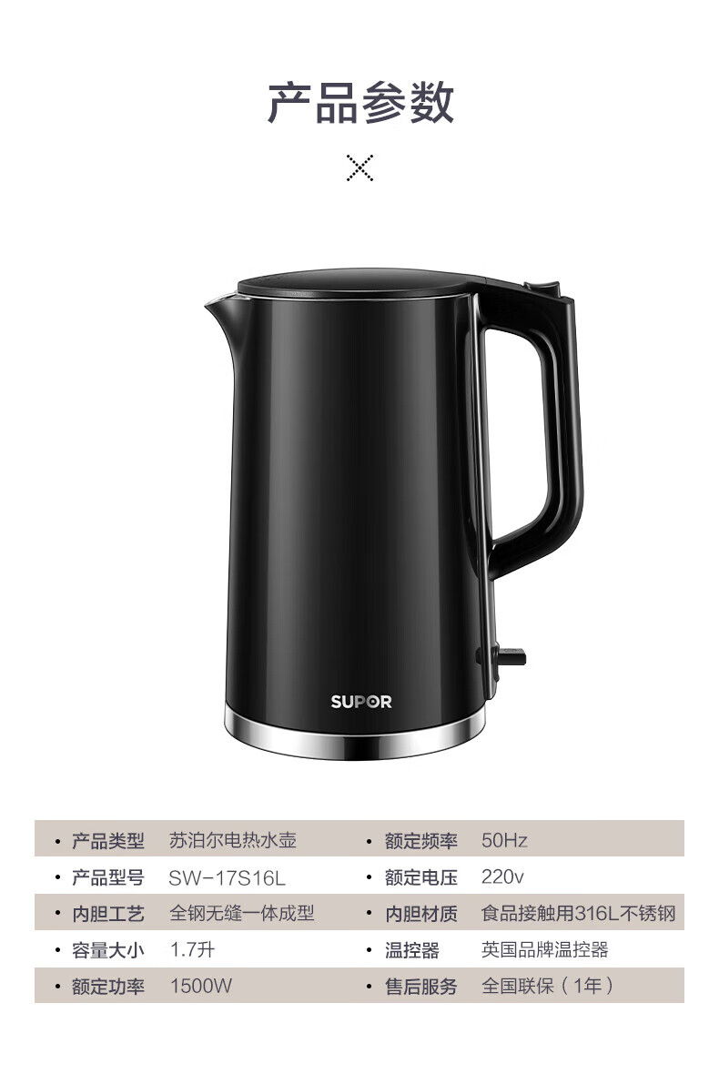 苏泊尔(SUPOR)电水壶双层保温防烫电热水壶1500W大功率全钢无缝316L不锈钢烧水壶家用1.7升SW-17S16L