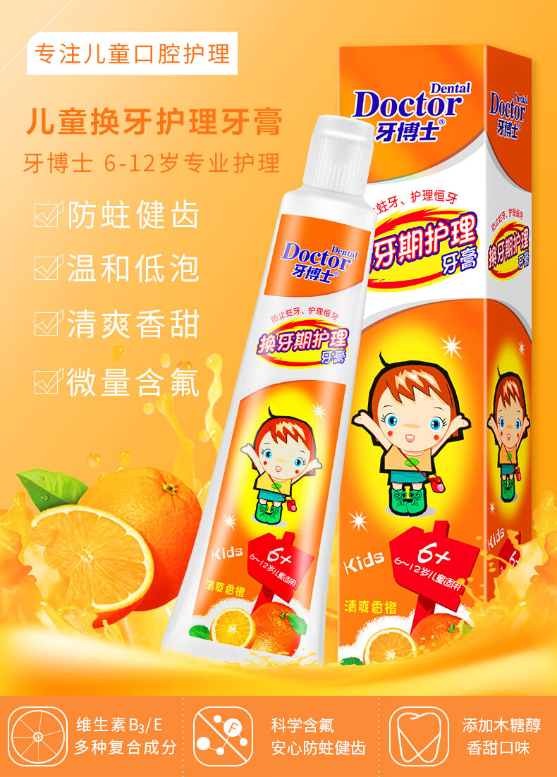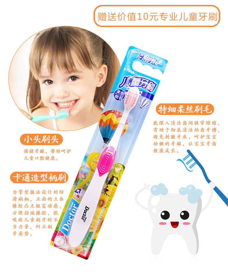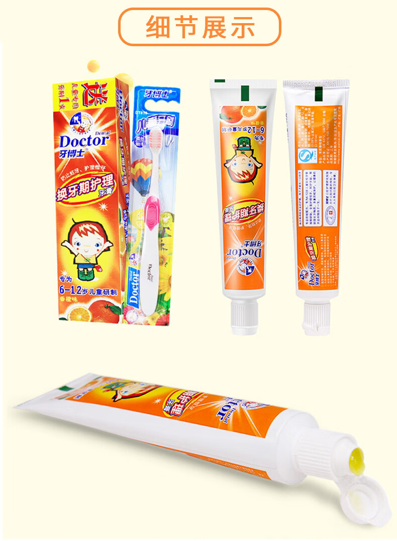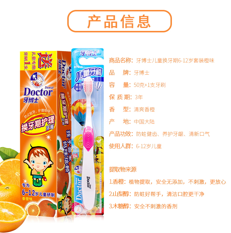 【鼎】牙博士儿童牙膏牙刷6-12岁含氟防蛀固齿 (香橙味50g+1支牙刷)