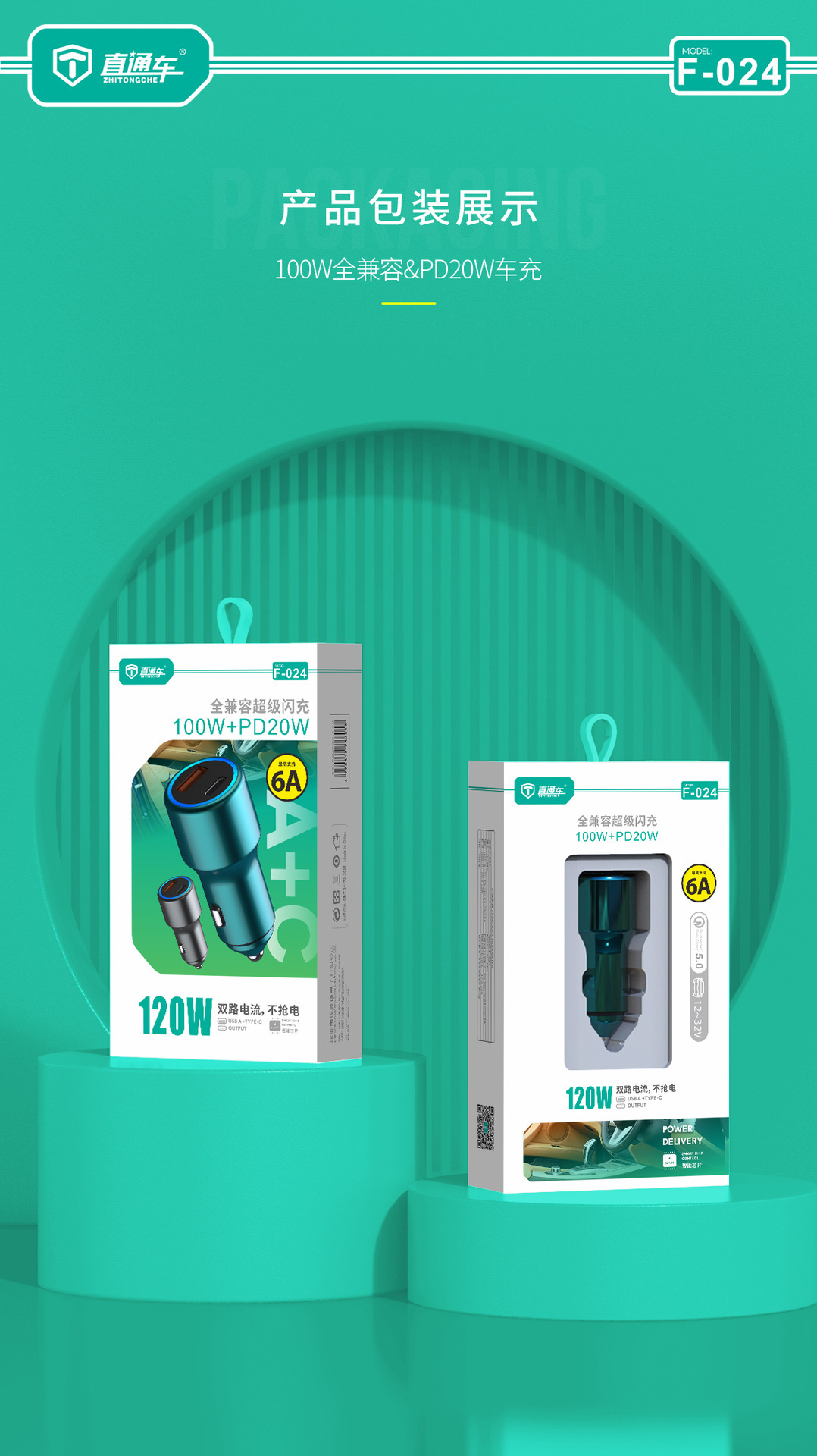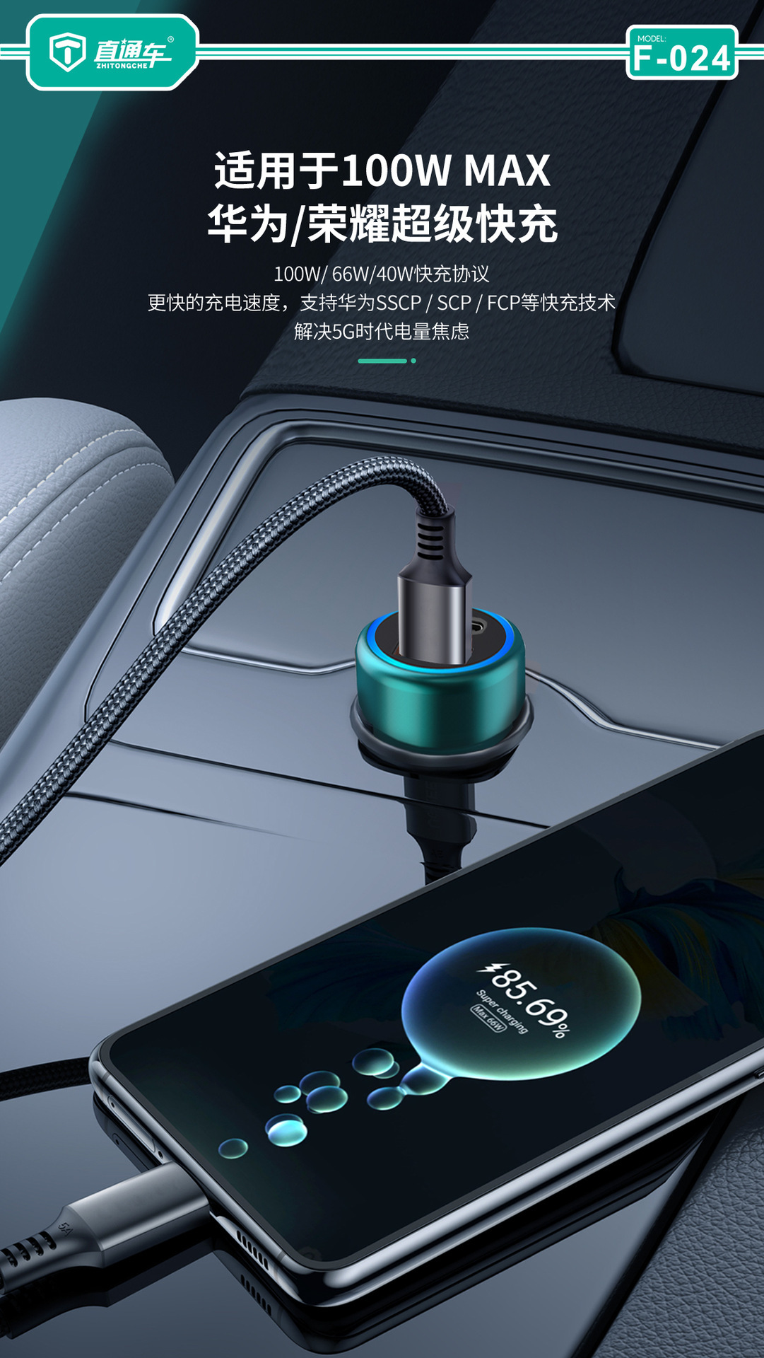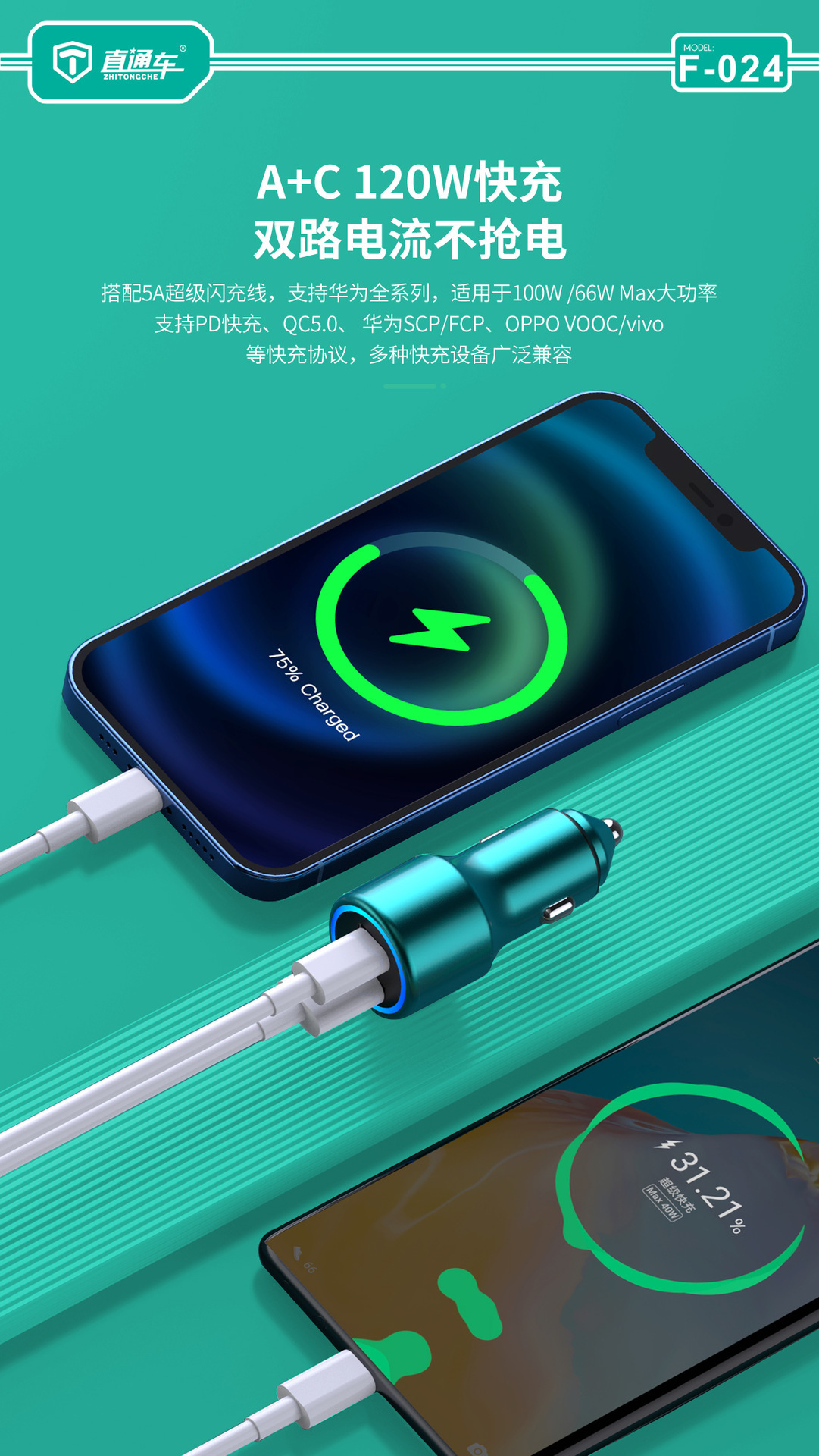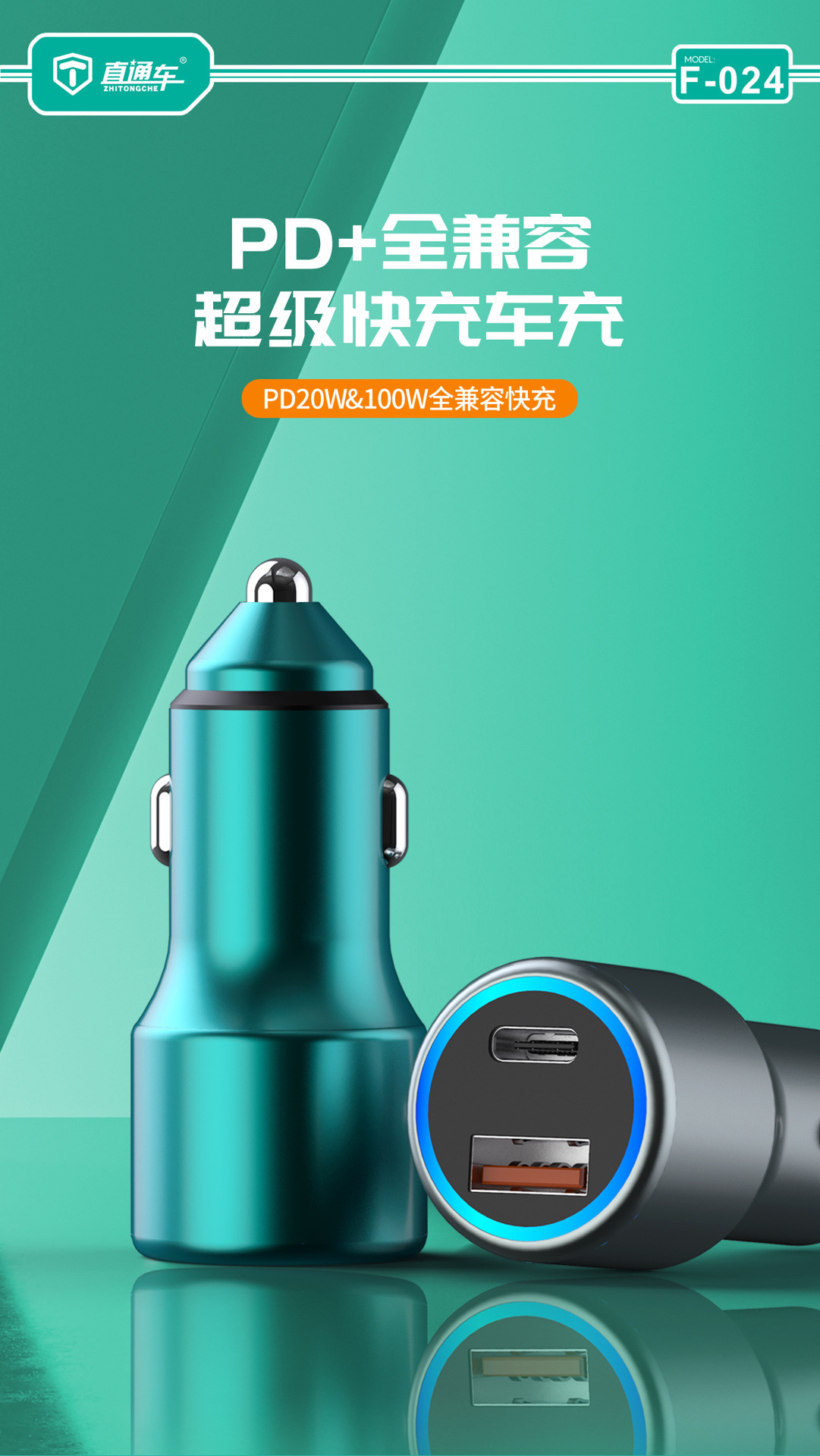 严选【金属多兼容车载充电器】100W+20W双口PD快充适用华为平果米荣耀PO车充1个