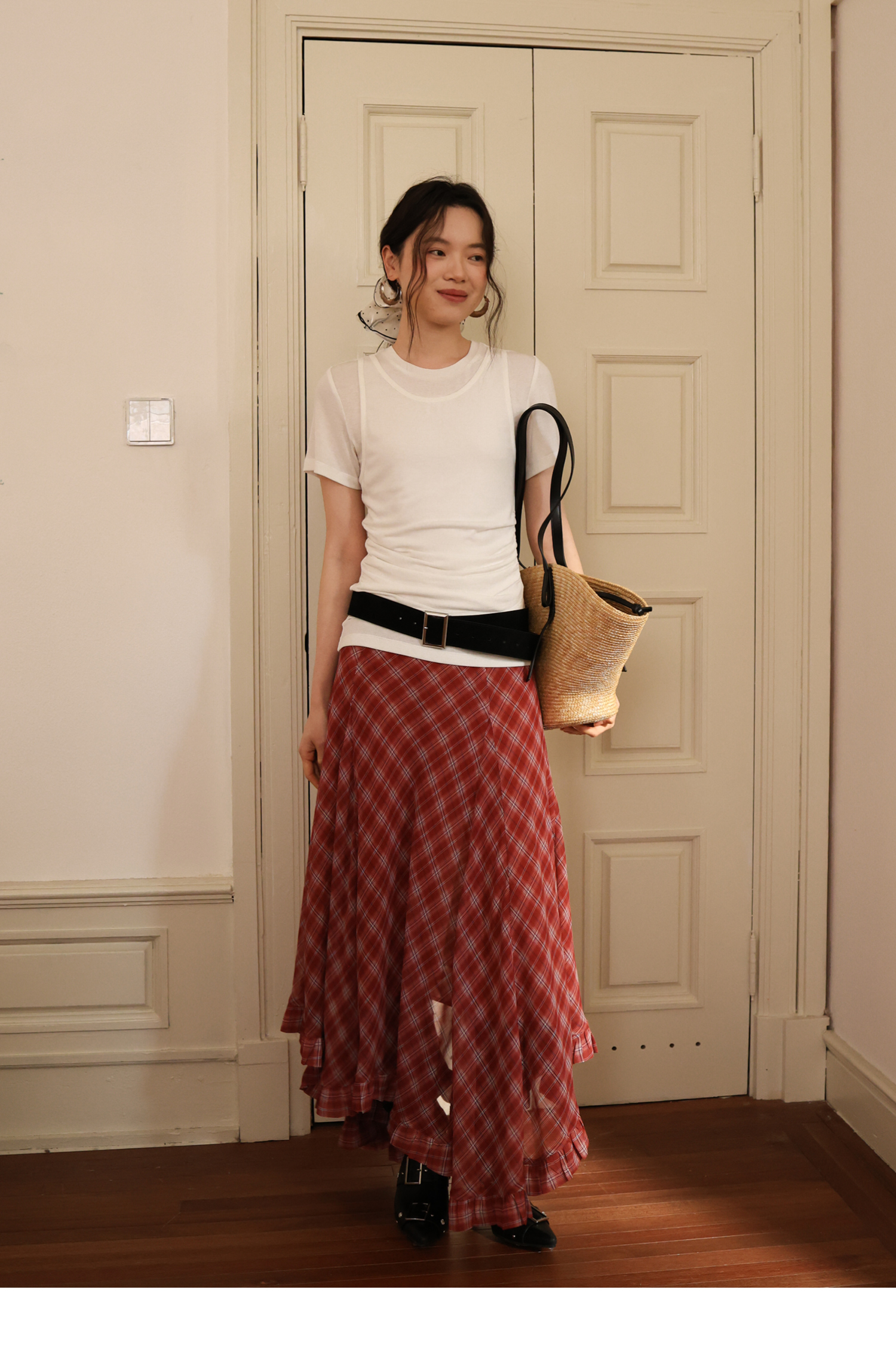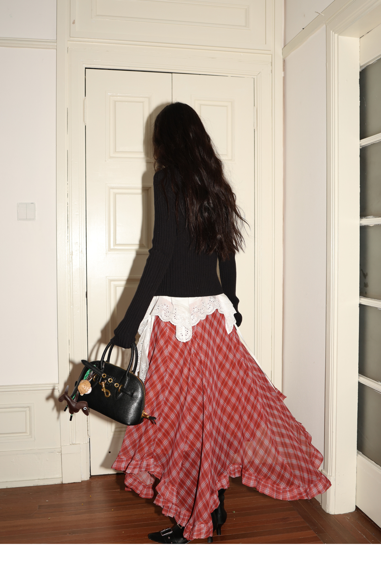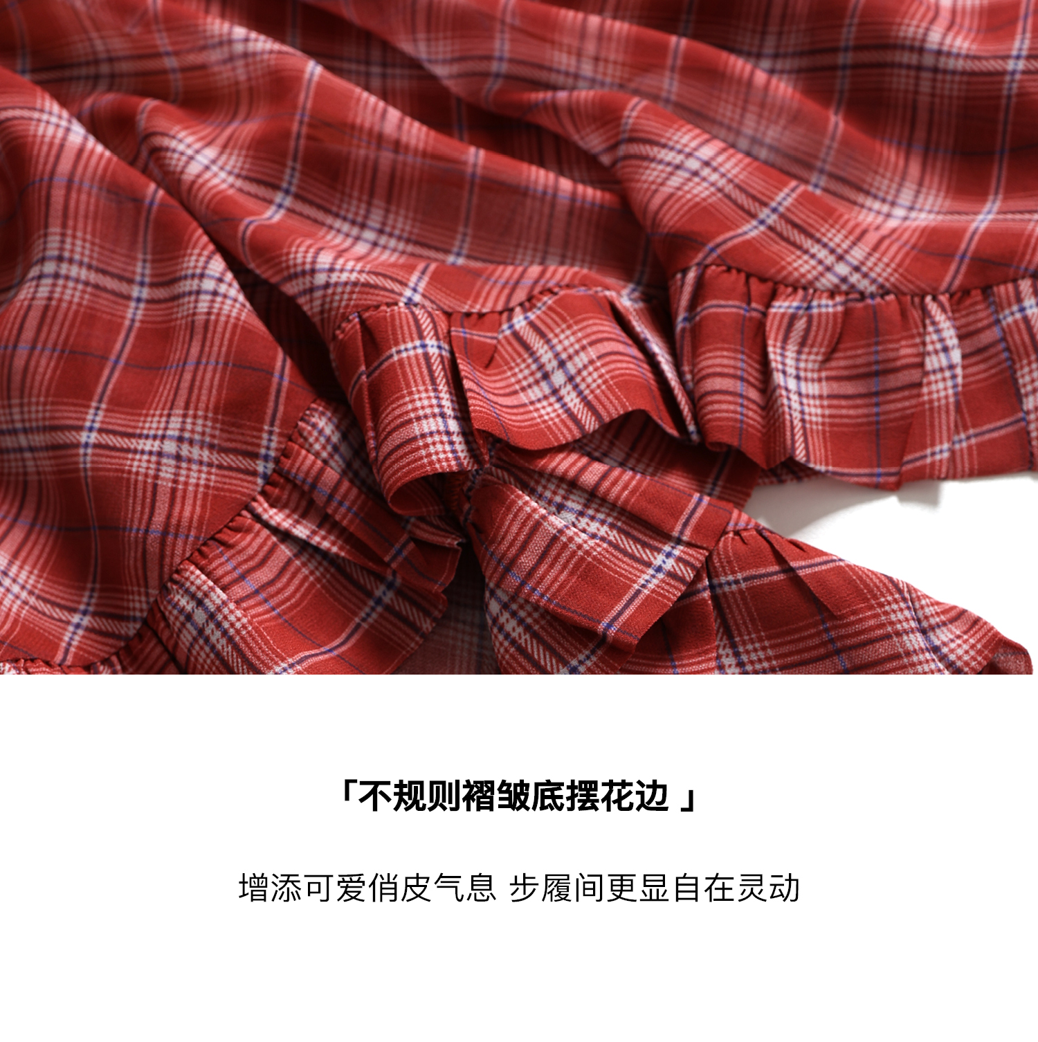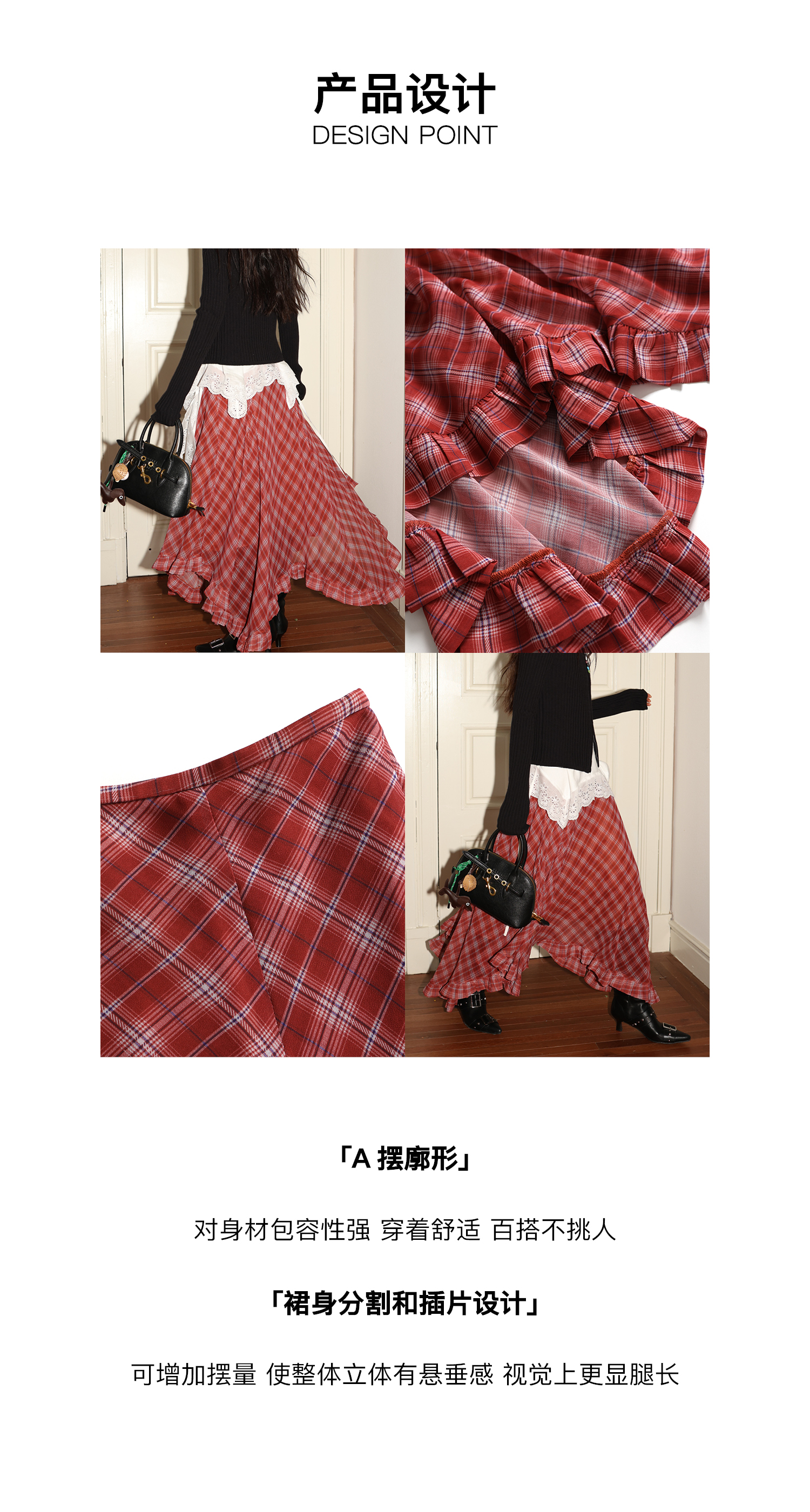 素舶 复古两色格纹中腰不规则木耳边下摆中长雪纺半裙