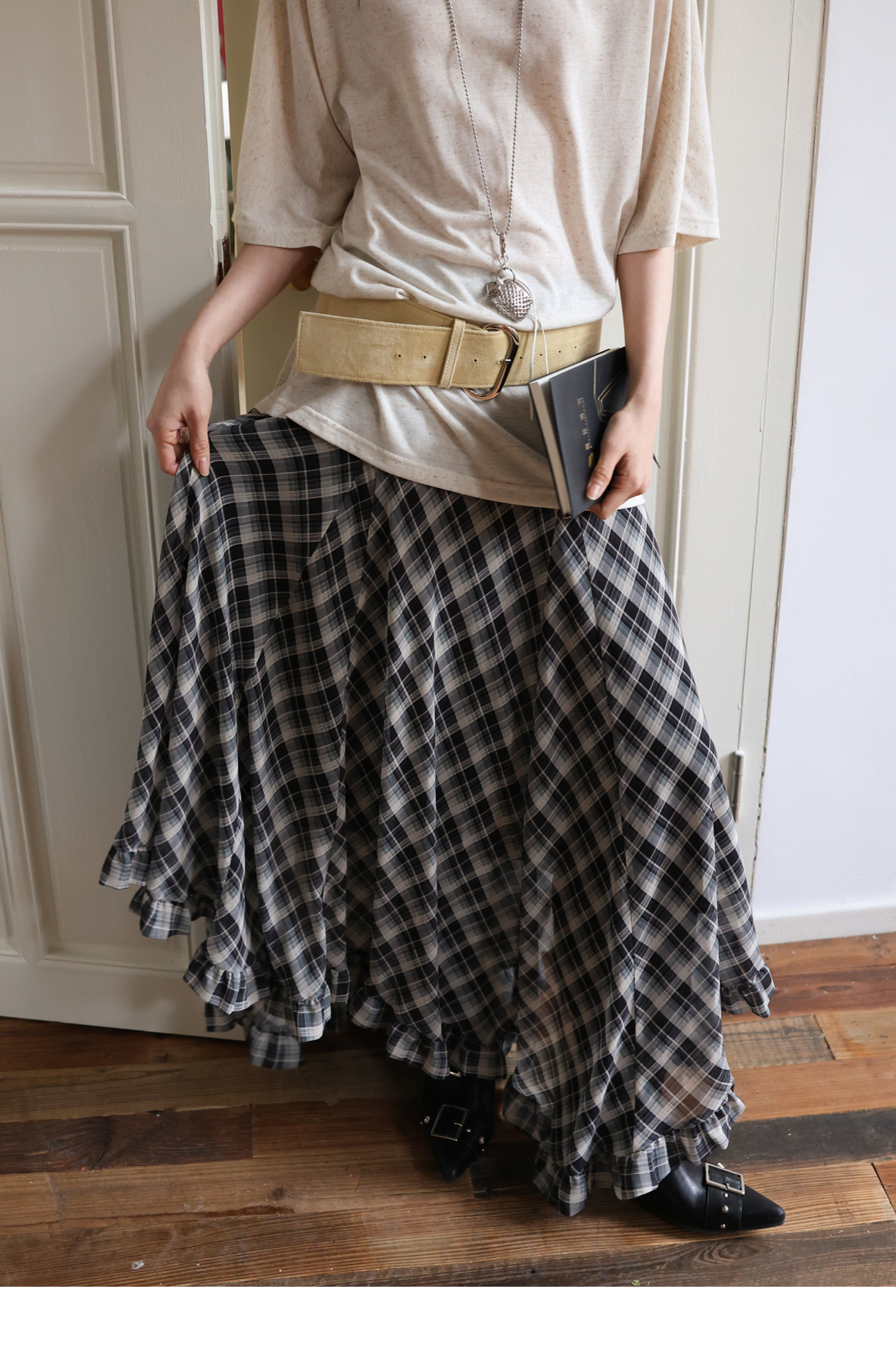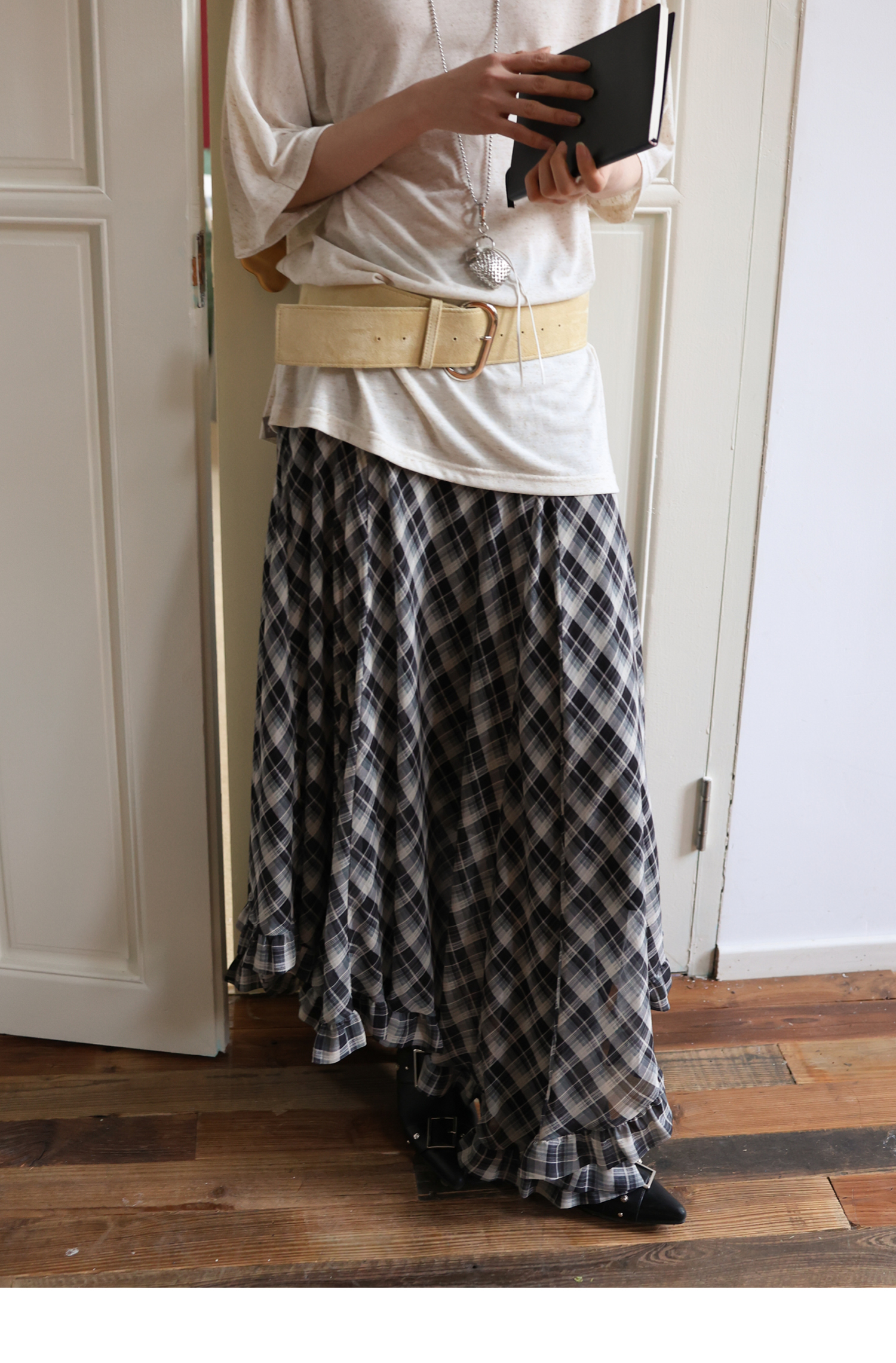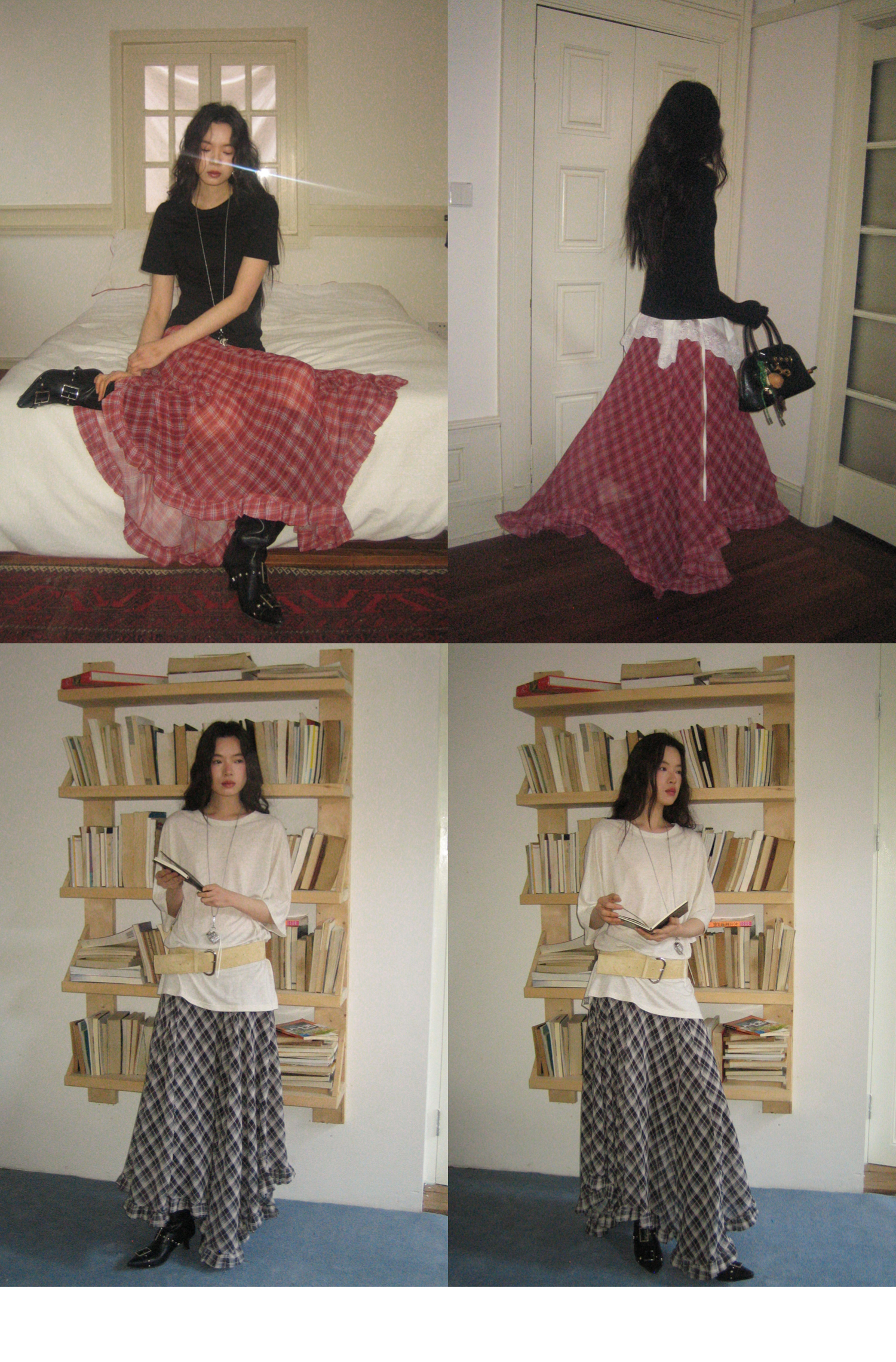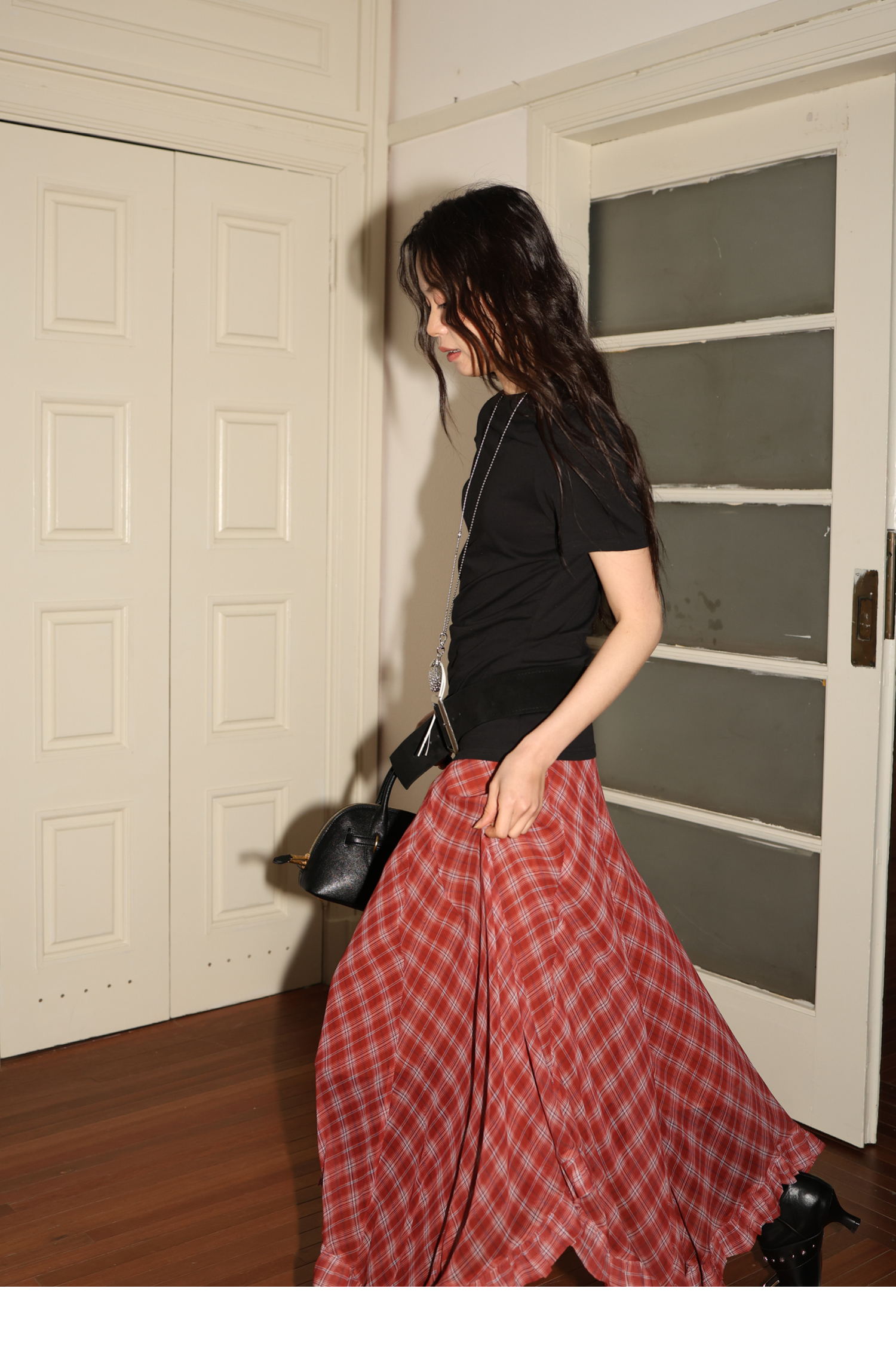 素舶 复古两色格纹中腰不规则木耳边下摆中长雪纺半裙