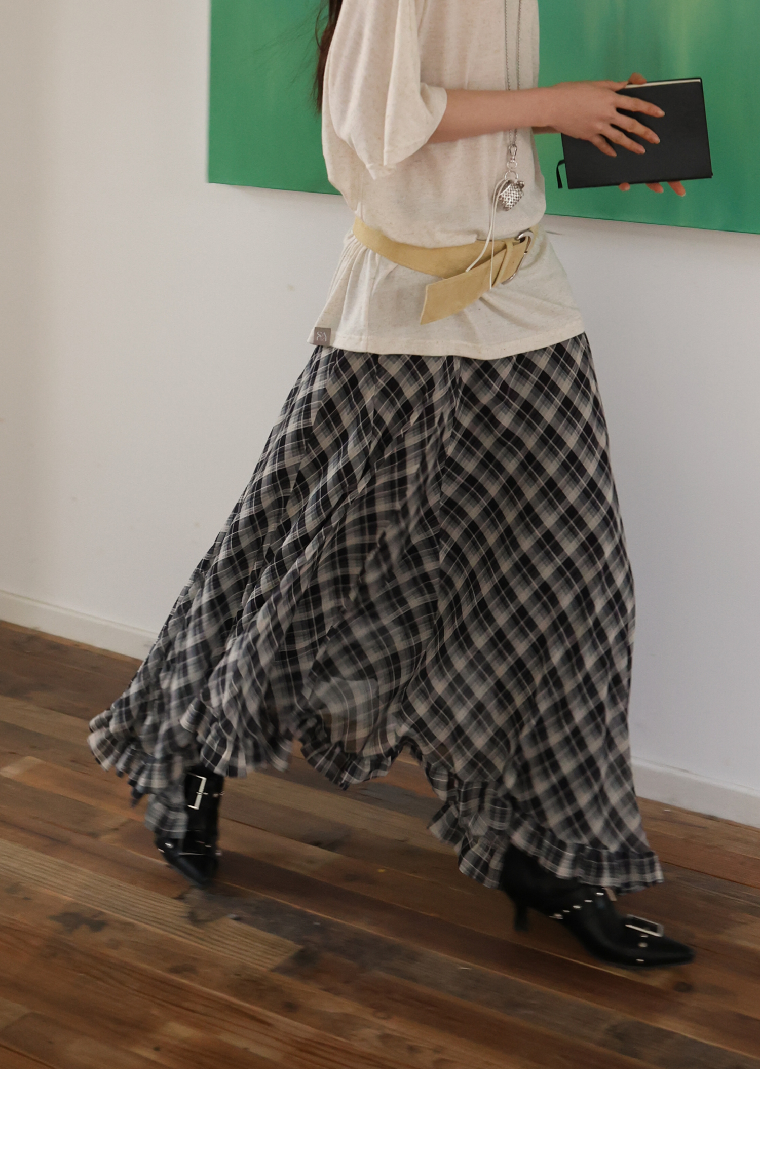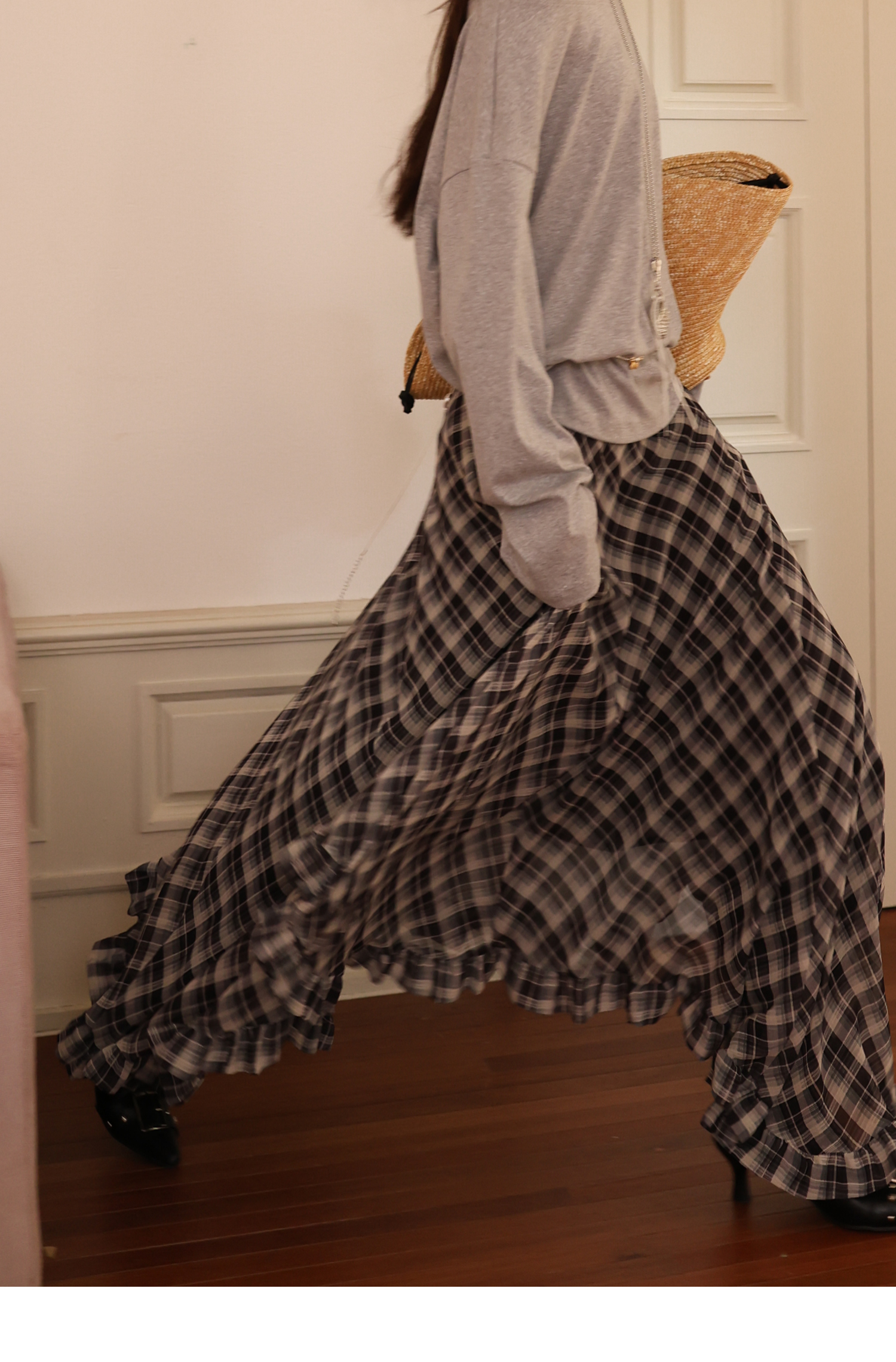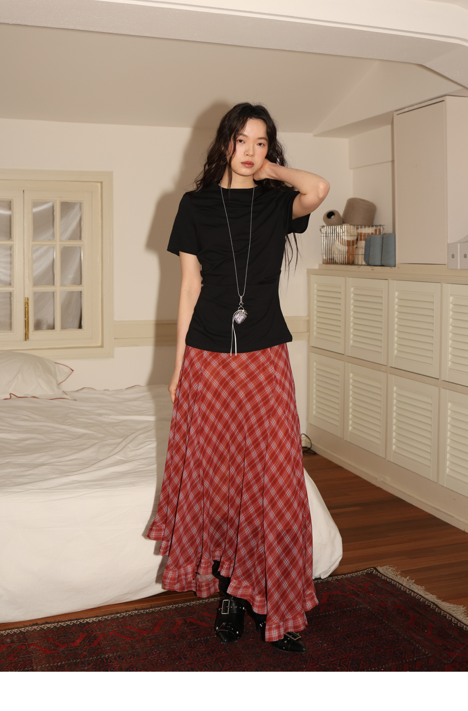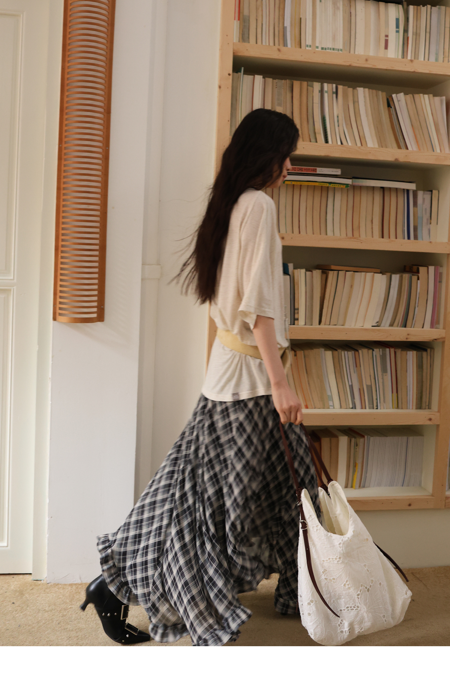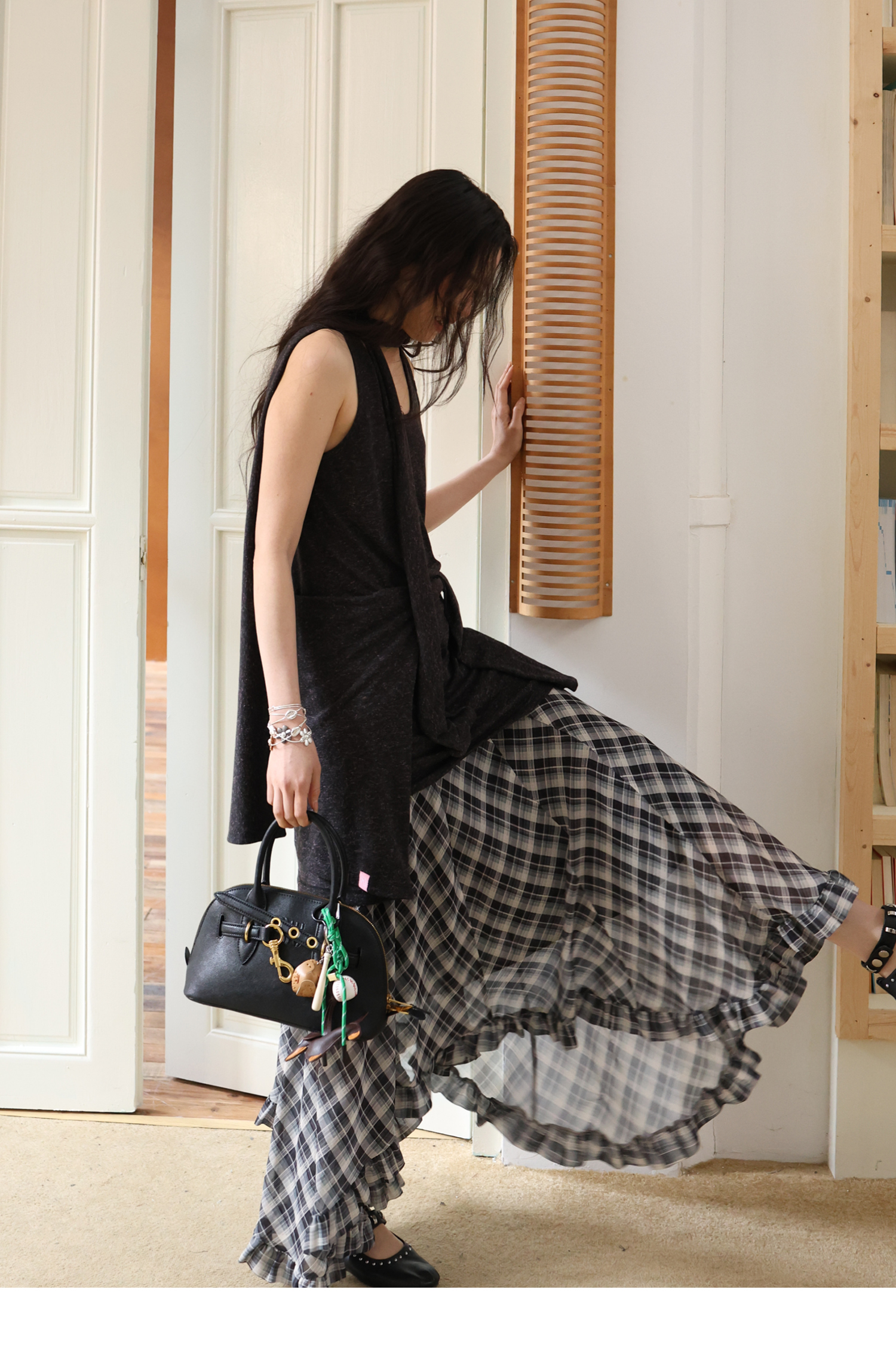 素舶 复古两色格纹中腰不规则木耳边下摆中长雪纺半裙