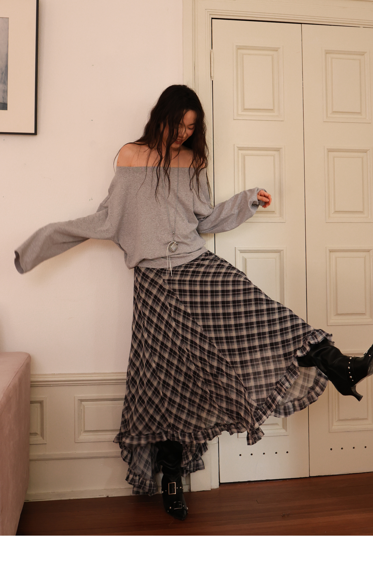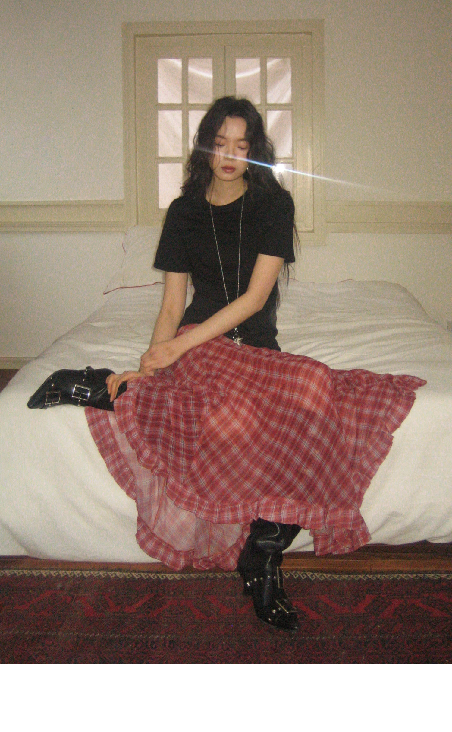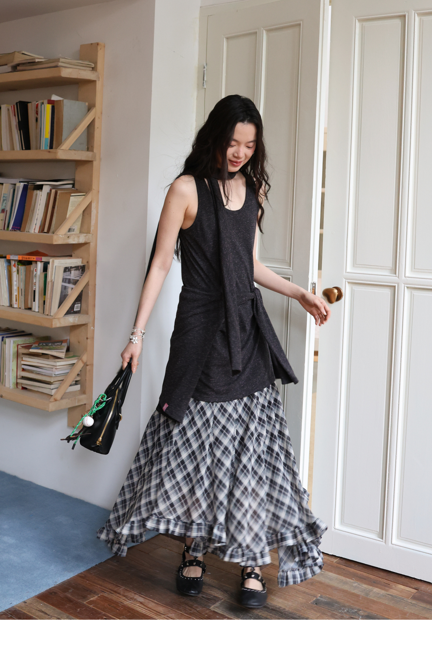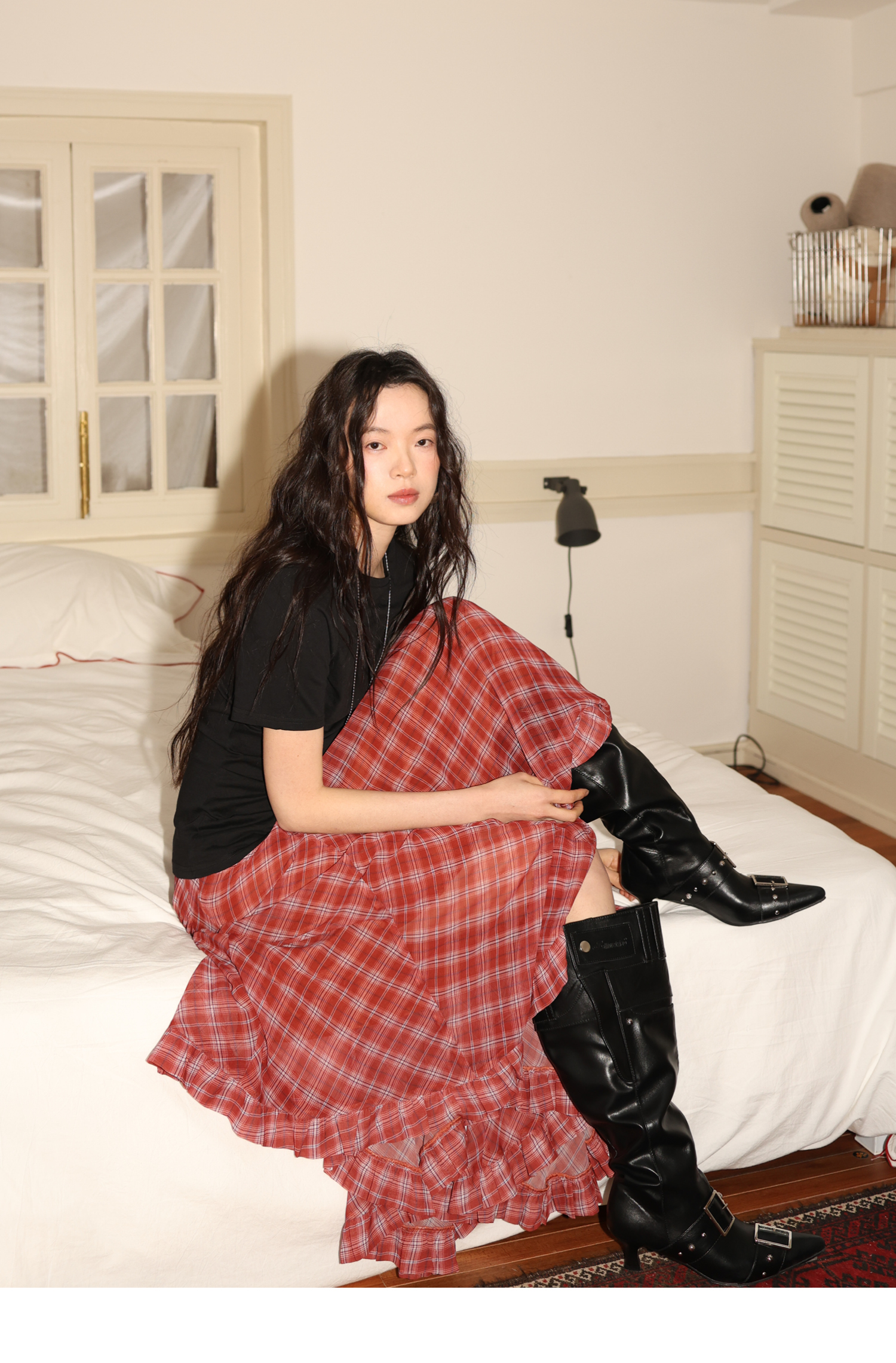 素舶 复古两色格纹中腰不规则木耳边下摆中长雪纺半裙