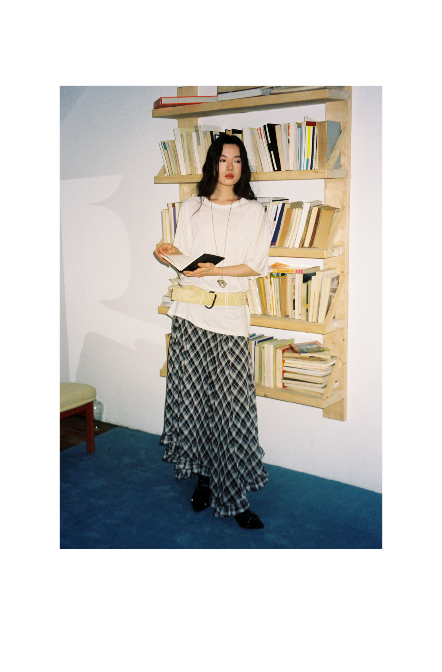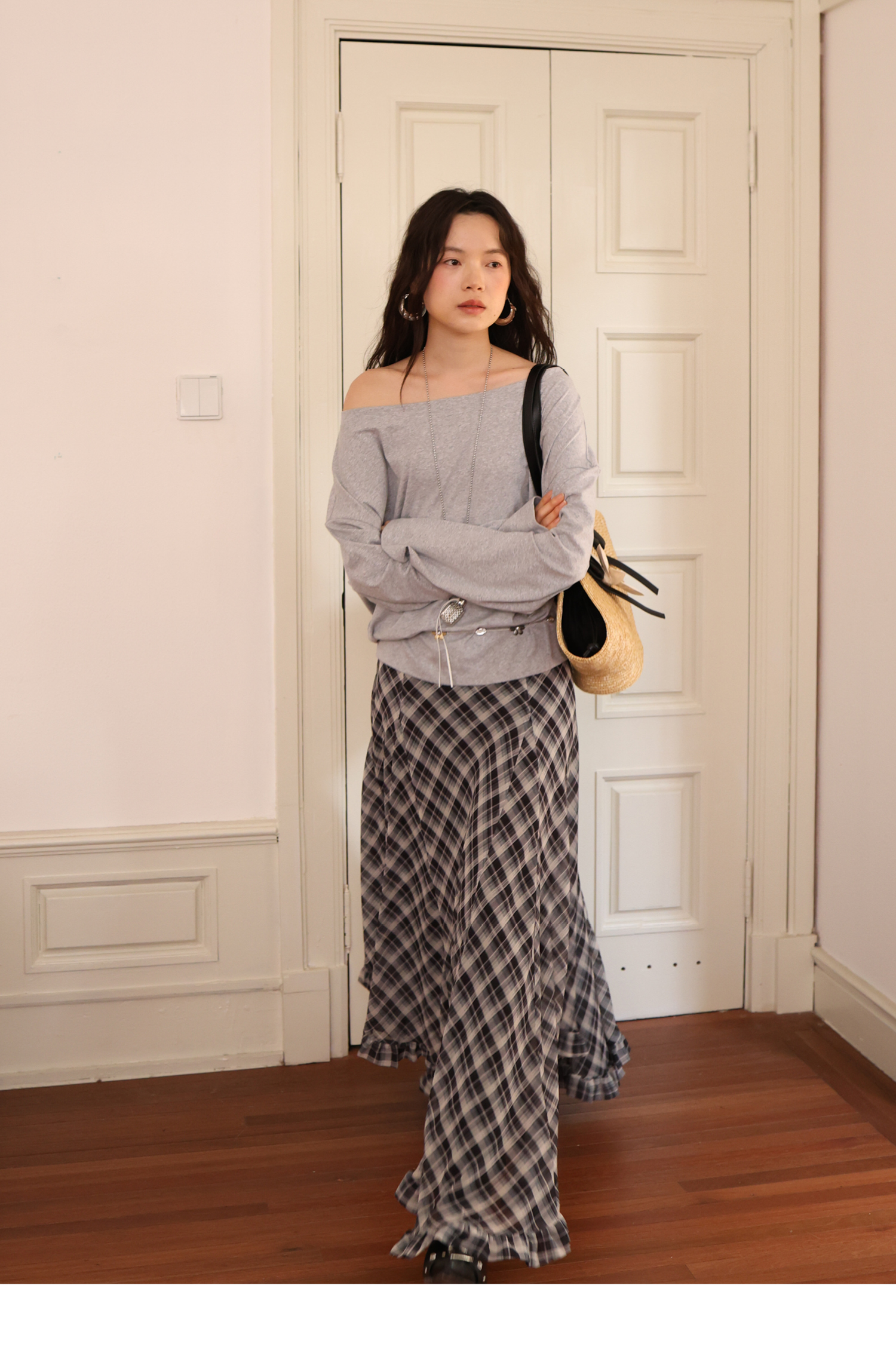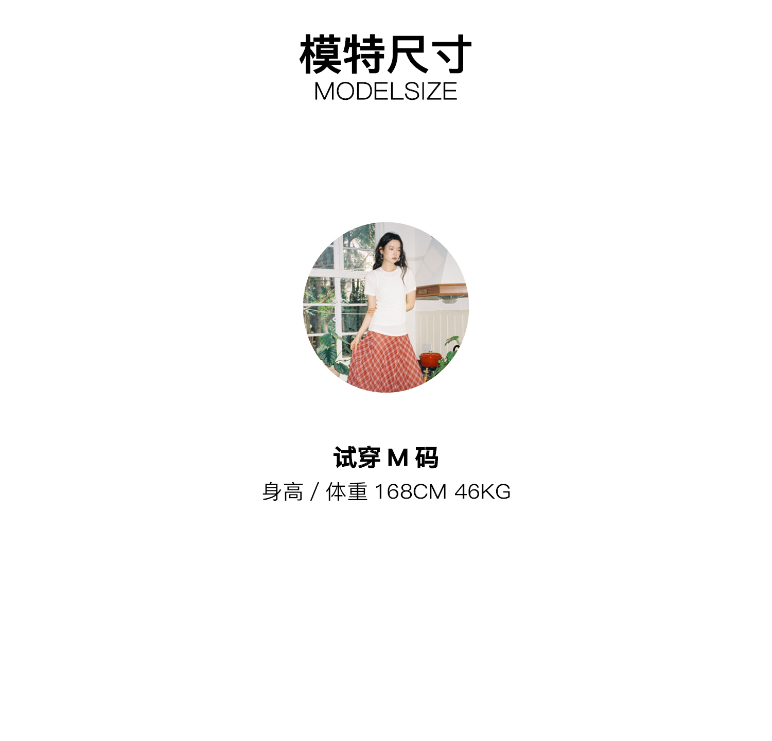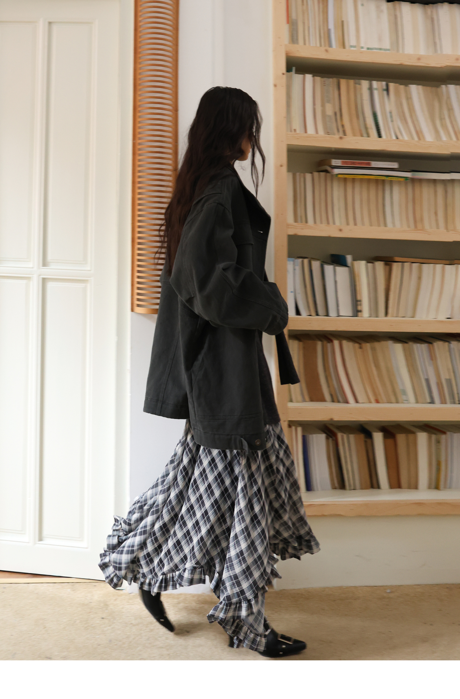 素舶 复古两色格纹中腰不规则木耳边下摆中长雪纺半裙