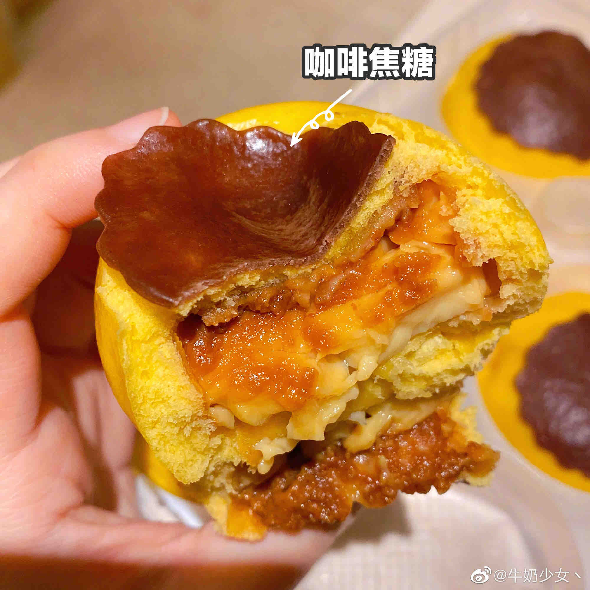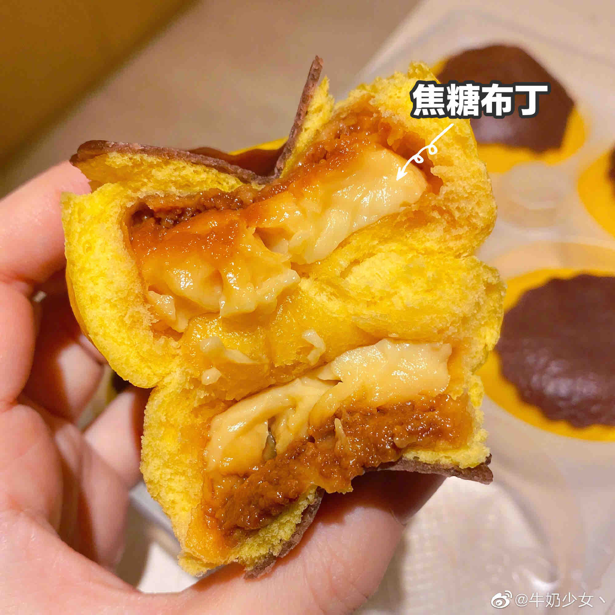 配料表:小麦粉、水、淡奶油、白砂糖、纯牛奶、蛋黄液、猪油、食品添加剂(泡打粉、可得然凝胶G、β-胡萝卜素粉剂)、谷朊粉、干酵母、焦糖膏C(炼乳、麦芽糖浆、鲜奶油、白砂糖、水、食品添加剂(柠檬酸钠))、食盐、可可粉