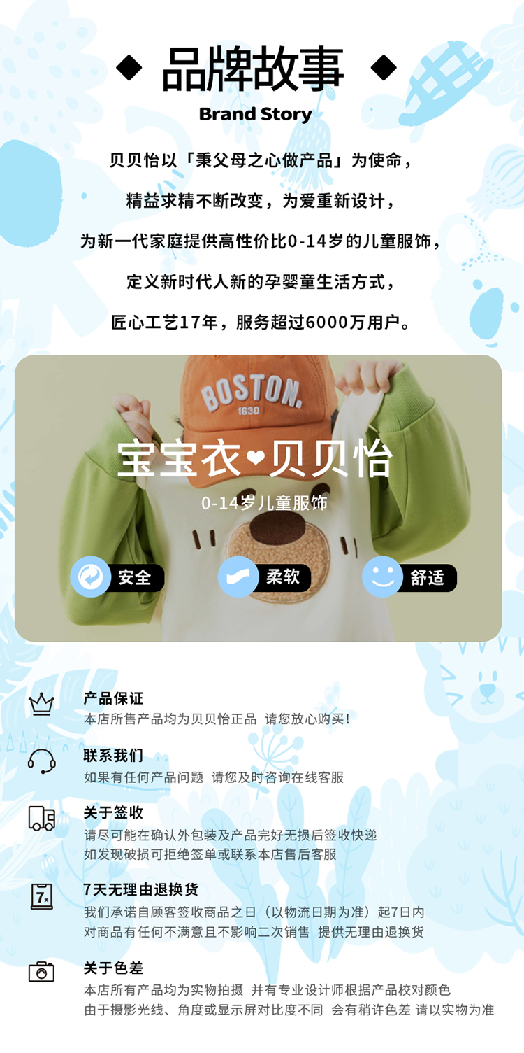 - 贝贝怡专注0-6岁婴幼儿服饰,坚持安全、柔软、舒适的产品理念,为千万中国家庭提供超高品质、安全可靠的婴幼儿服饰产品,妈妈放心,宝宝开心!