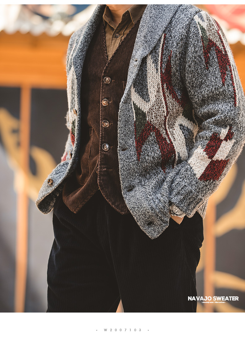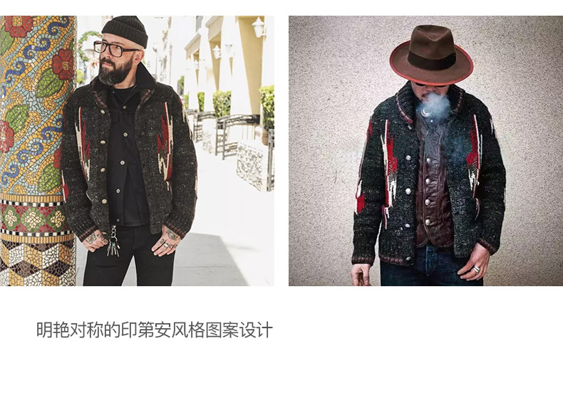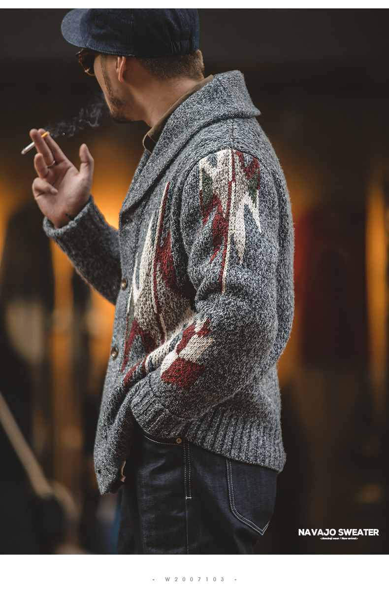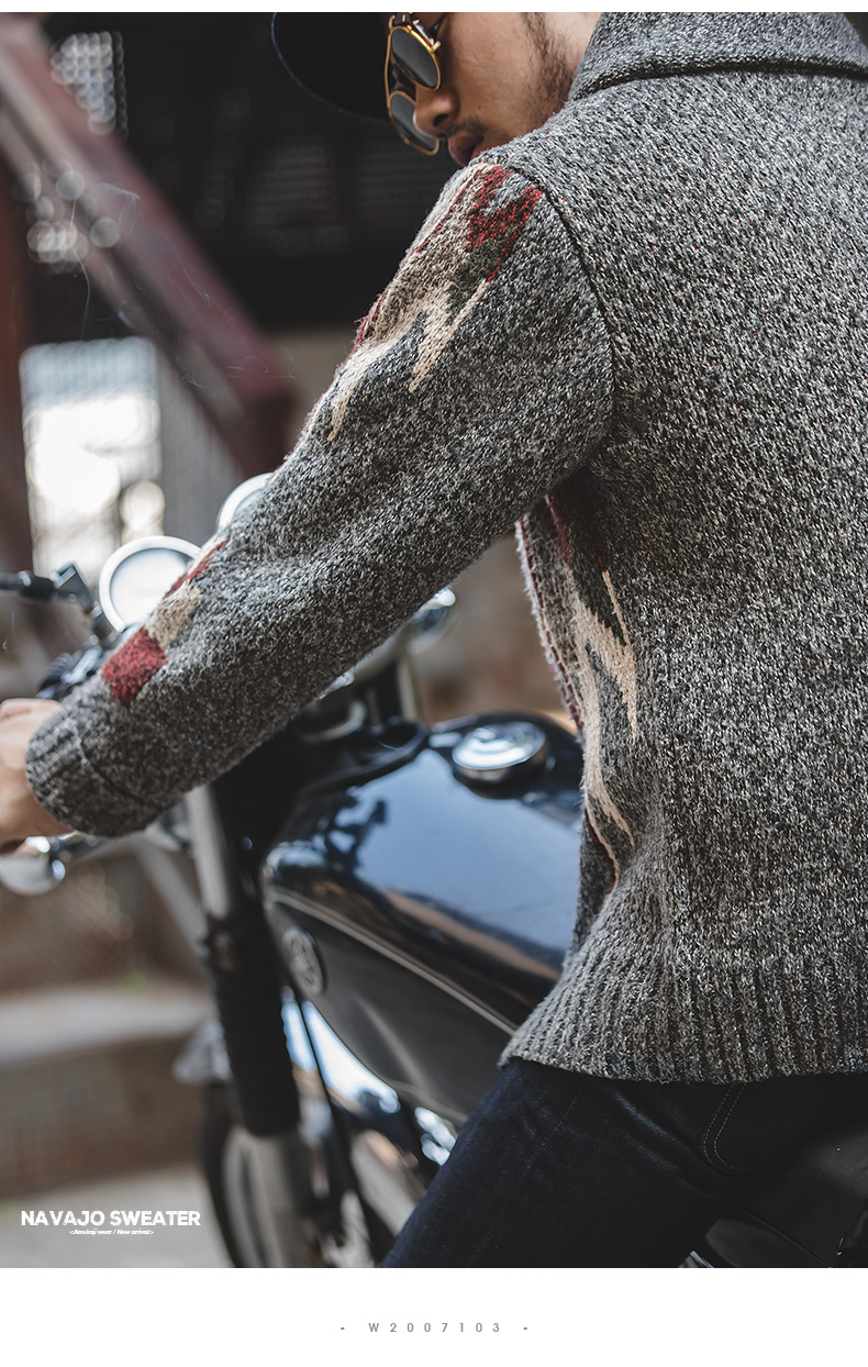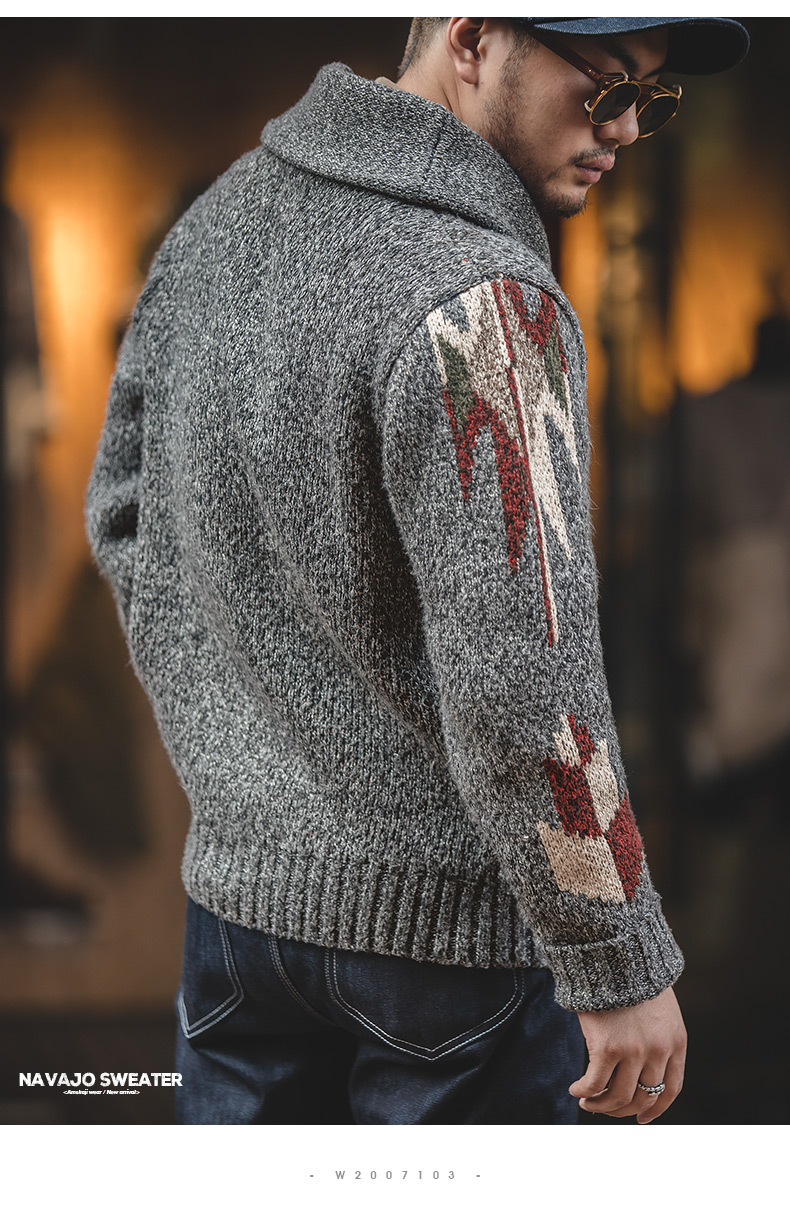 工装优选 美式复古印第安纳瓦霍开衫毛衣青果领加厚针织衫外套男潮