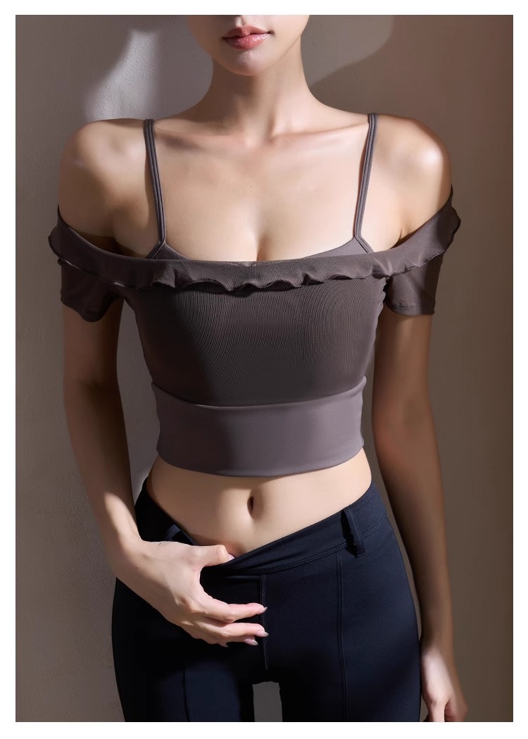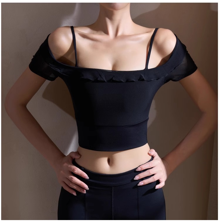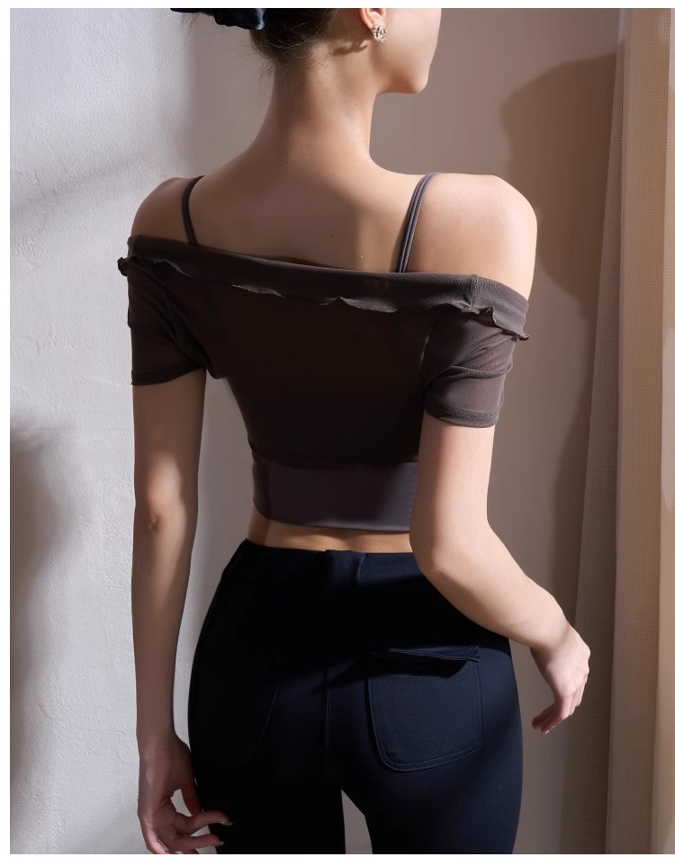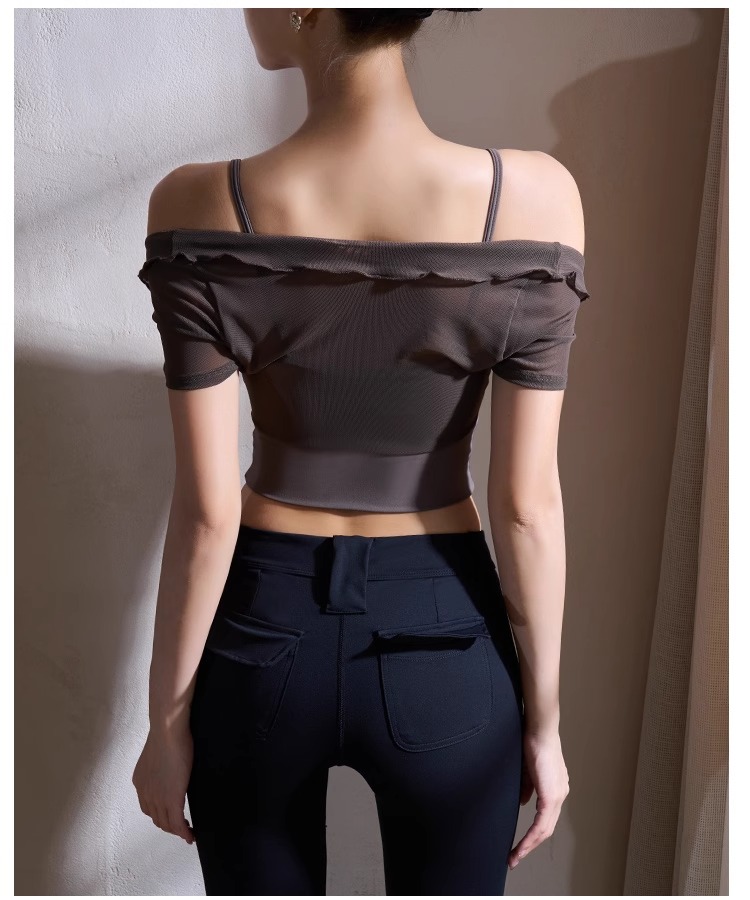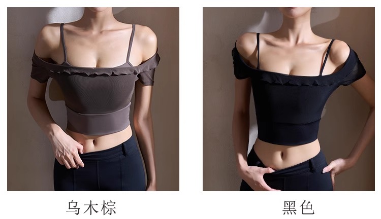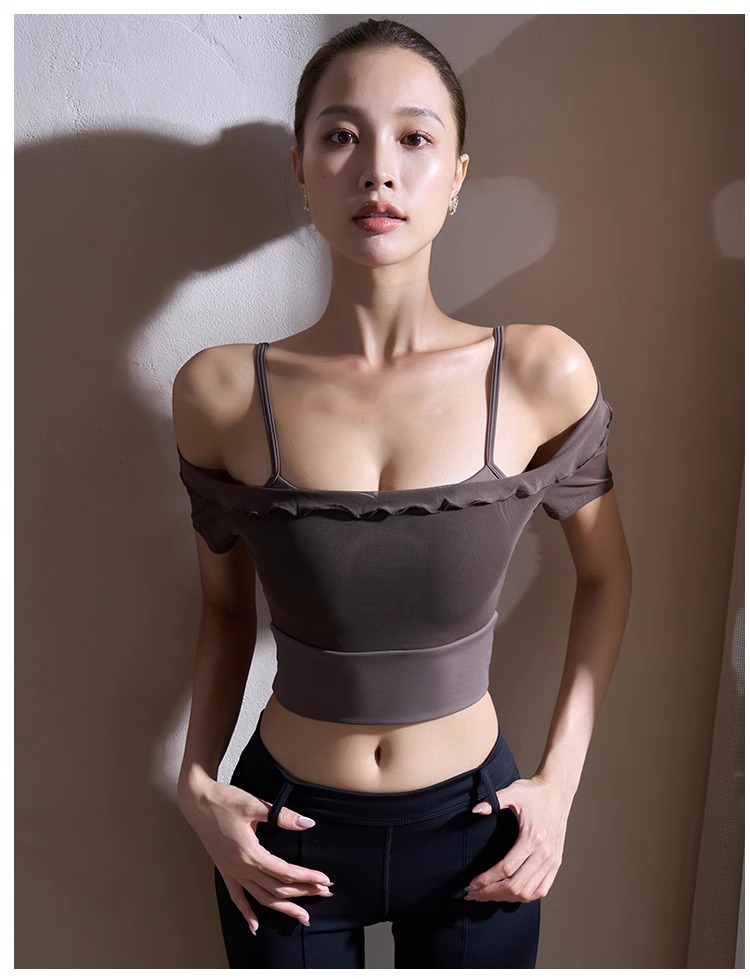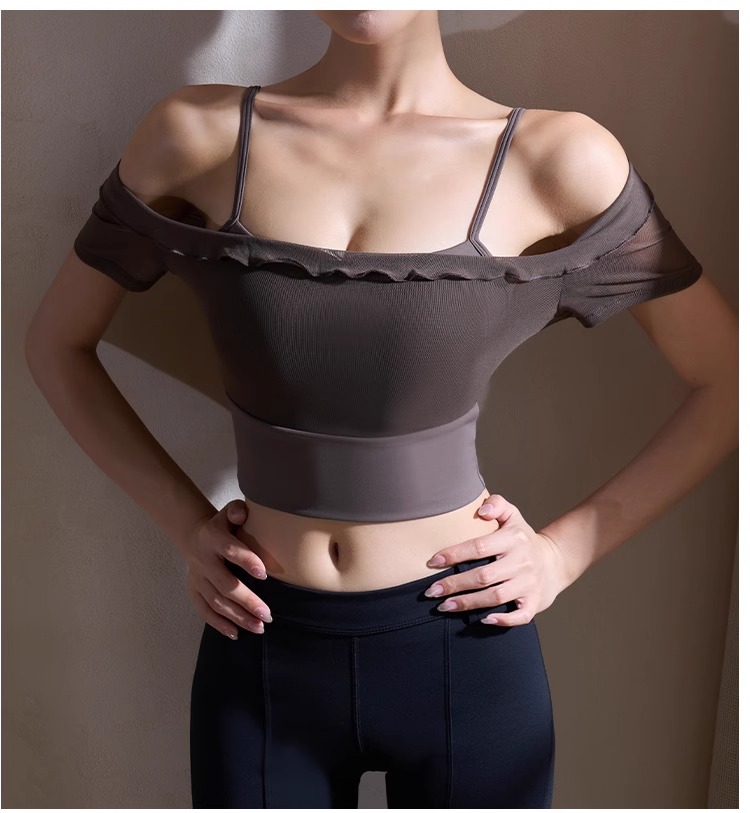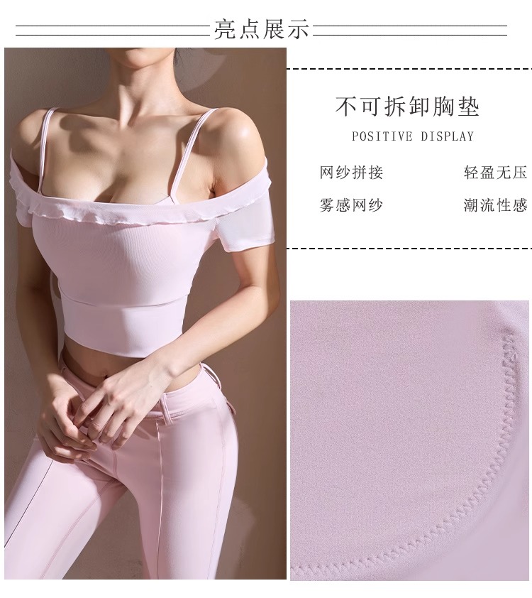 跃牌【禅语梵心】纯欲风花边网纱瑜伽服短袖带胸垫跑步运动文胸一体杯健身服DX5440