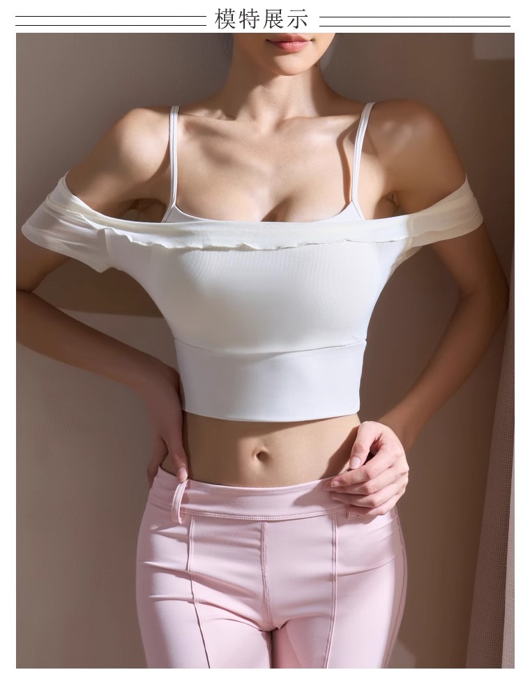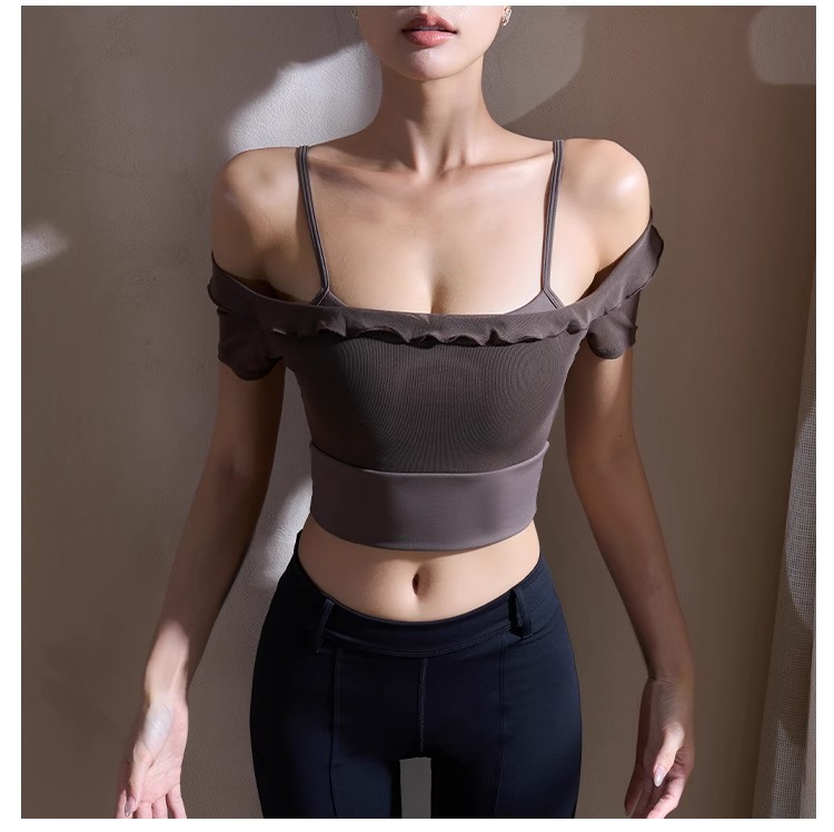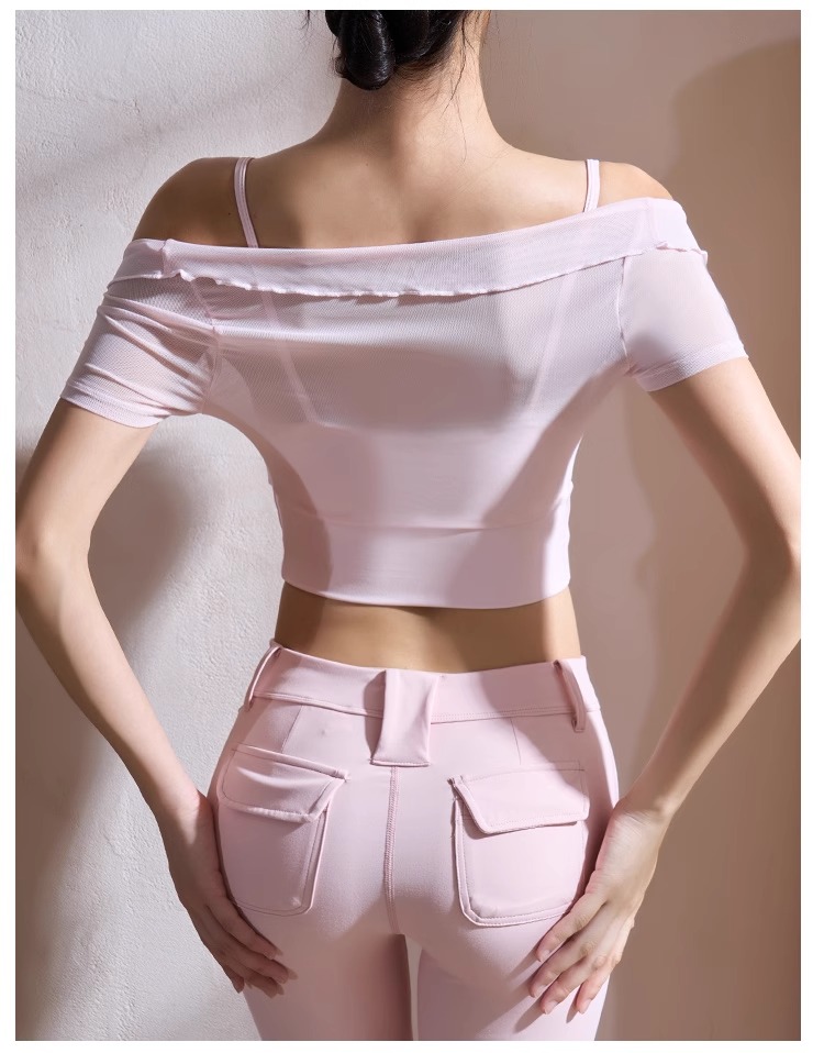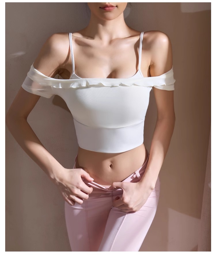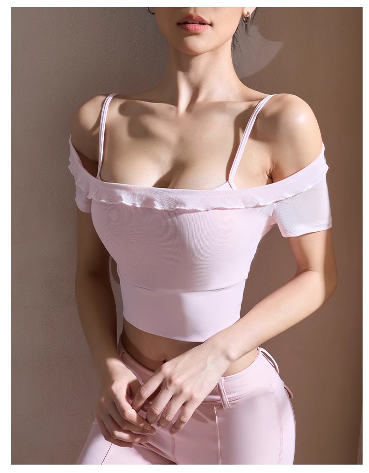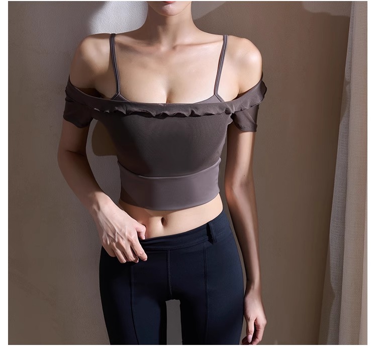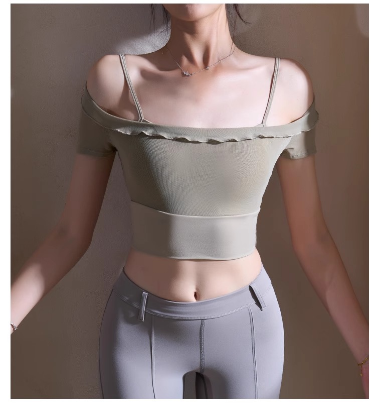 跃牌【禅语梵心】纯欲风花边网纱瑜伽服短袖带胸垫跑步运动文胸一体杯健身服DX5440