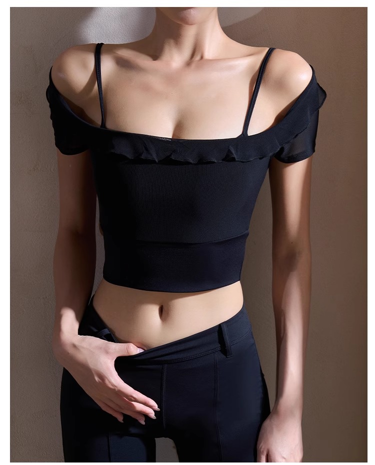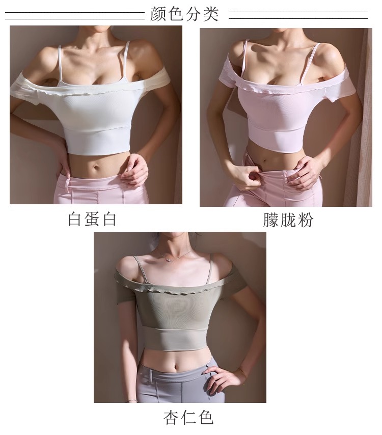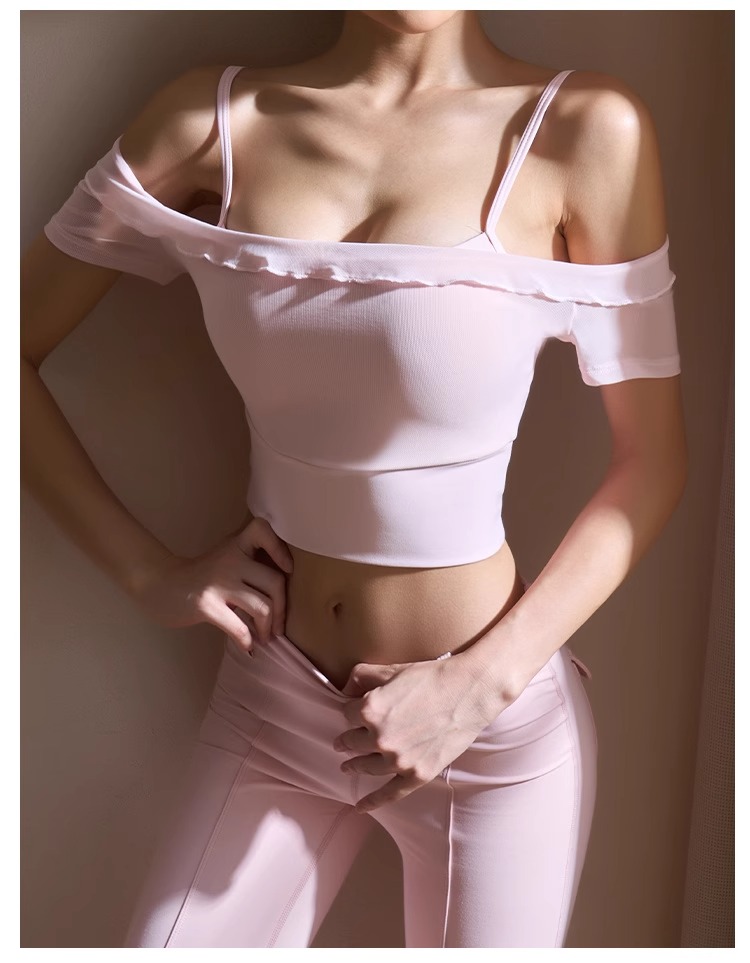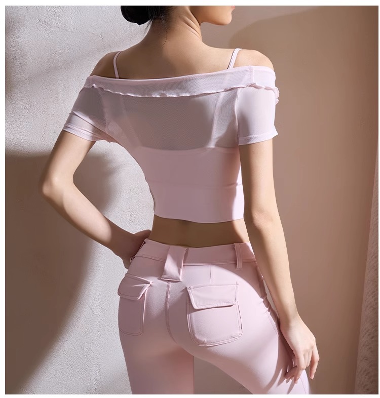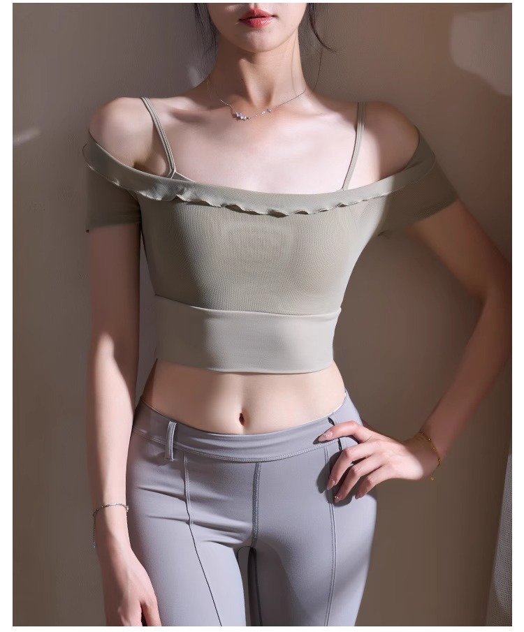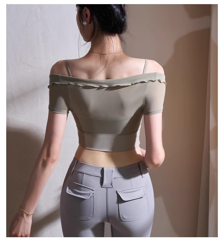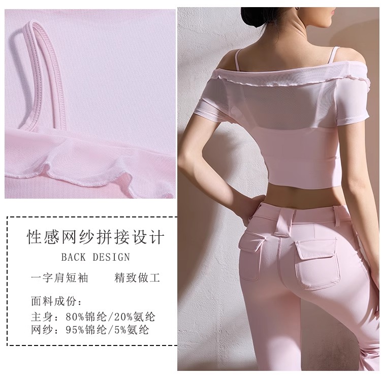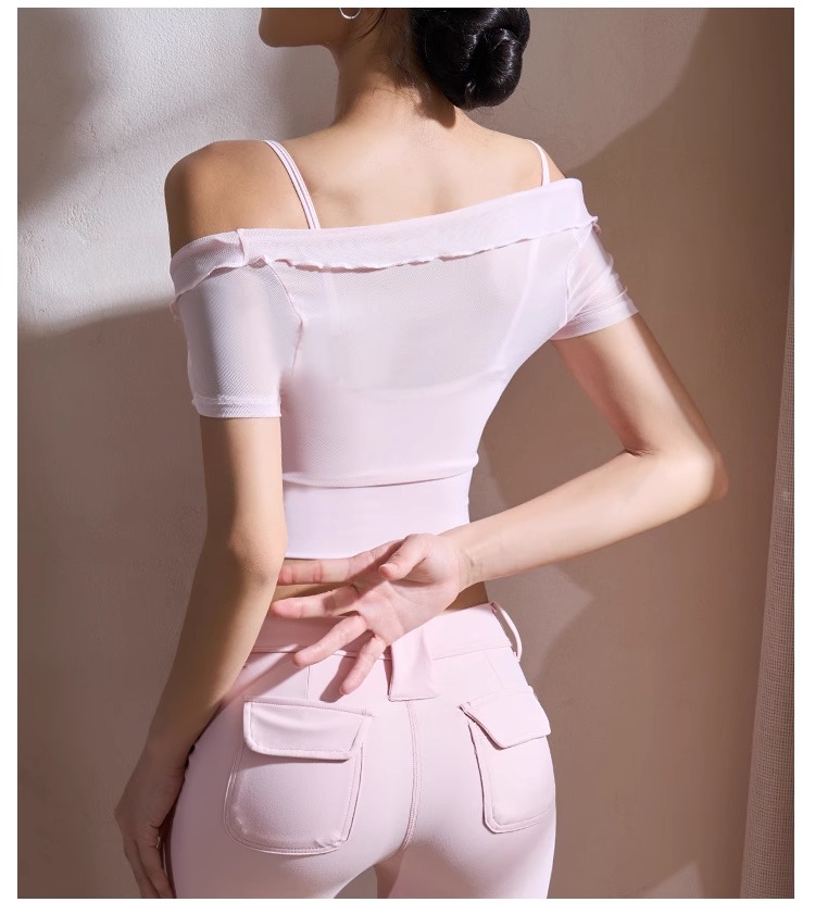 跃牌【禅语梵心】纯欲风花边网纱瑜伽服短袖带胸垫跑步运动文胸一体杯健身服DX5440