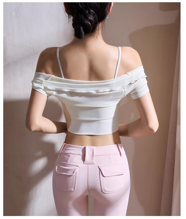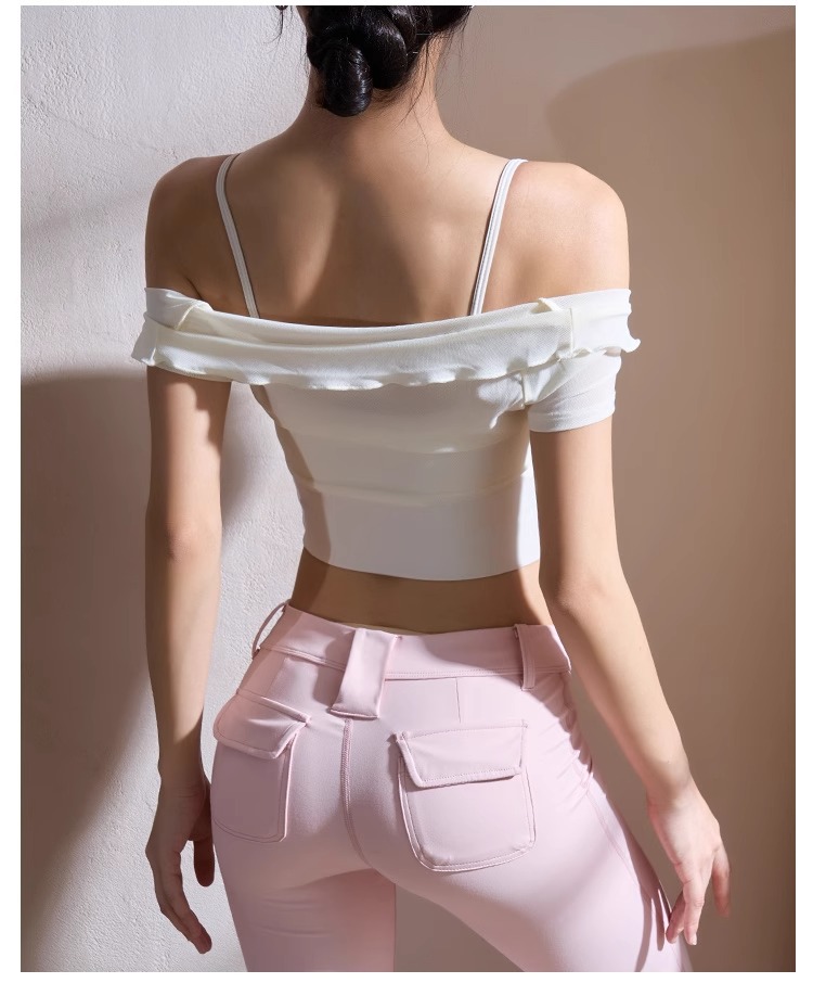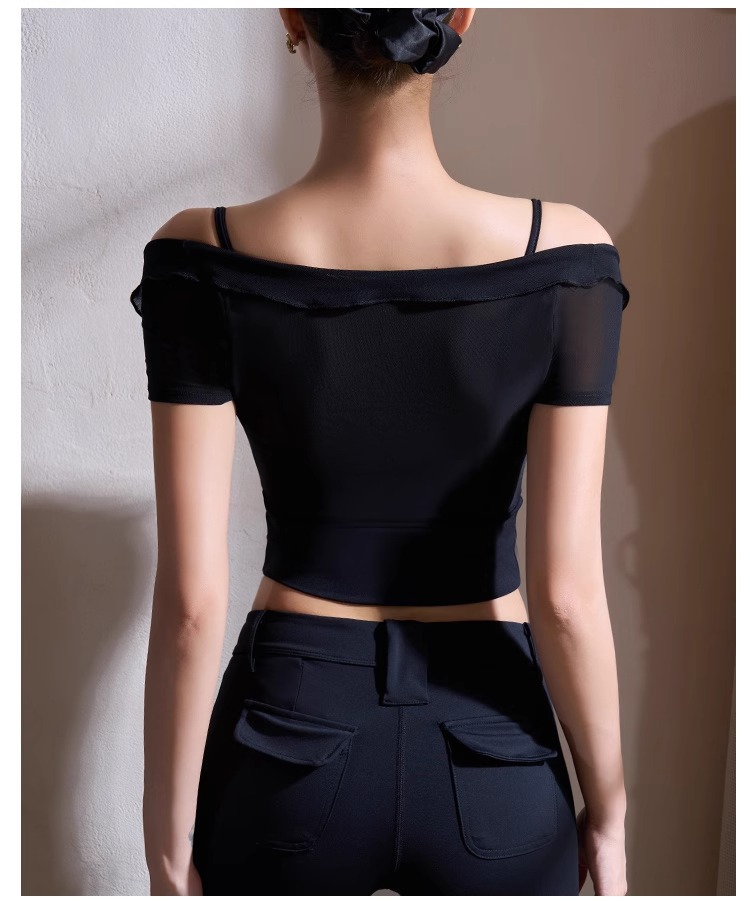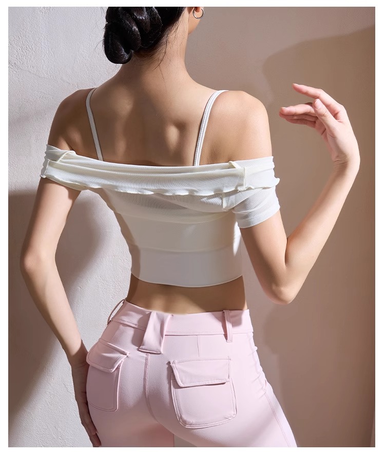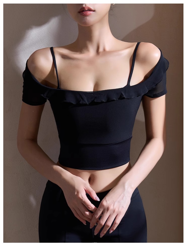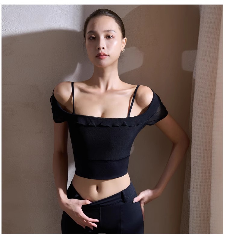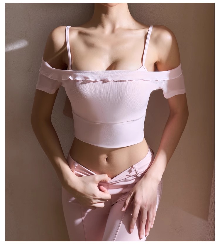 跃牌【禅语梵心】纯欲风花边网纱瑜伽服短袖带胸垫跑步运动文胸一体杯健身服DX5440