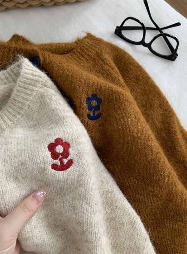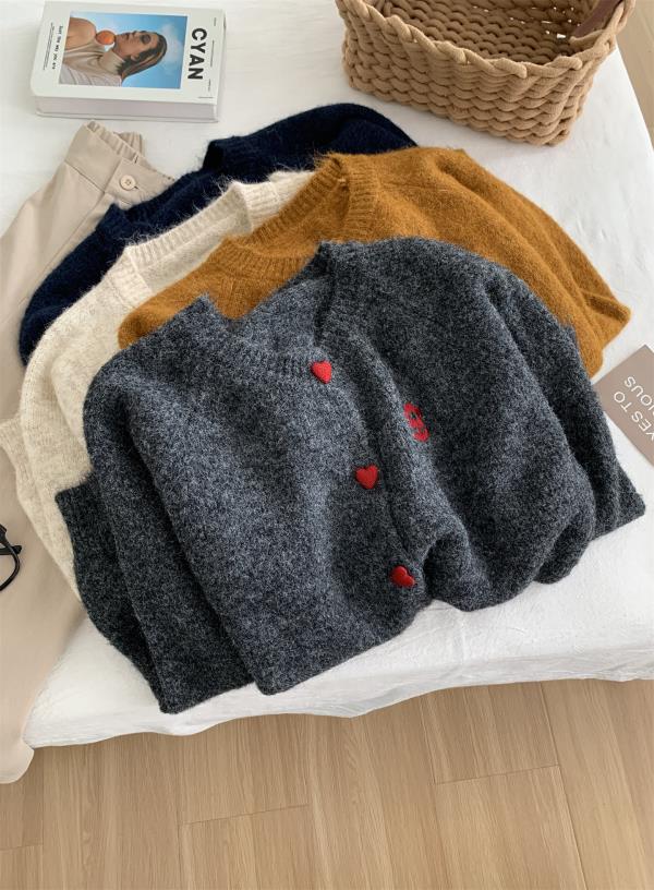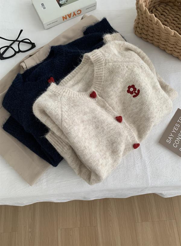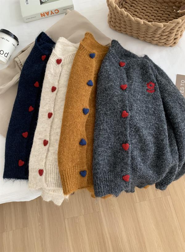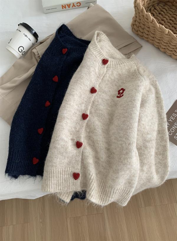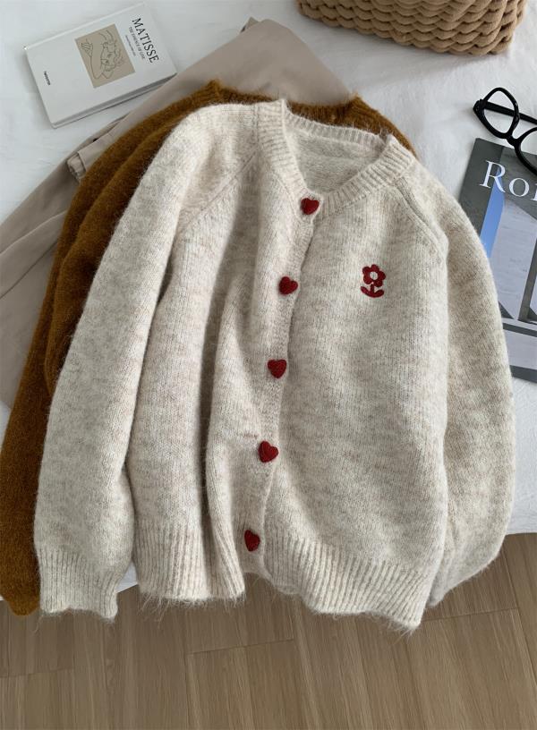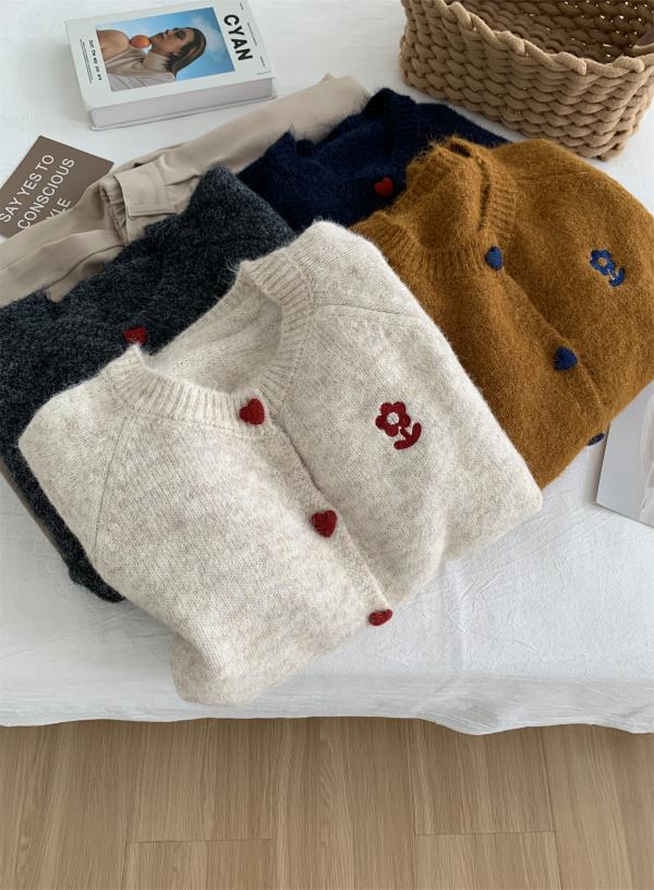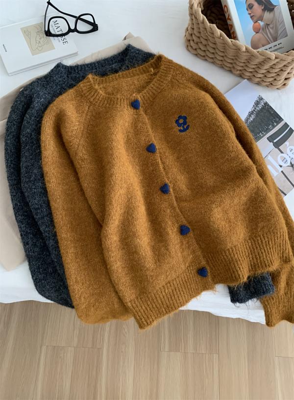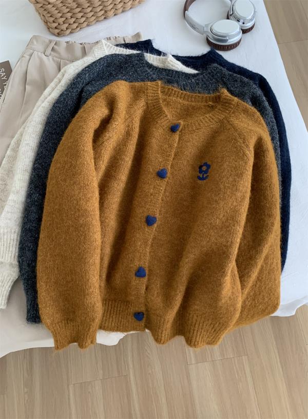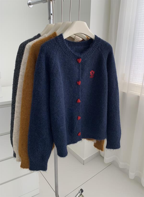 洋气复古爱心扣圆领毛衣针织开衫女!2025秋冬韩系刺绣上衣毛衣外套!