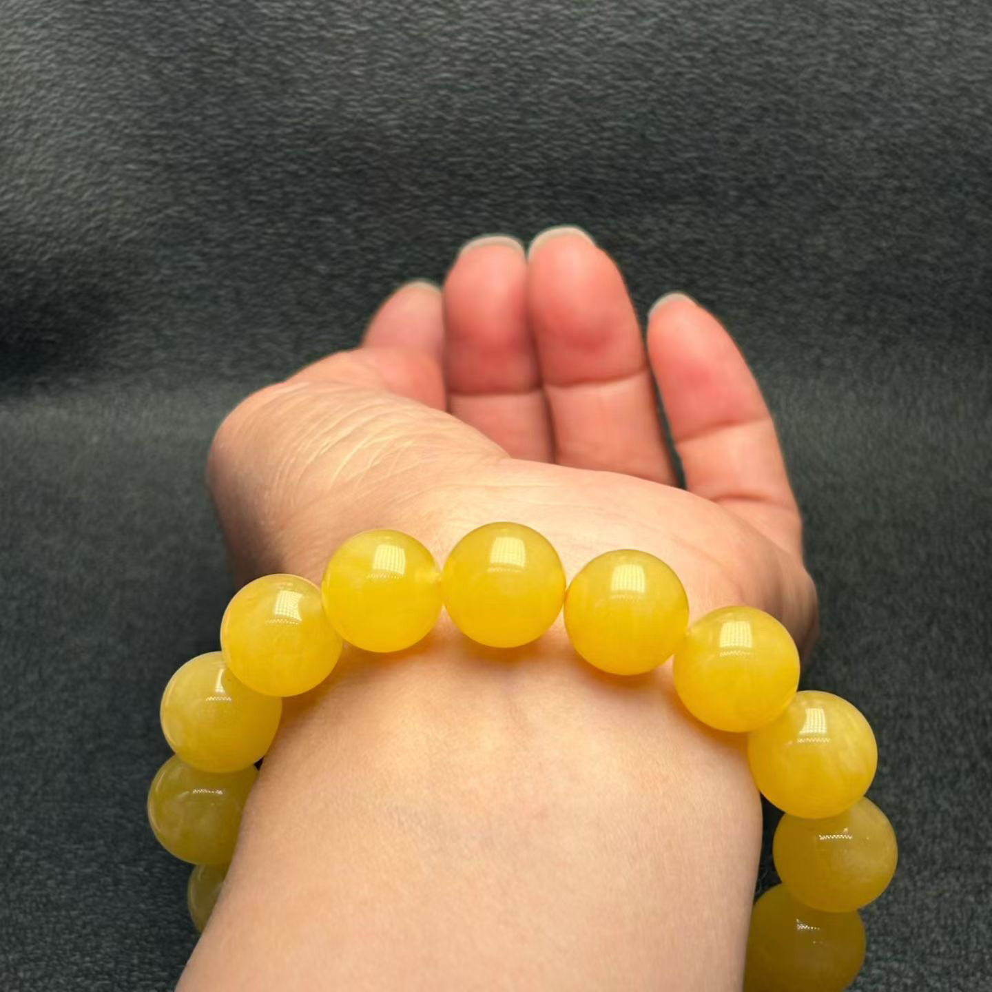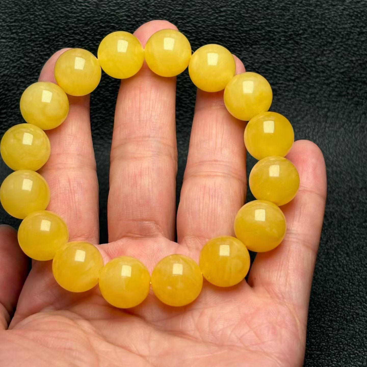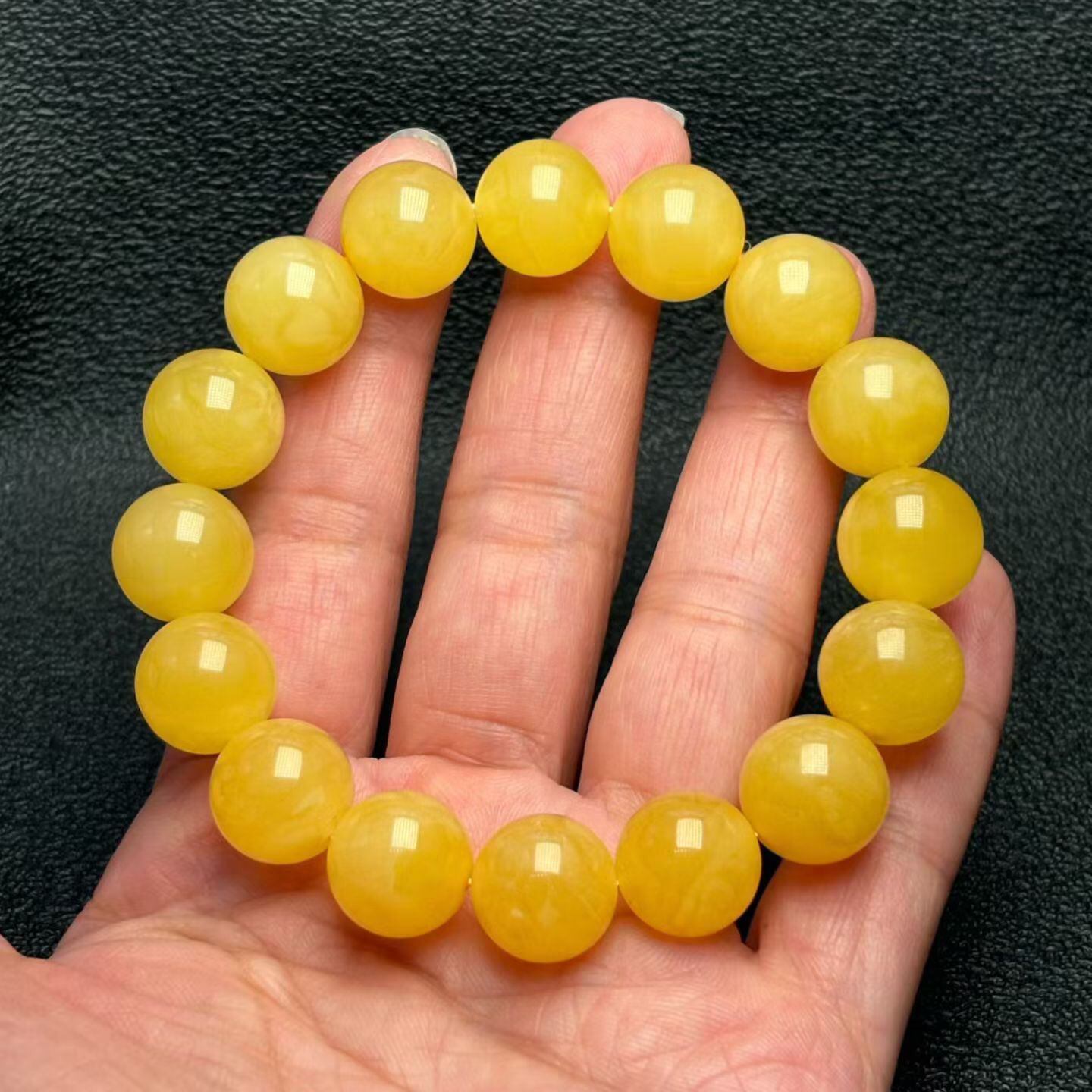 鸡油黄蜜蜡单圈手串,蜡质浓郁醇厚,色泽均匀靓丽,尺寸13.5mm,佩戴精致好看!