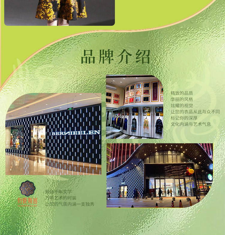 行业首家从事文创研发的女装品牌-伯妮斯茵 品牌风格:源自千年文学和万年艺术的时装,让你的气质内涵一枝独秀,精彩的品质,华丽的风格,炫耀的视觉,让你的衣品从此与众不同,标记你深厚的文化内涵与艺术气息。