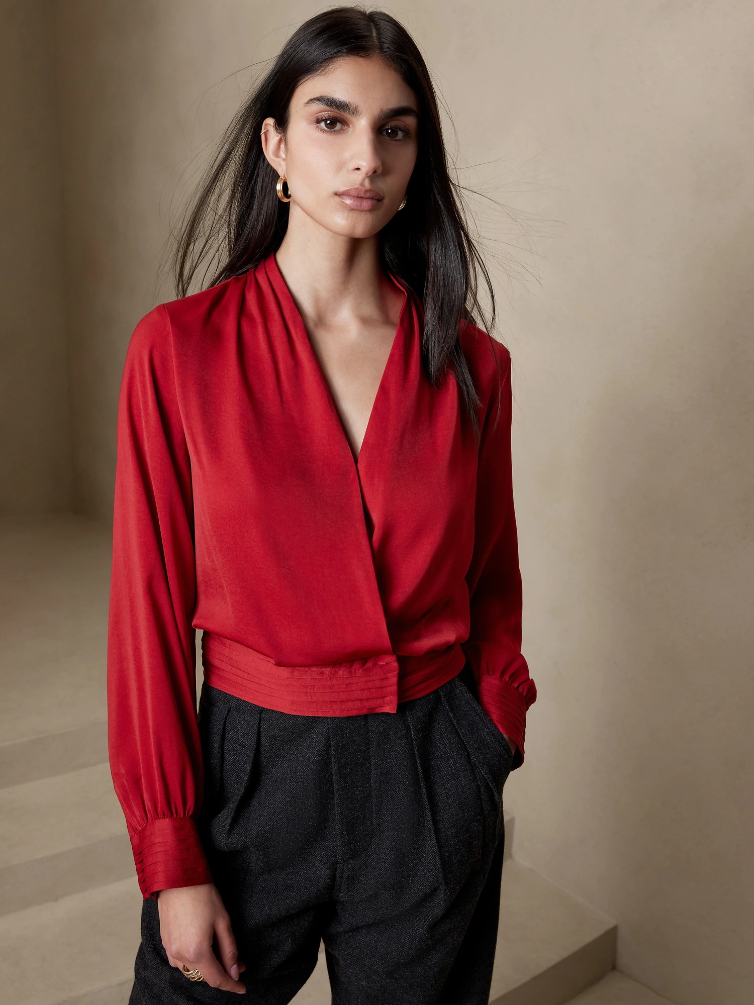 ¥299到手!BR香蕉共和国 新款设计款气质V领上衣 正红色绝绝子4色可选,金色开始断码了。