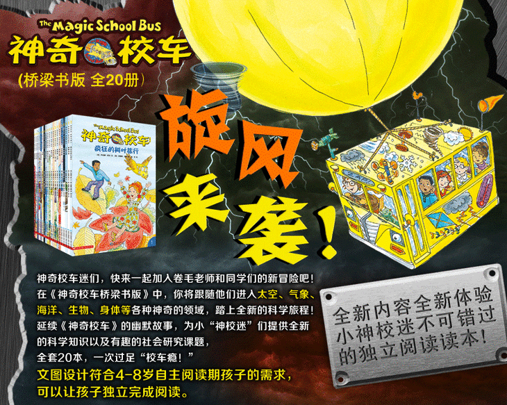 专为4-8岁小神校迷们打造的《神奇校车桥梁书版》,内容包罗万象,涵盖了太空、气象、海洋、植物、动物、地理、身体等各方面的自然科学知识,另外还涉及一些有趣的社会研究课题,如“自由女神的建造过程”、“旧物是如何回收利用的”,知识丰富有趣,并与其他版本不重复。