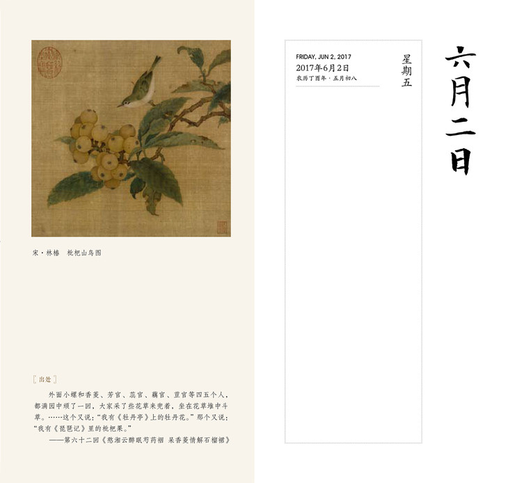 设计细节之美——延续了往年日历的设计风格,保留了三九、三伏天的起始日,阴历、阳历日期、节气、民俗提示,记事栏用以记录当下生活备忘,《红楼梦》当日大事提示等。