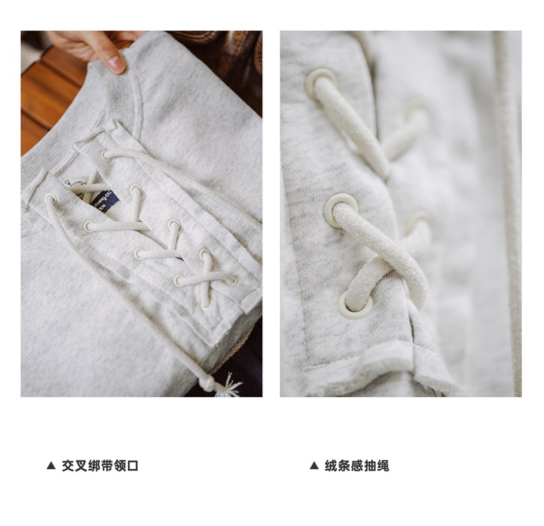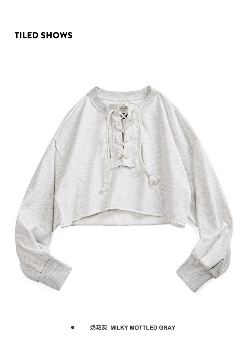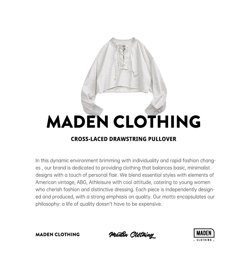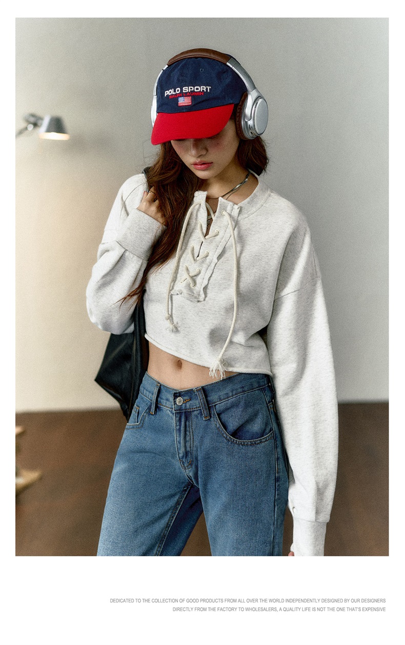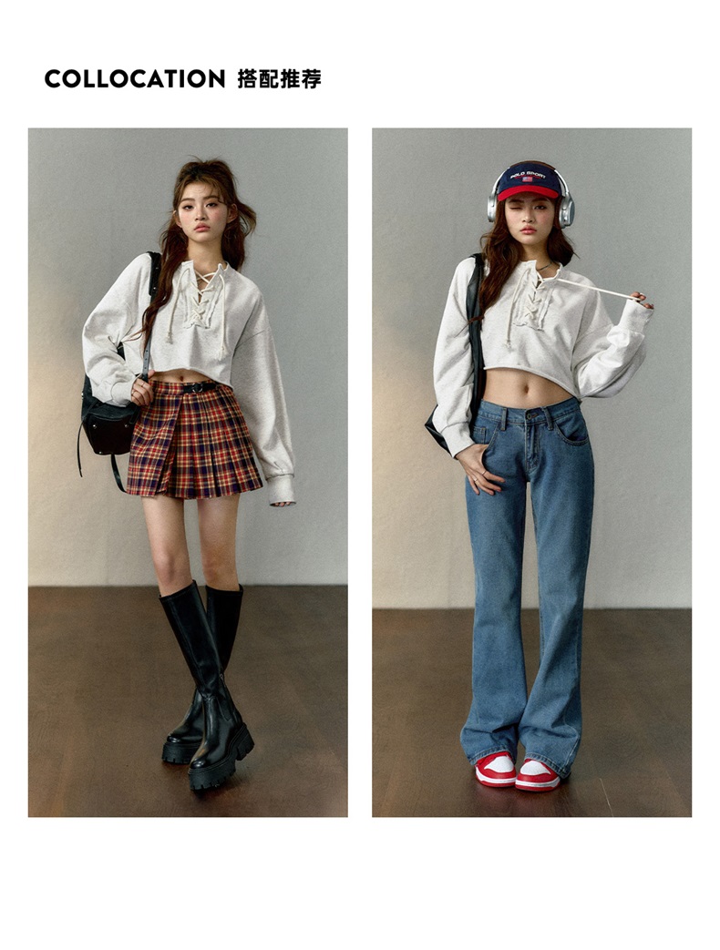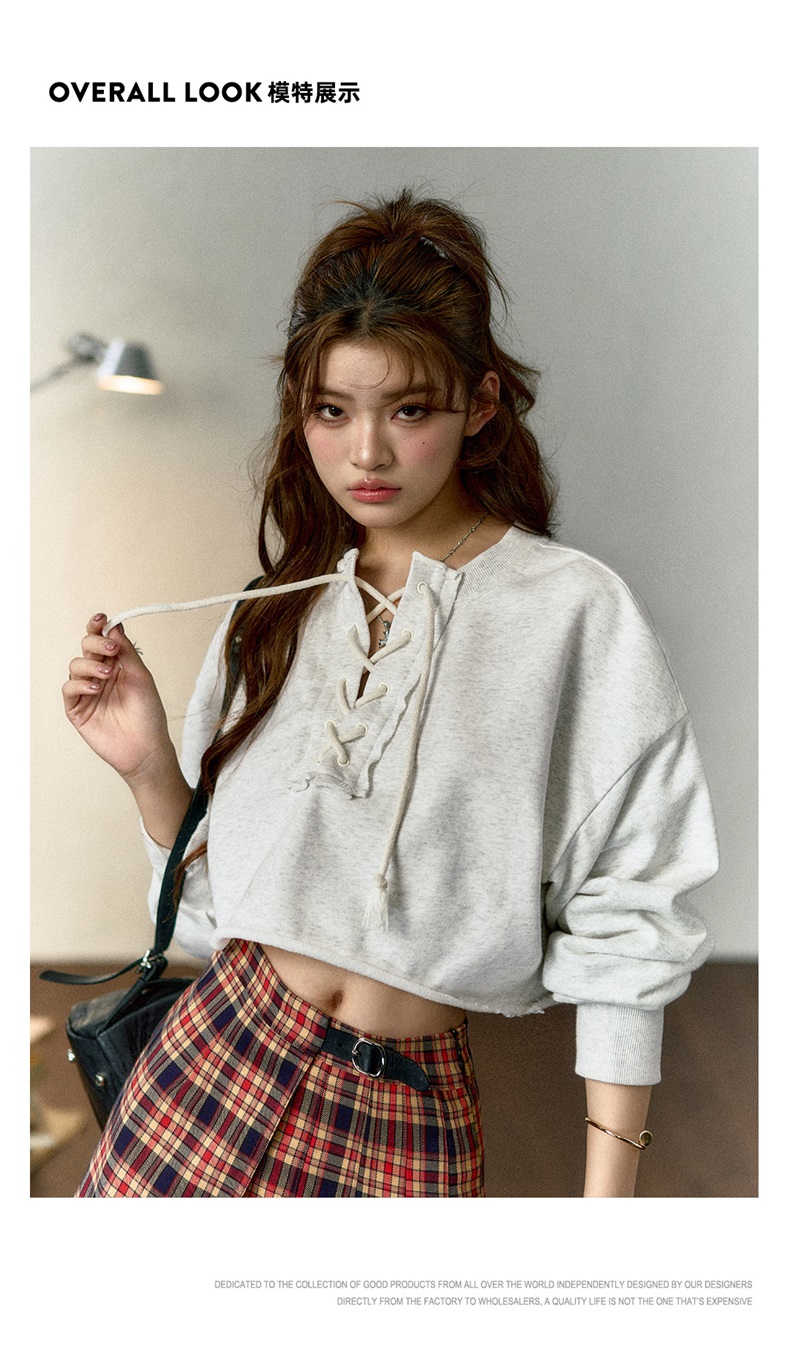 马登高腰短款卫衣春秋抽绳V领休闲宽松长袖甜酷上衣设计感小众女