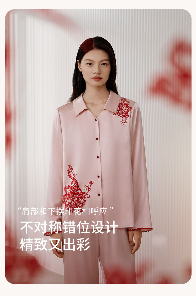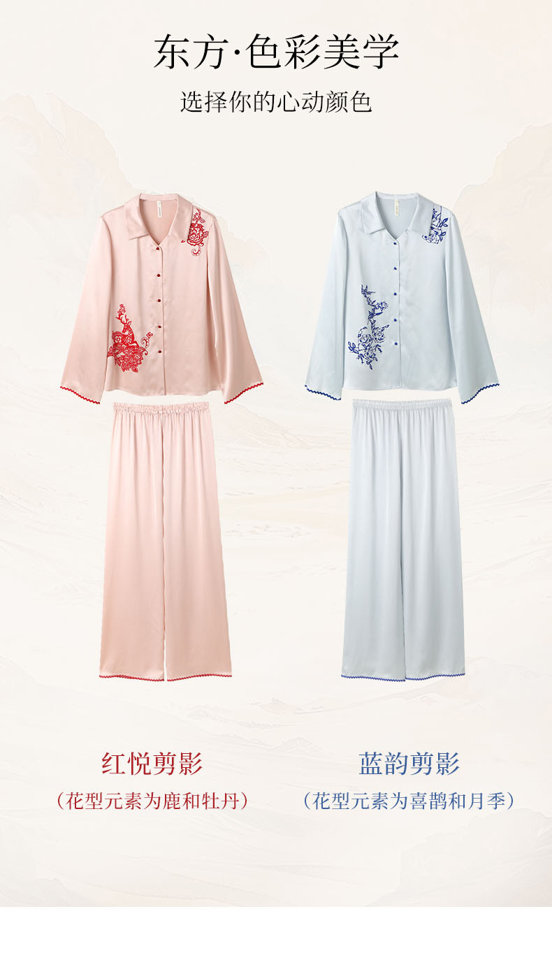 金三塔重磅真丝睡衣女100%桑蚕丝宽松舒适印花衣裤套长袖家居服 YSFFC201