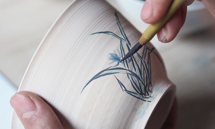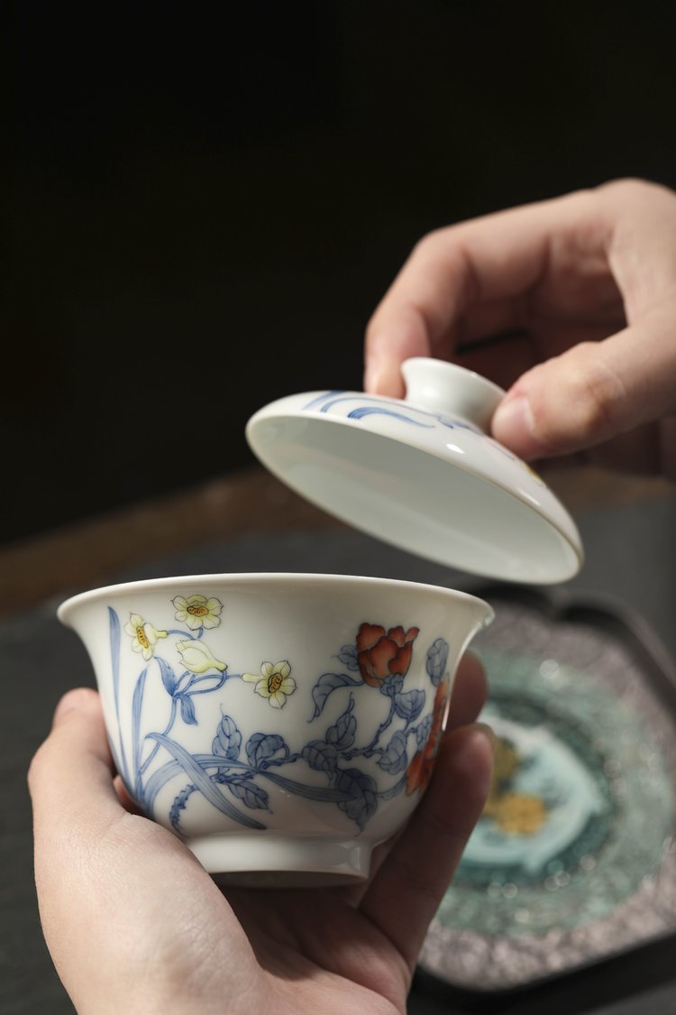 这次奕虹合作的谢浩飞老师自幼学习素描,15岁就跟随老师傅学习花鸟山水,18岁便在仿古瓷领域摸爬滚打积累经验,用20多年磨砺出了精湛的画工,既能仿出高水平的清三代彩瓷,也能沉下心来钻研珠山八友。2016年,选择了青花加彩并作为主攻,短短几年这种釉上、釉下两大工艺板块的成熟,他们的创新力跟产品色彩醒目的感染都得到了很多的认可。