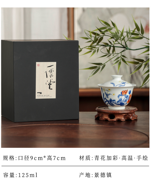 口径9cm*高7cm,容量:125m1 材质:青花加彩·高温·手绘