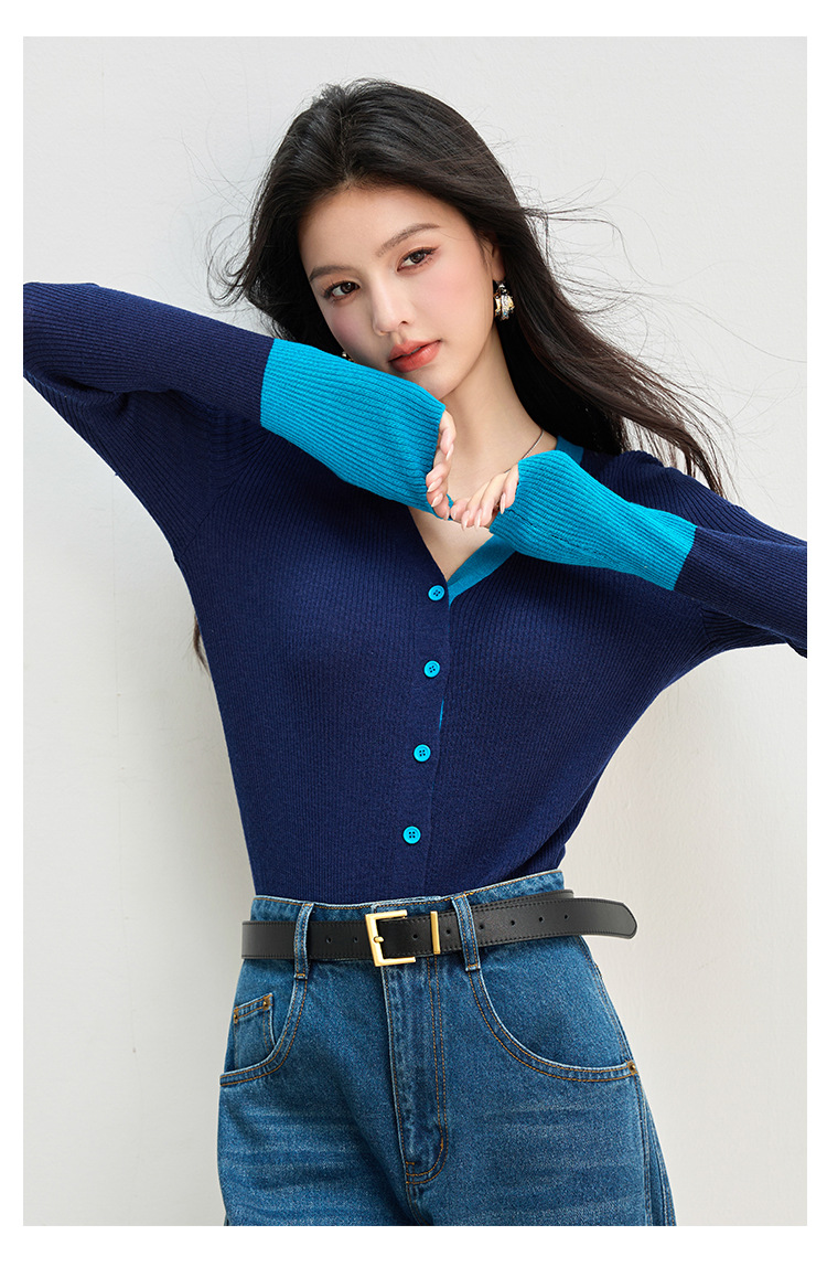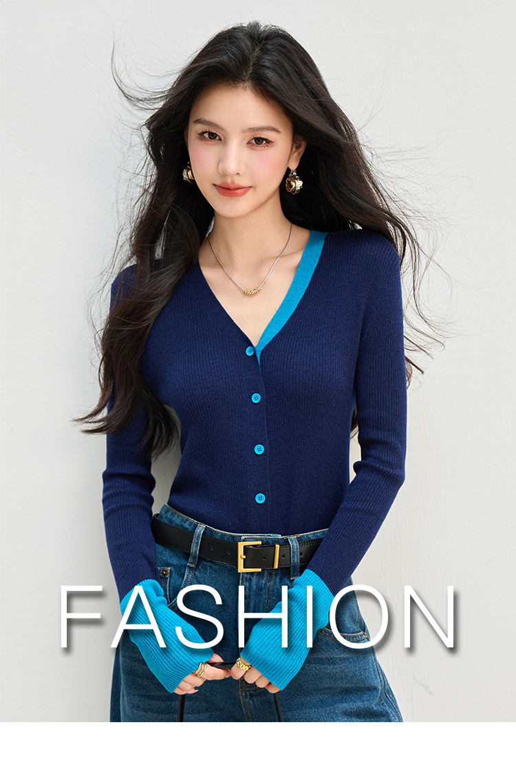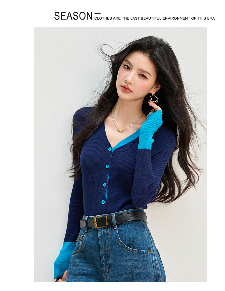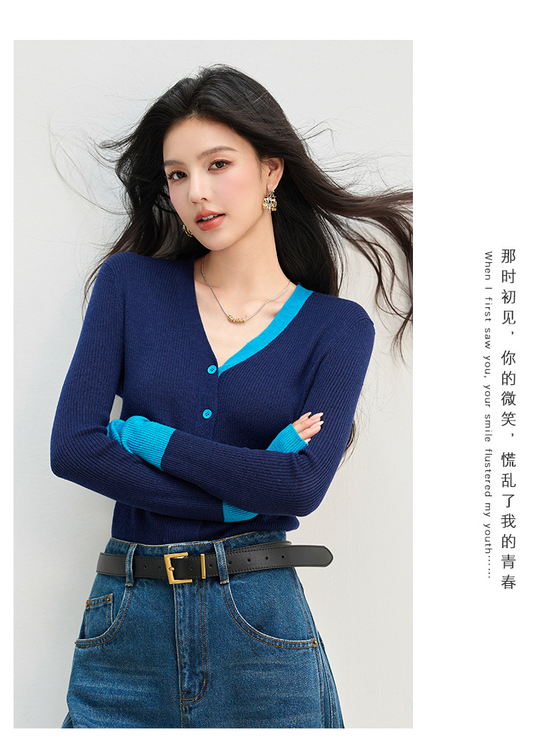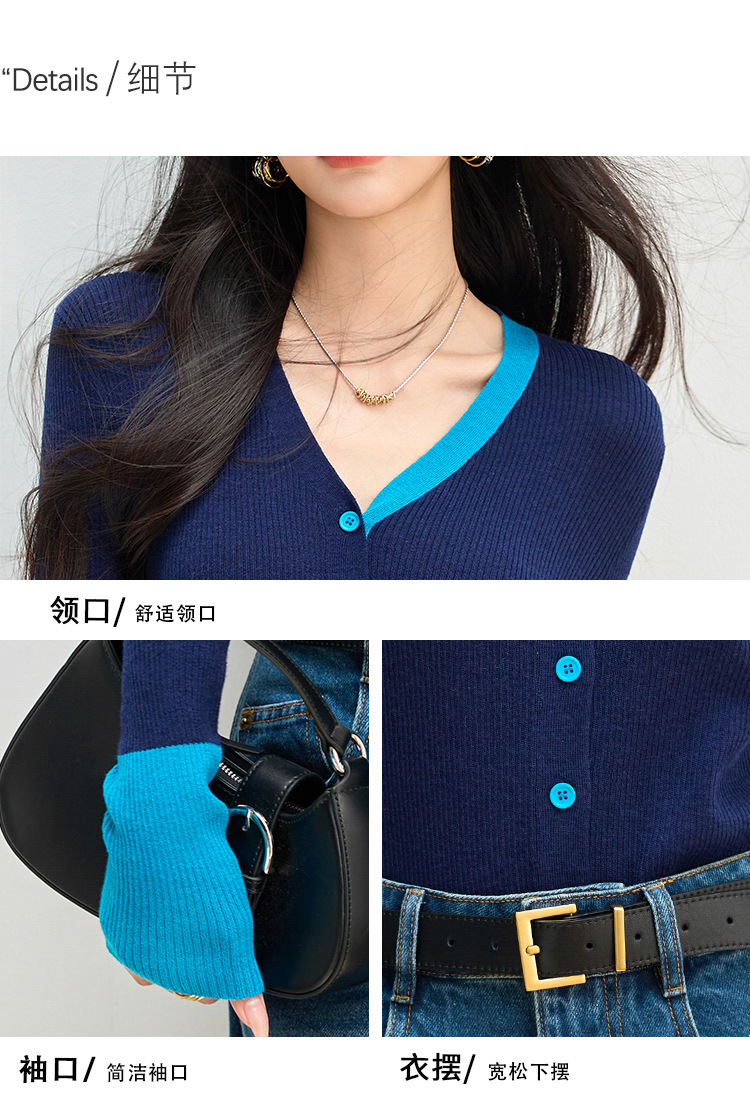 实拍◆有现货◆2025秋季新款时尚撞色拼接条纹V领气质针织衫上衣