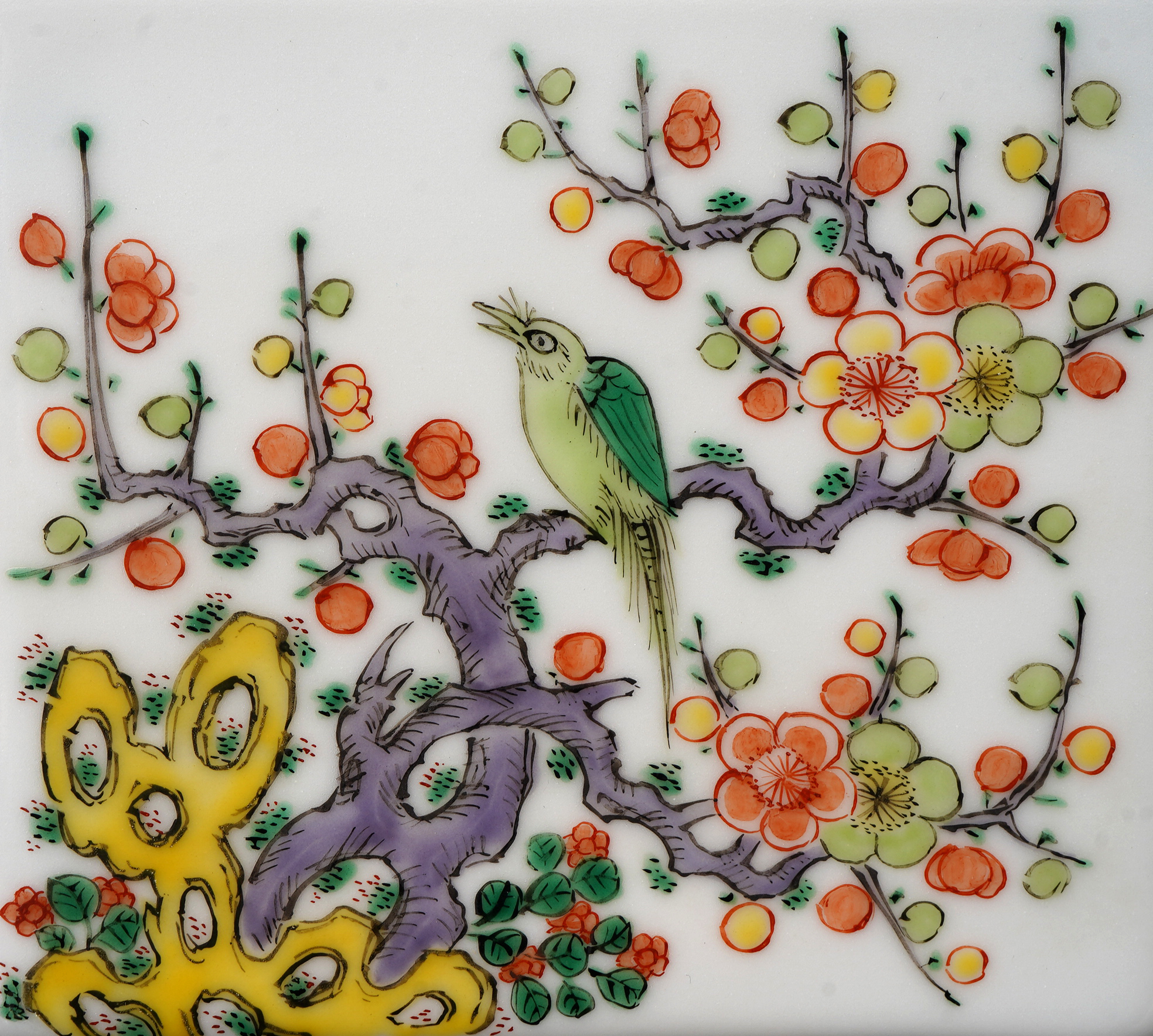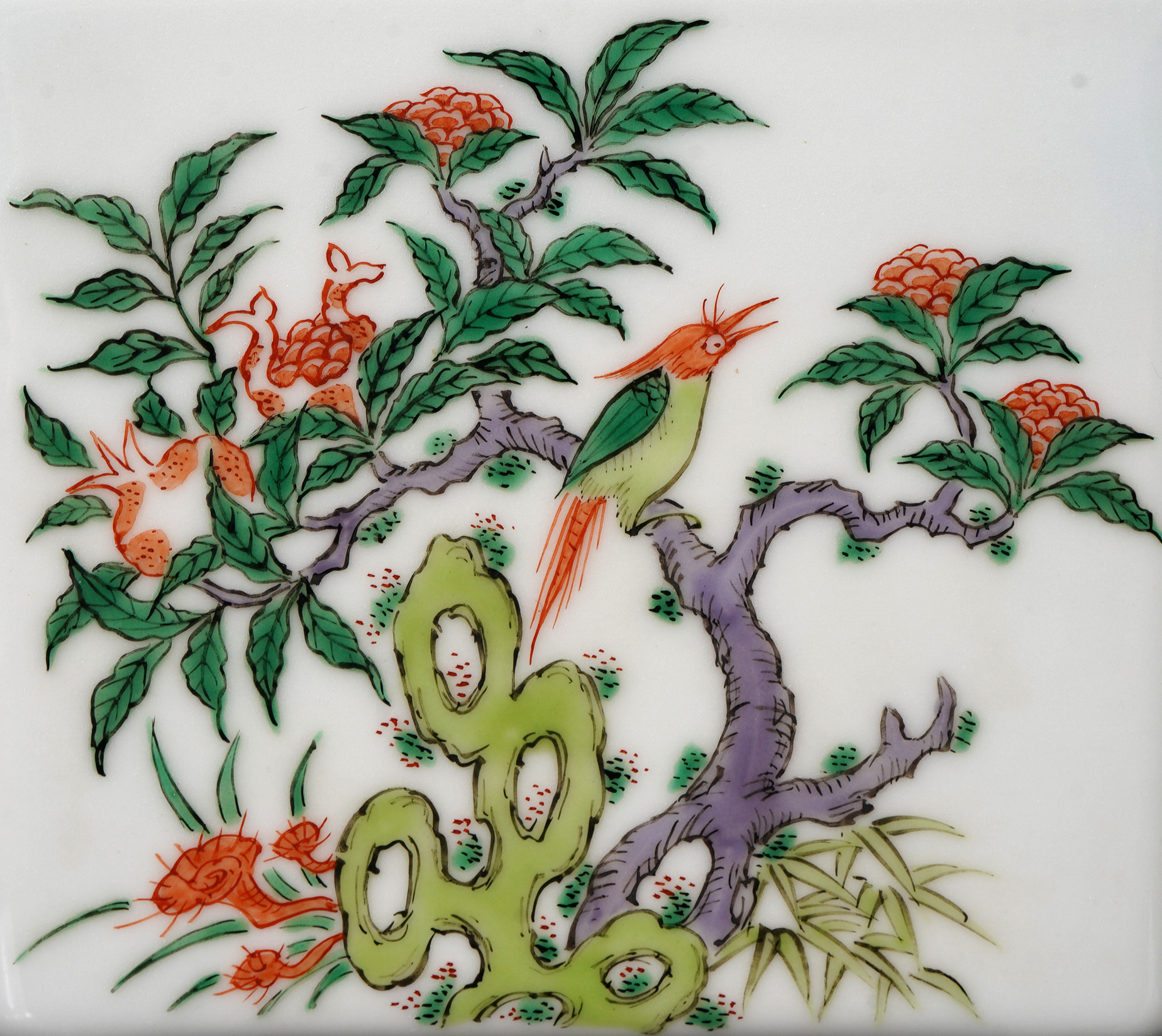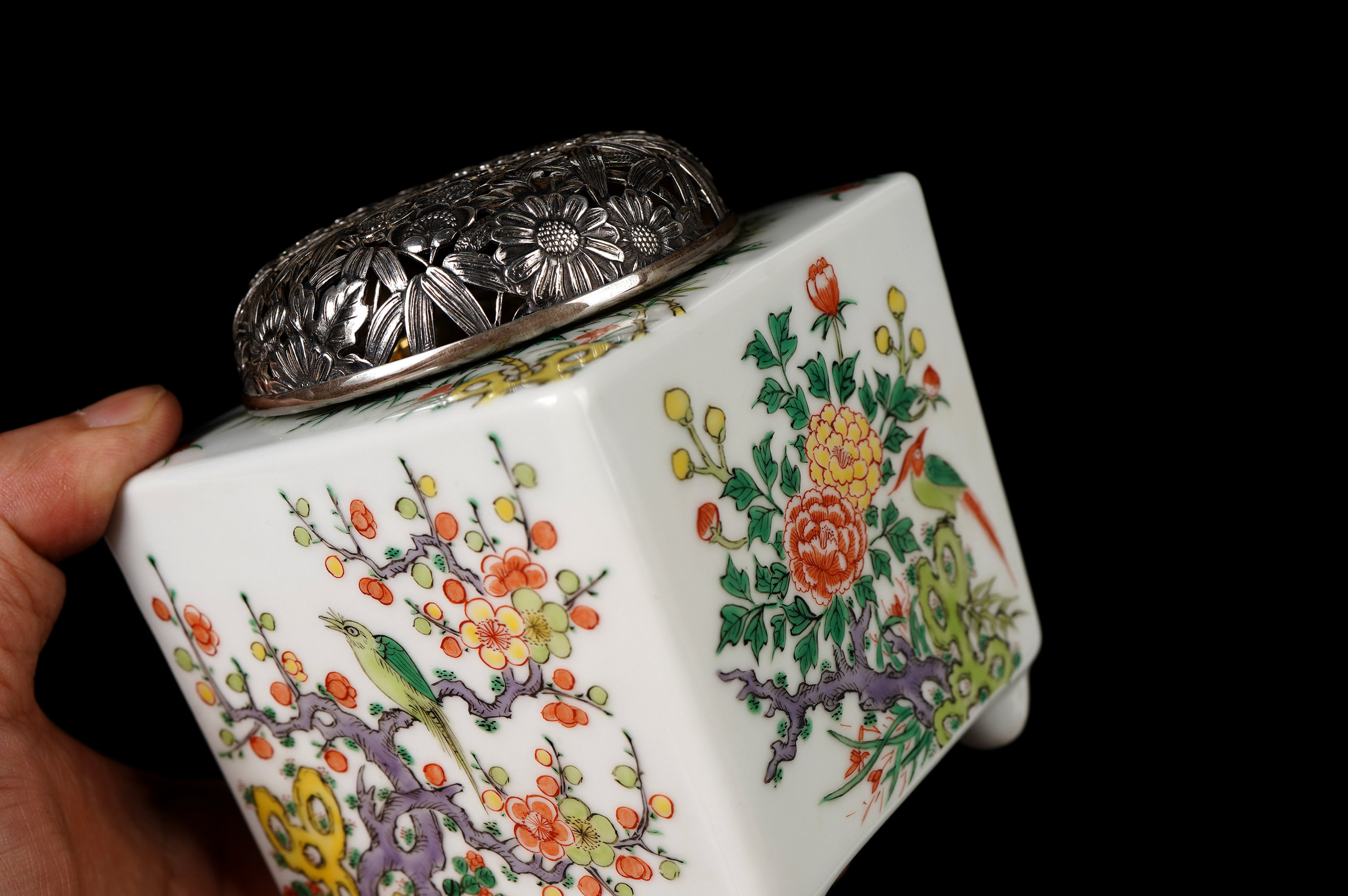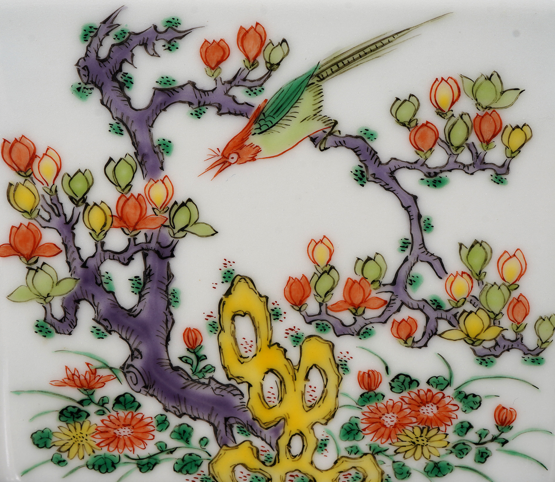 描述:以梅兰竹菊四君子为题材,瑞鸟环绕,用色鲜明,比例协调,小藏佳品。