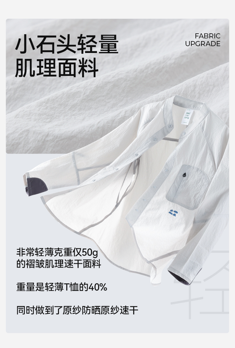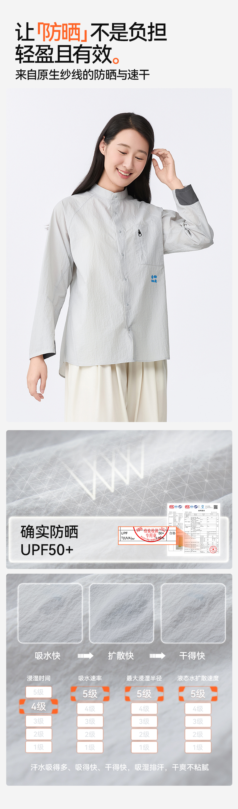 非常轻薄的面料--面料克重仅仅只有50g(是轻薄恤的40%,是普通A4纸的70%),但是轻薄的同时,又原纱防晒(UP50+),原纱速干(注意,都不是助剂实现的那种,都是原纱性能),都有报告支持。既是一件衬衫,又是一件防晒服。
