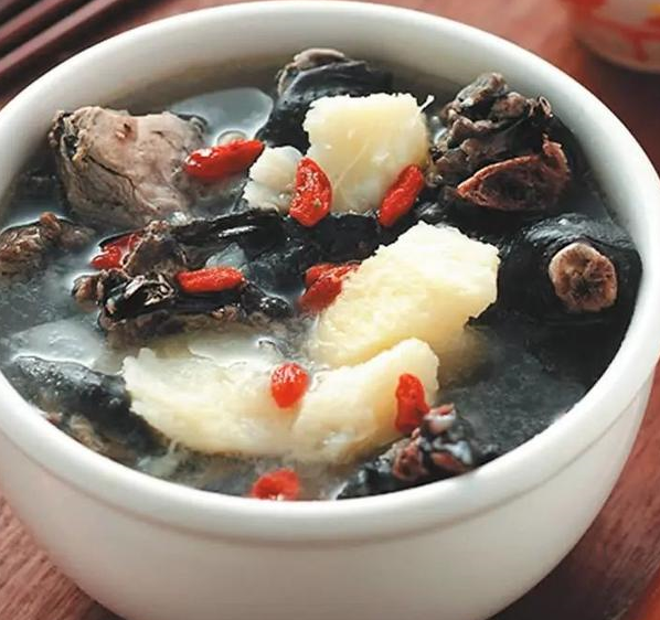 2、山药去皮切厚片放入砂锅中,加入枸杞、姜片和大量清水,大火烧开后转小火煲60分钟;