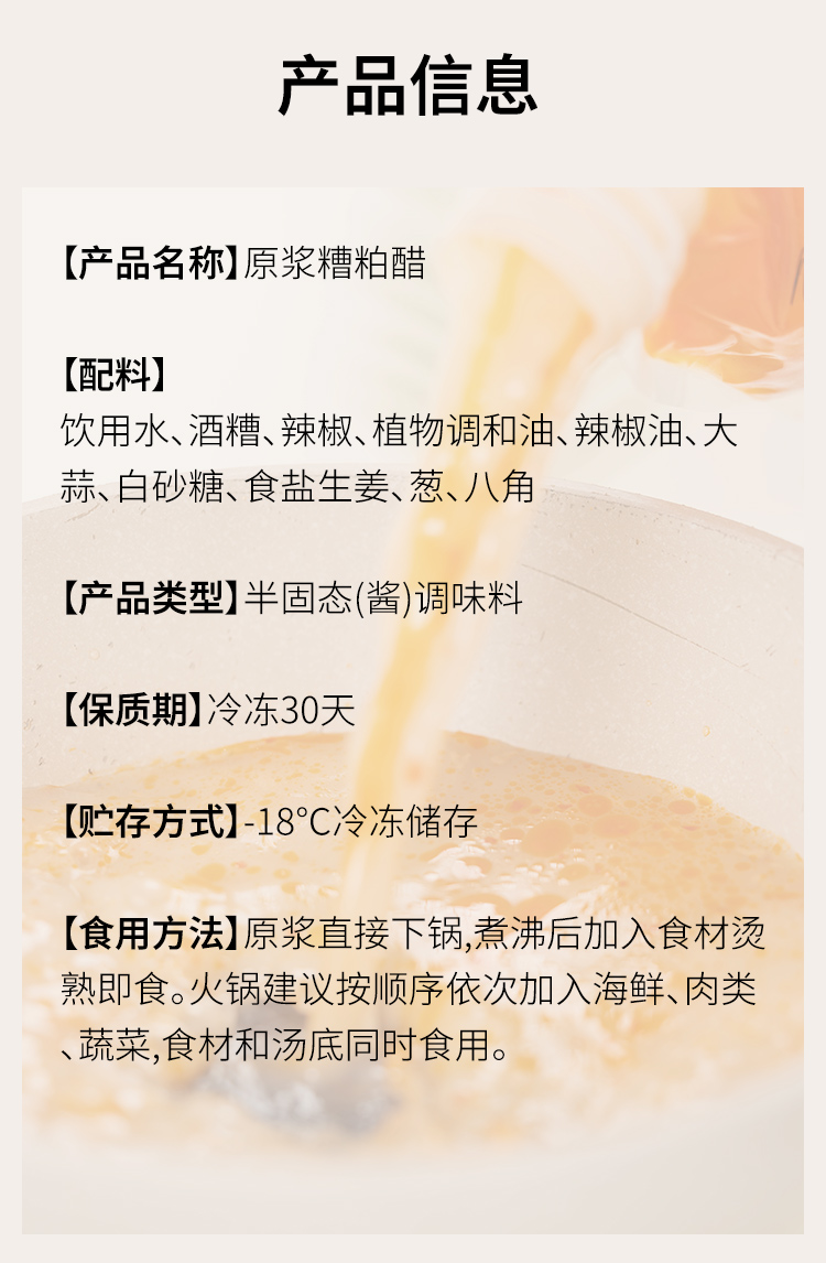 【食用方法】原浆直接下锅,煮沸后加入食材烫熟即食。火锅建议按顺序依次加入海鲜、肉类、蔬菜、食材和汤底同时食用。