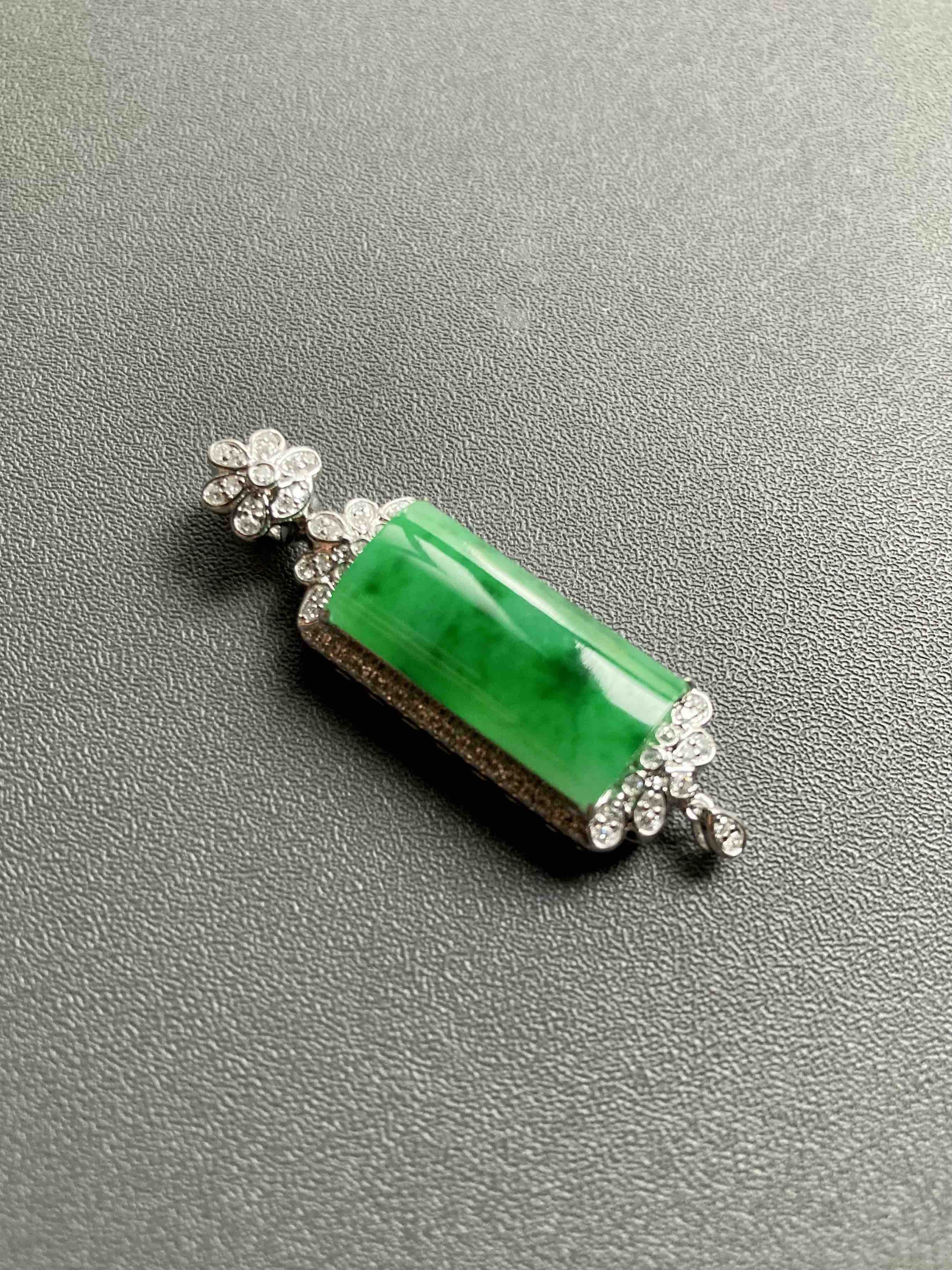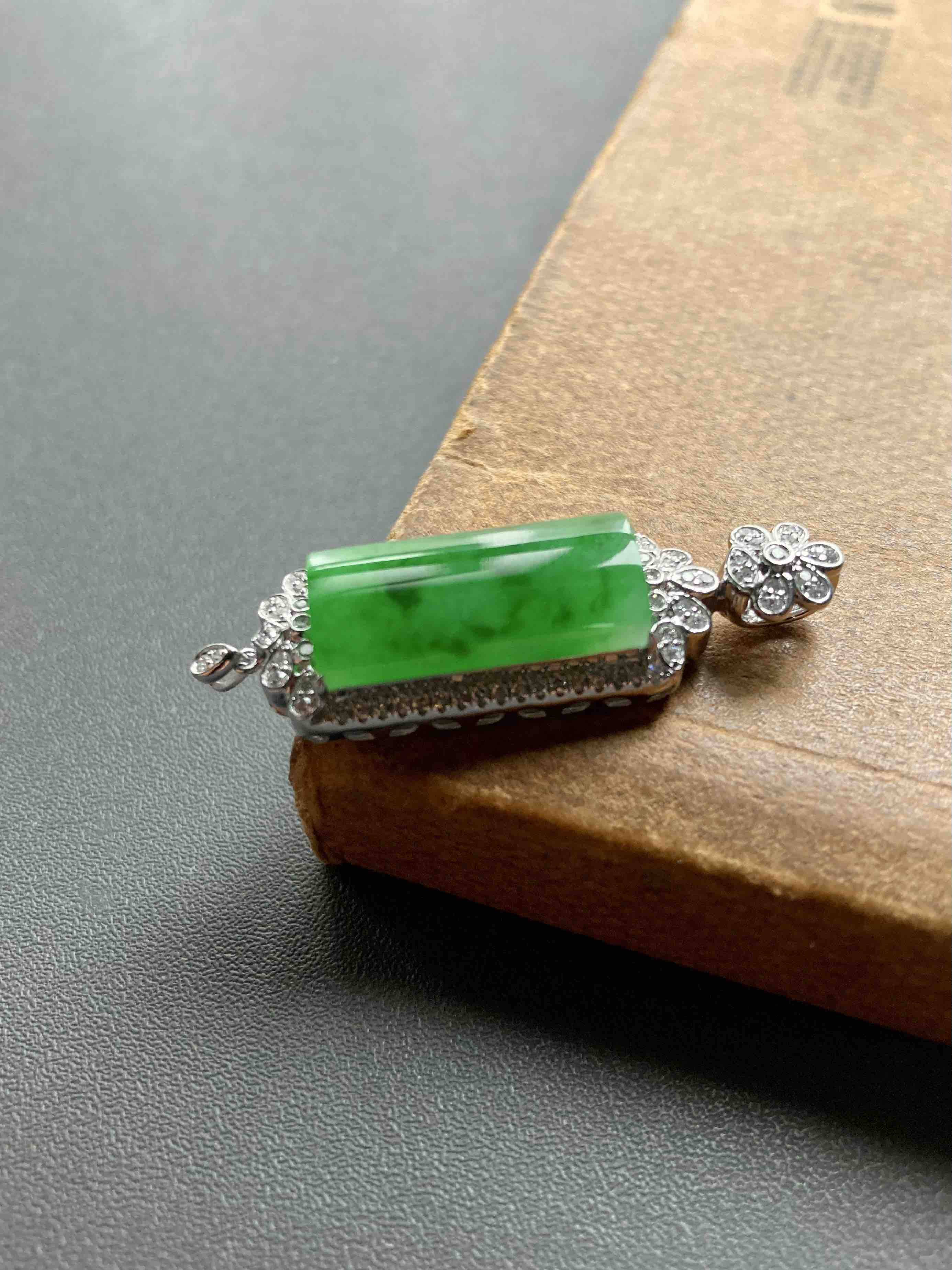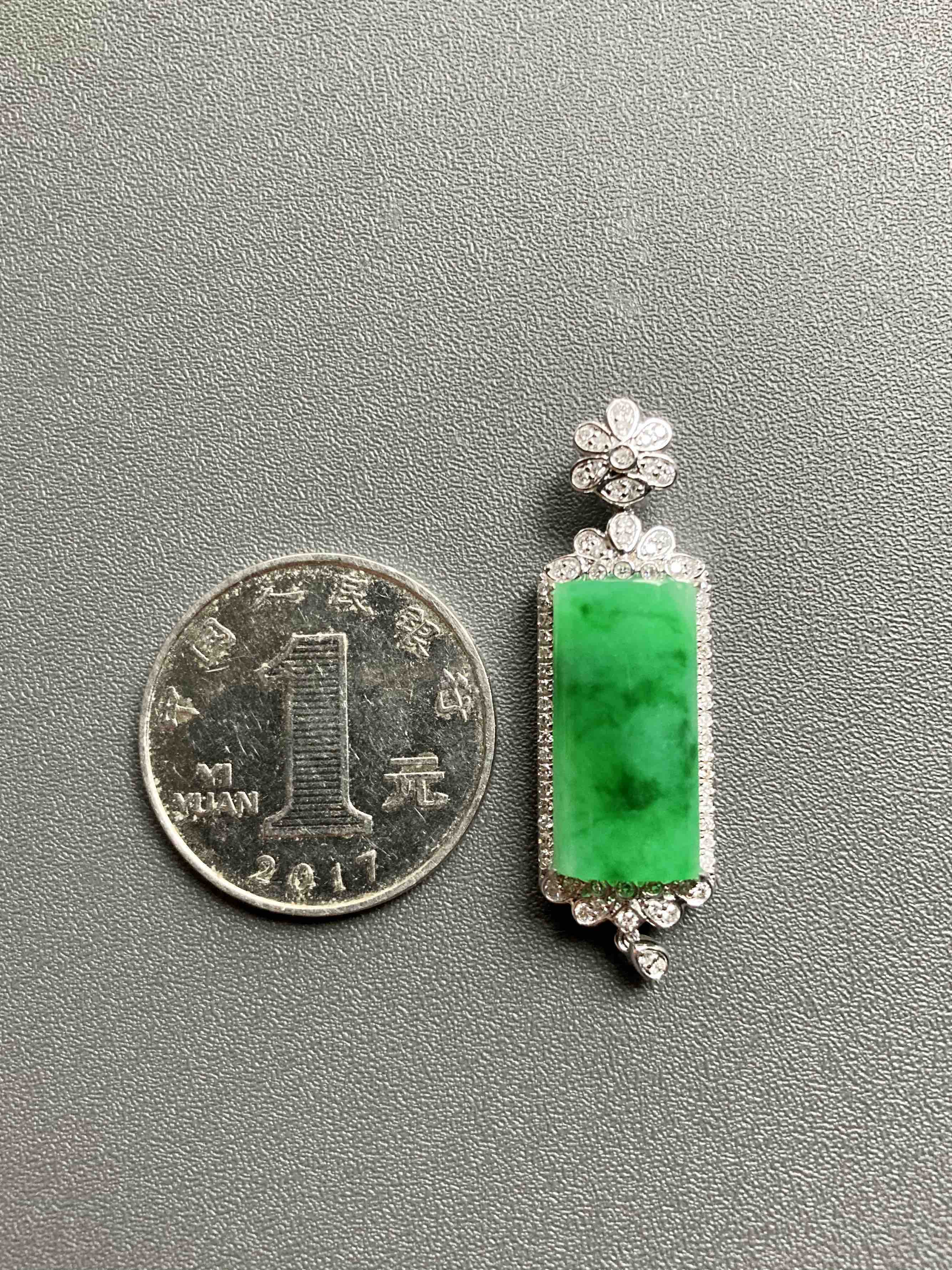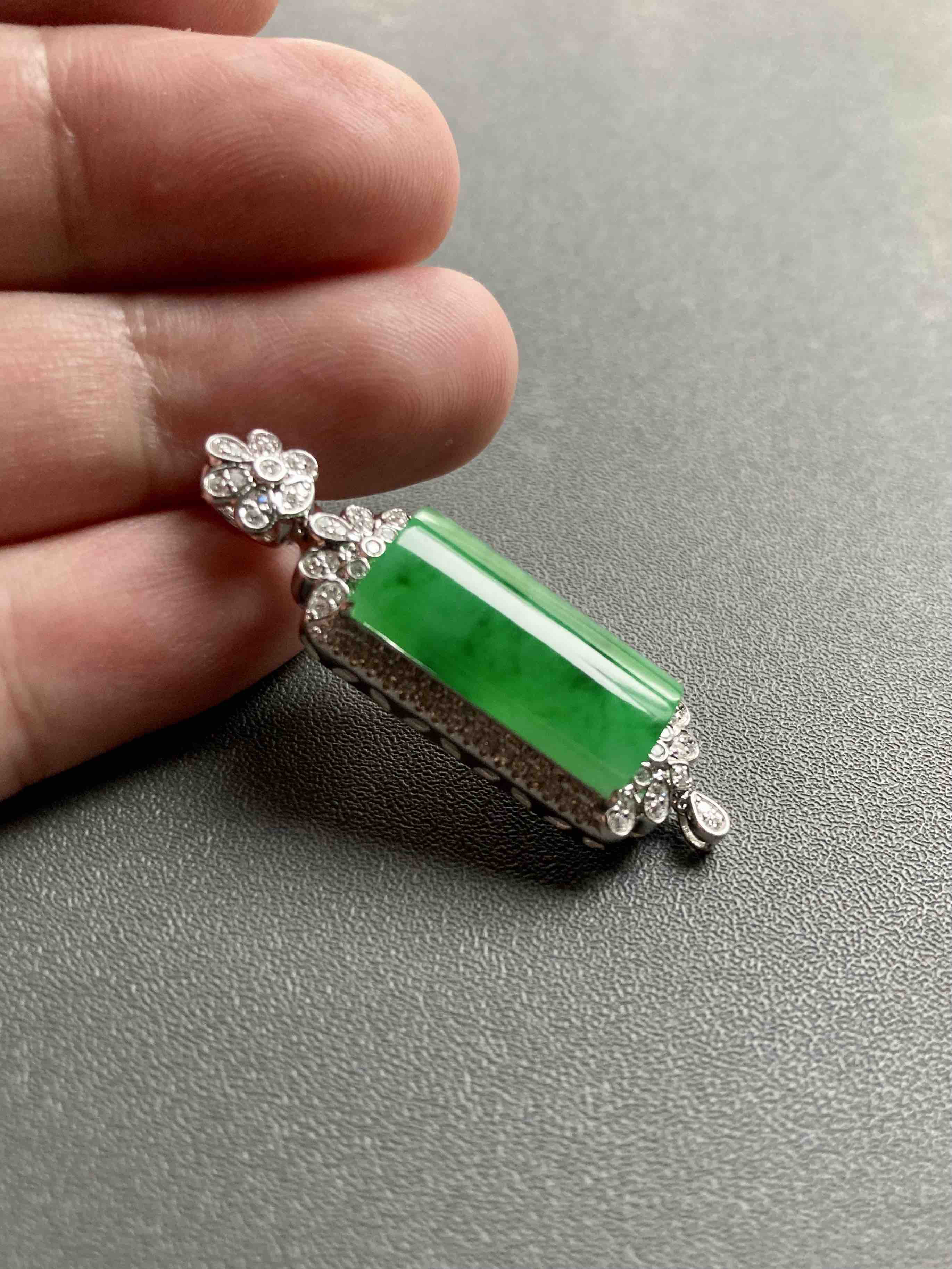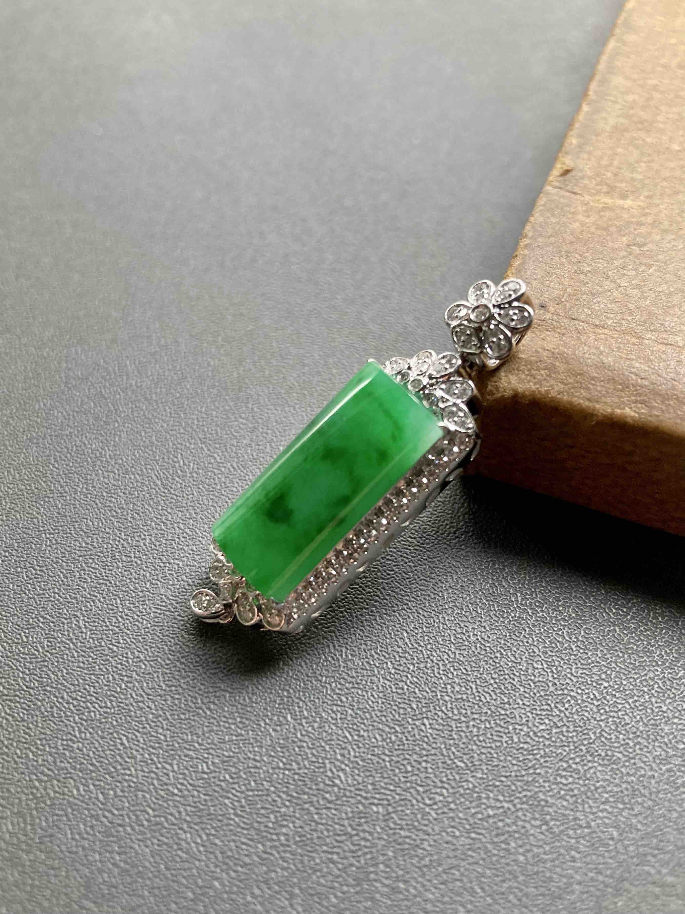糯冰种阳绿厚庄素面翡翠平安无事牌18k白金钻石镶嵌