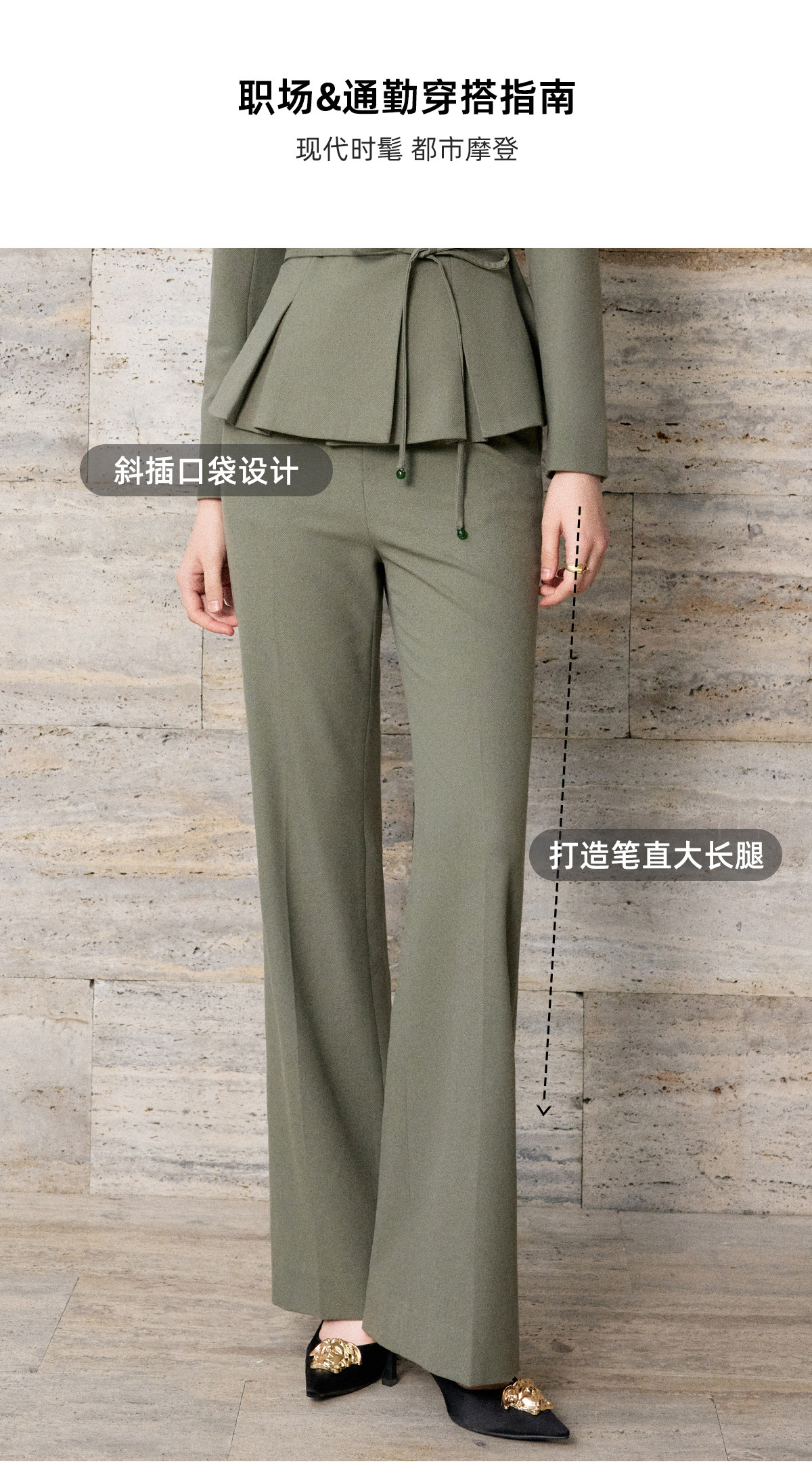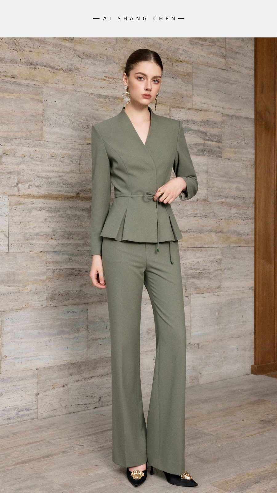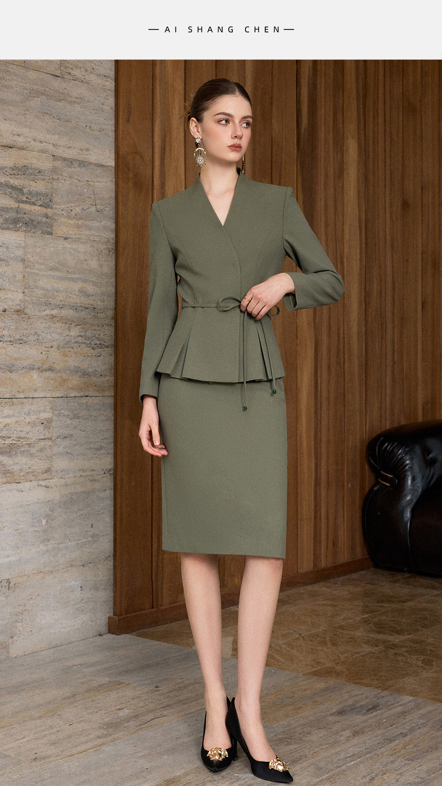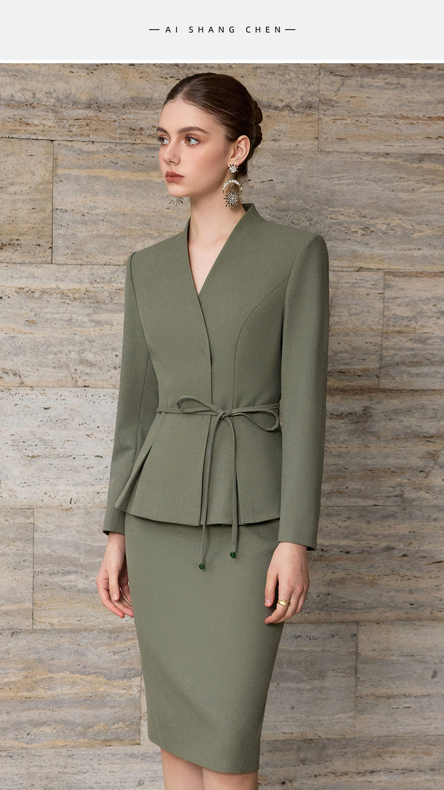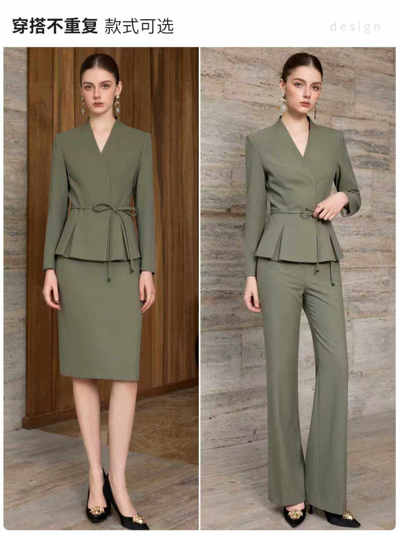 艾尚臣通勤风收腰西装套装女复古松绿色职业装气质正装束腰西服