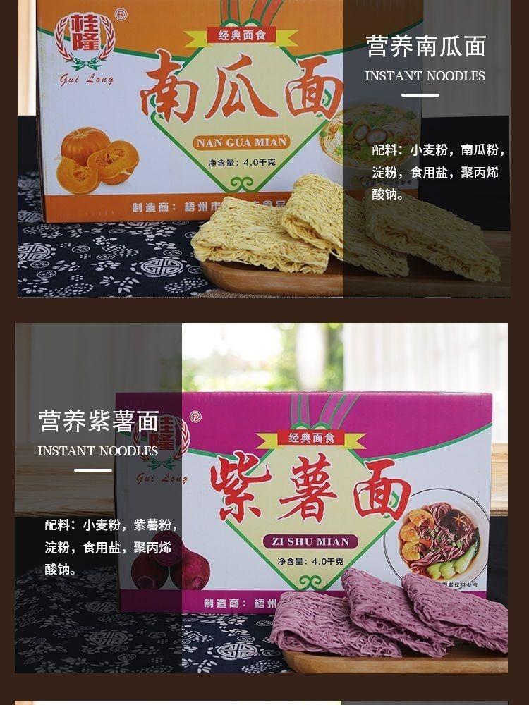 蔬菜面,菠菜面、紫薯面、南瓜面、胡萝卜面、淮山面、荞麦面,非油炸、块块面/大碗面,一箱8斤,55块左右