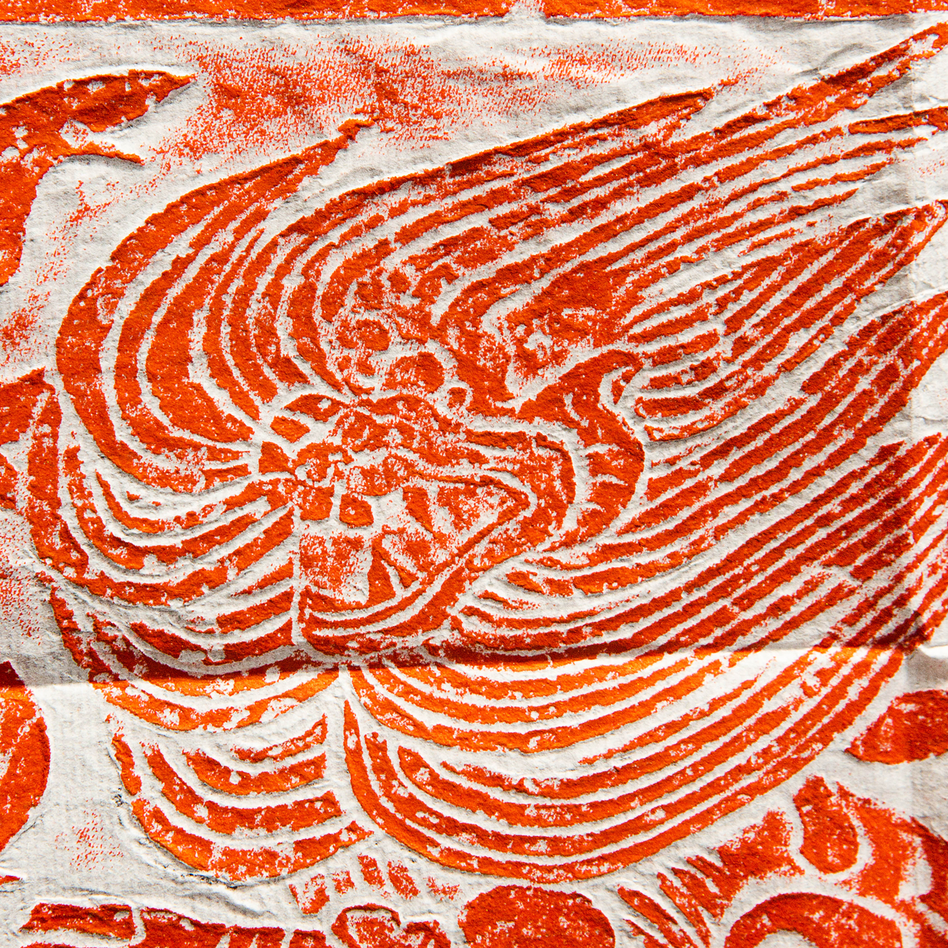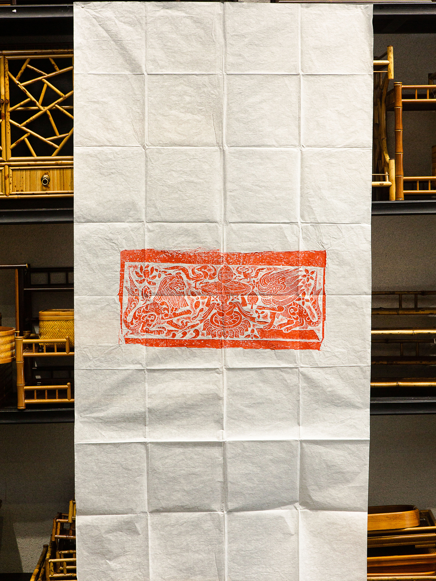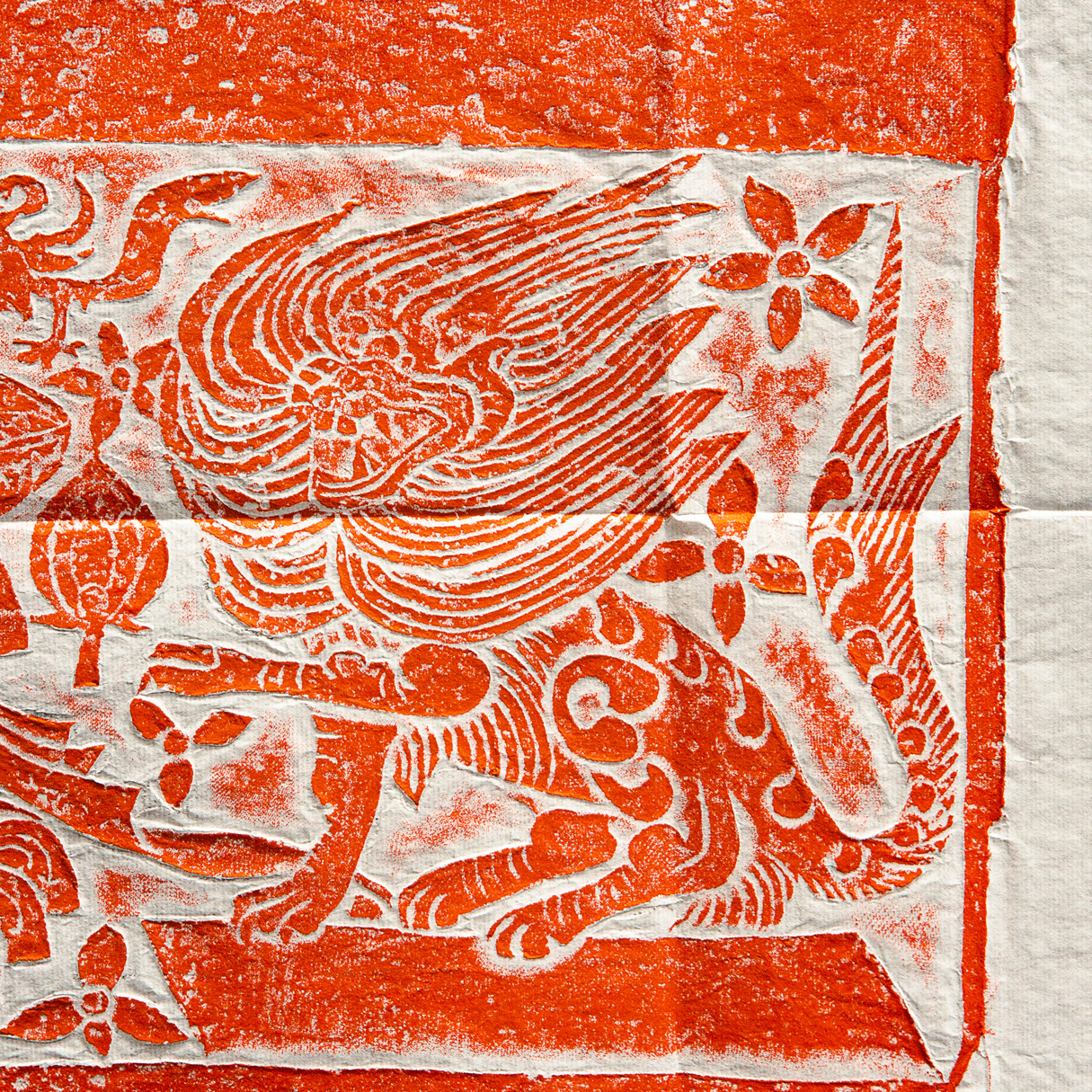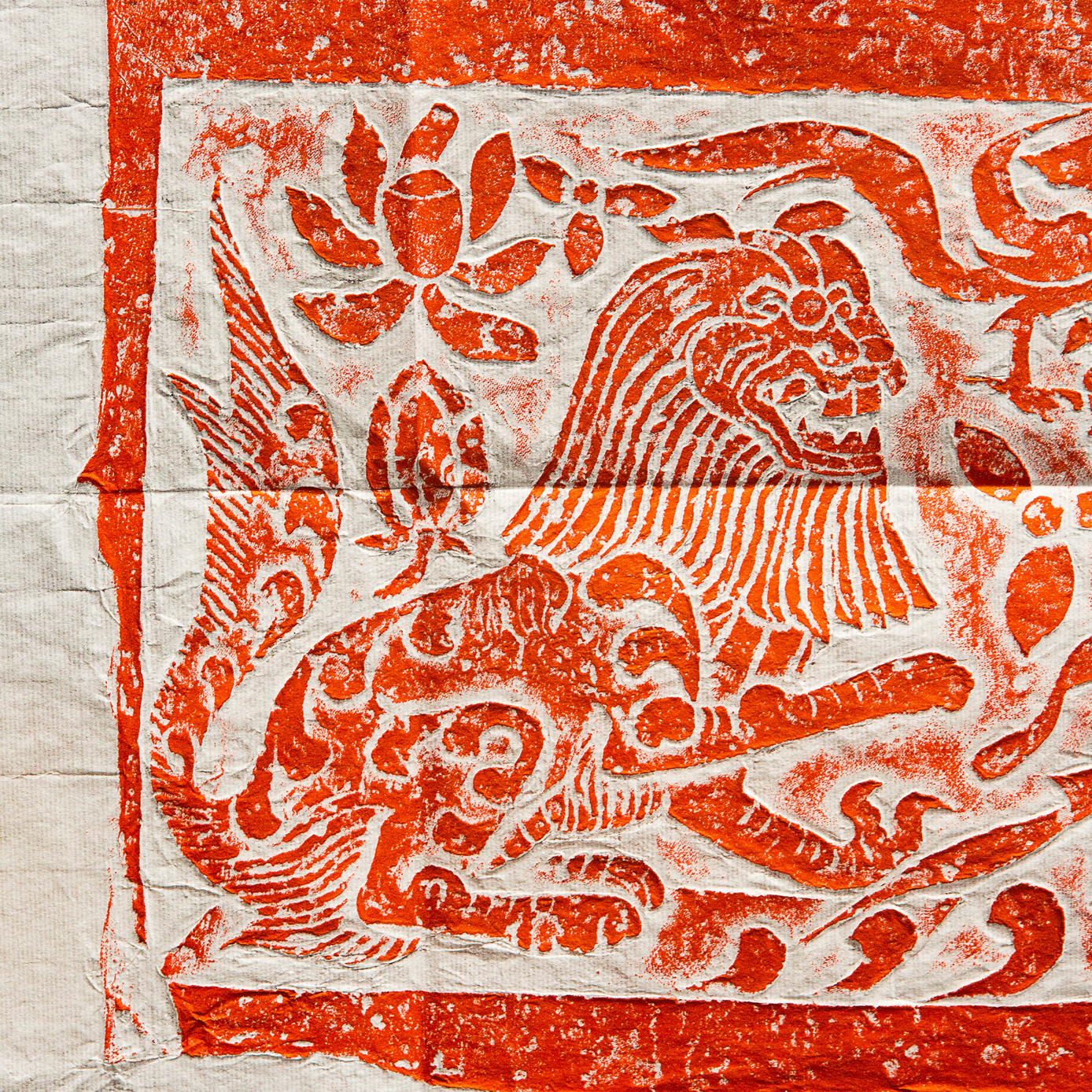 唐代双狮刻石拓片,原石原拓,拓工精细,精美华丽,狮子开脸威武有神韵,中间一人托举法器,人物衣褶灵动飘逸,法器上方两只凤鸟翩翩起舞,空中花朵漂浮,寓意美好。此拓片即是书法题跋的好素材,又是收藏之佳品。