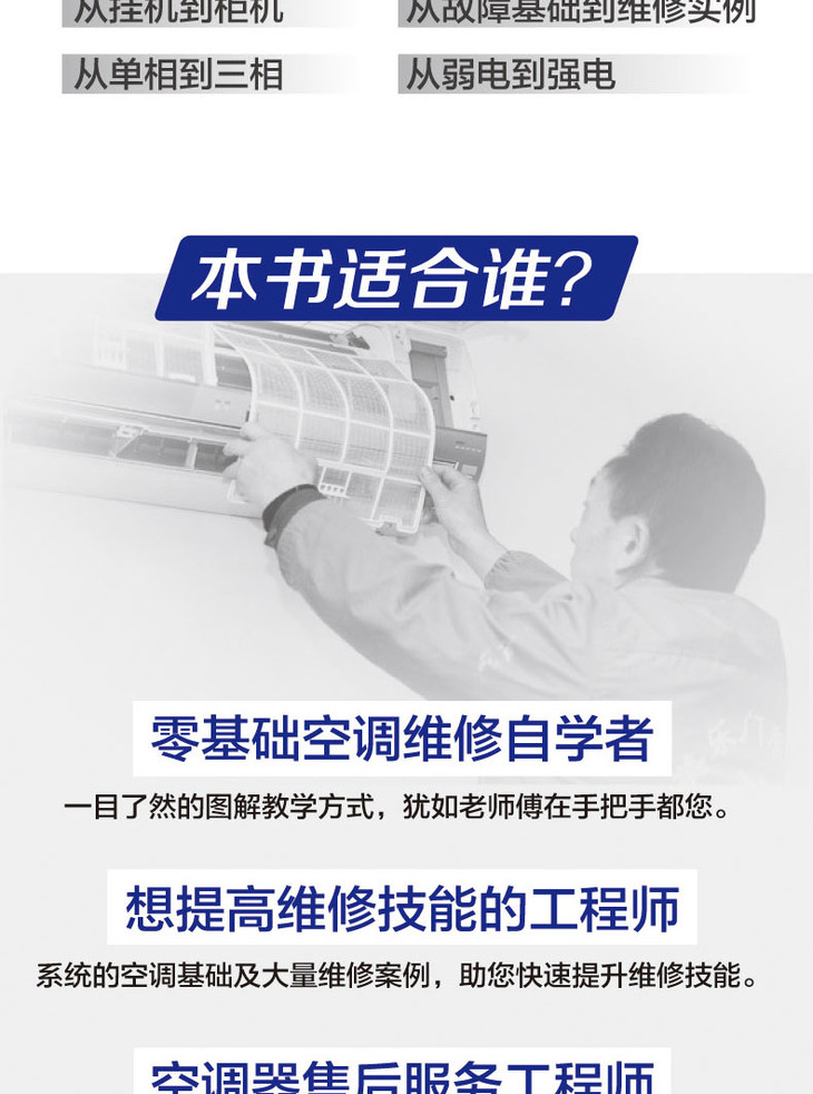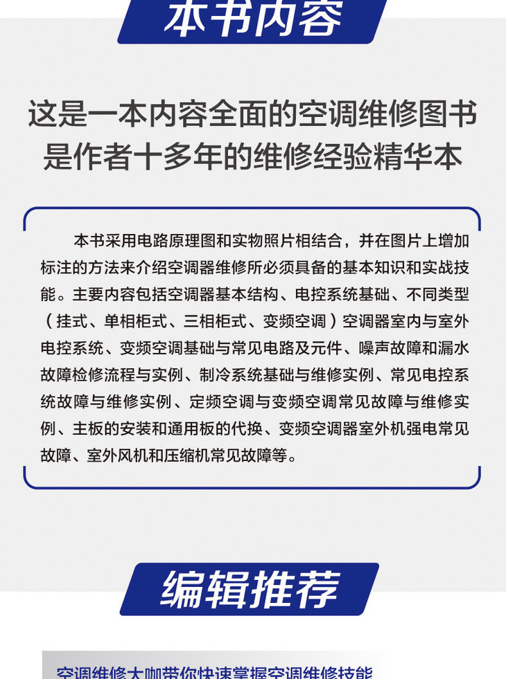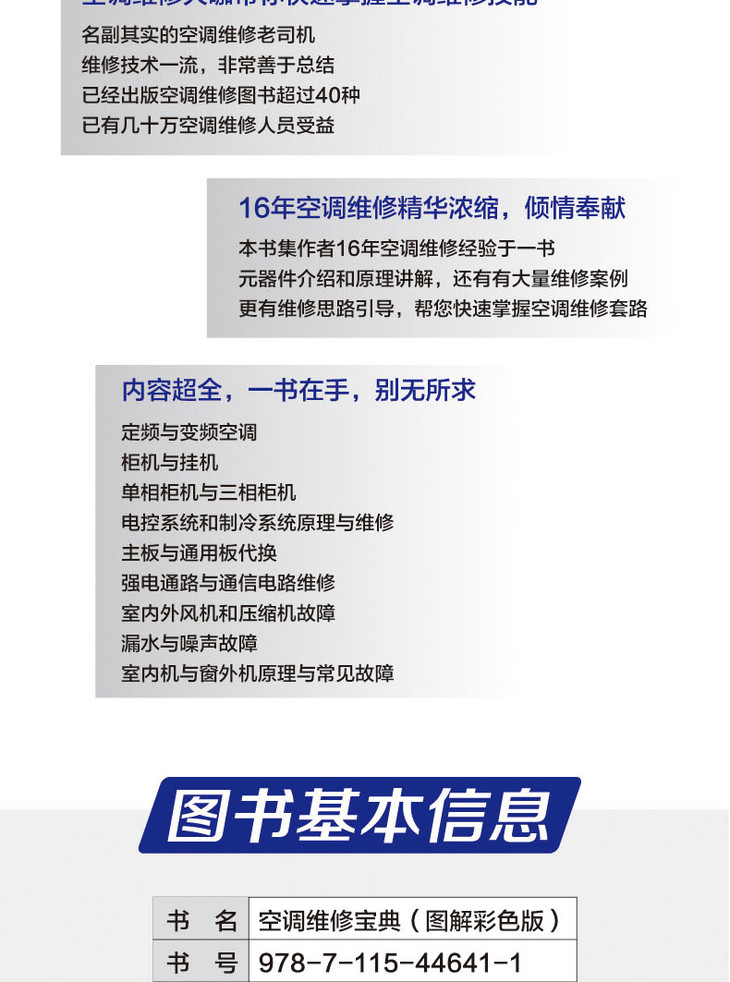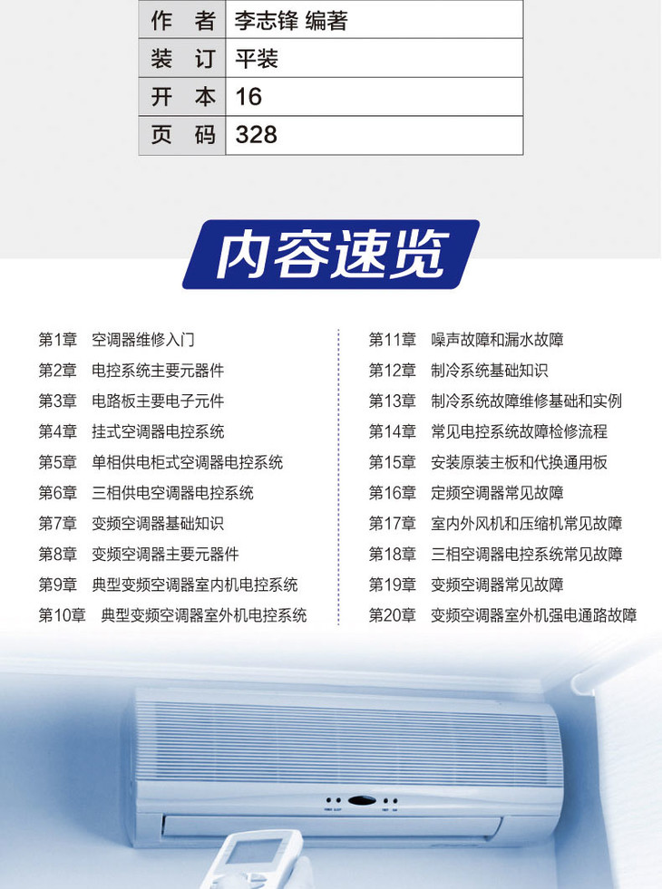李志锋,空调器维修工程师,2007年曾在海信空调青岛总部受训。长期在一线从事空调器维修工作,具有15年以上的维修经验。 编写空调维修图书超过30种,销售数量位居前列,受益读者超过几十万,受到广大读者的好评。