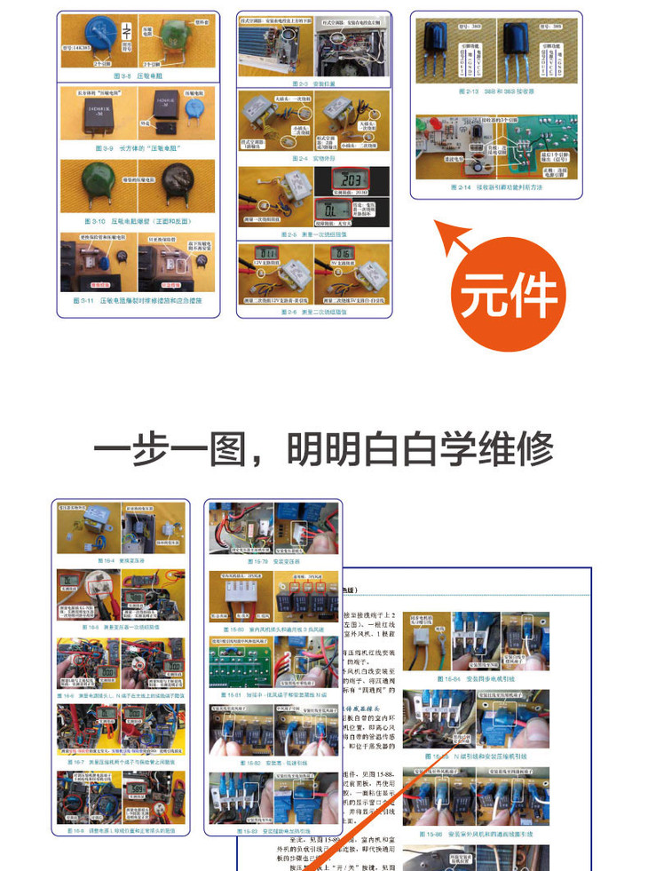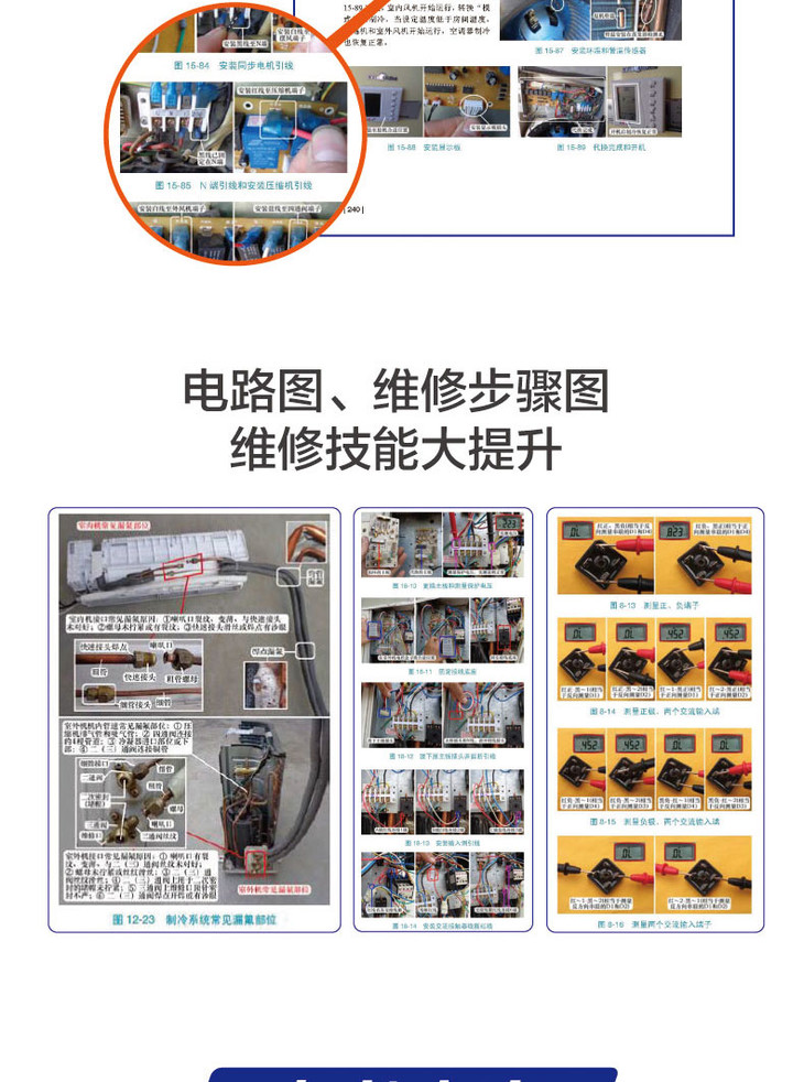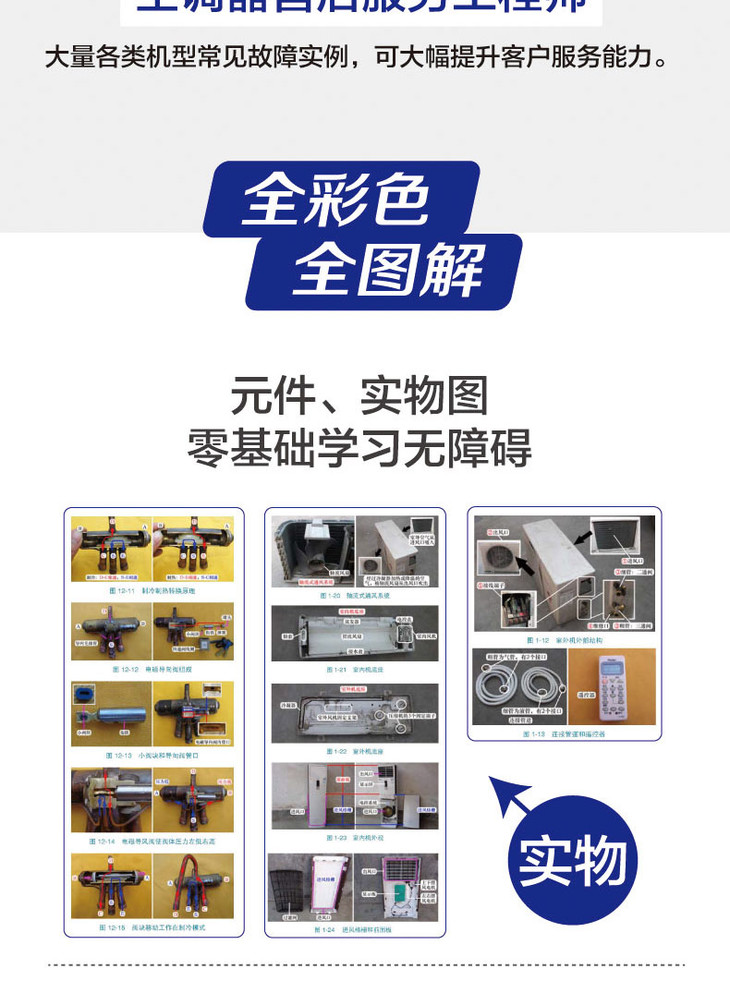 本书是一本全面的空调维修图书,作者是一线空调器维修专家,全部内容均源于实际的操作 经验。 本书采用电路原理图和实物照片相结合,并在图片上增加标注的方法来介绍空调器维修所必须具备的基本知识和实战技能。主要内容包括空调器基本结构、电控系统基础、不同类型(挂式、单相柜式、三相柜式、变频空调)空调器室内与室外电控系统、变频空调基础与常见电路及元件、噪音故障和漏水故障检修流程与实例、制冷系统基础与维修实例、常见电控系统故障与维修实例、定频空调与变频空调常见故障与维修实例、主板的安装和通用板的代换、变频空调器室外机强电常见故障、室外风机和压缩机常见故障等。 本书适合准备自学空调器维修的人员,无论有无基础均可阅读,也适合空调器维修售后服务人员、技能提高人员阅读,还可以作为中等职业院校空调器相关专业学生的参考书。