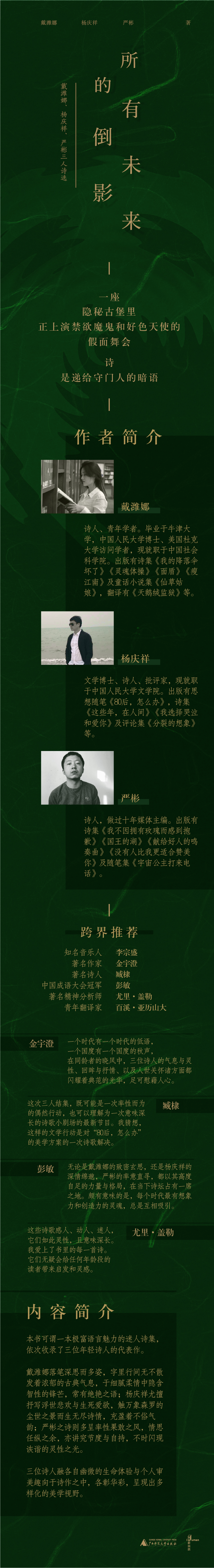 本书可谓一本极富语言魅力的迷人诗集,依次收录了三位年轻诗人的代表作。个中所涉题材甚为丰富,既有对生命的澄思静观、对人性的观照剖析、对往昔的感怀追思等颇具人文情怀的絮絮私语,亦不乏关于文学、关于创作等层面上的种种探思。戴潍娜落笔深思而多姿,字里行间无不散发着浓郁的古典气息,于细腻柔情中隐含智性的锋芒,常有 艳之语;杨庆祥尤擅抒写浮世悲欢与生死爱欲,触万象森罗的尘世之景而生无尽诗情,充盈着不俗气韵;严彬之诗则多呈率性果敢之风,情思任纵之余,亦讲究节度与自持,不时闪现诙谐的灵性之光。三位诗人融各自幽微的生命体验与个人审美趣向于诗作之中,各彰华彩,呈现出多样化的美学视野。
