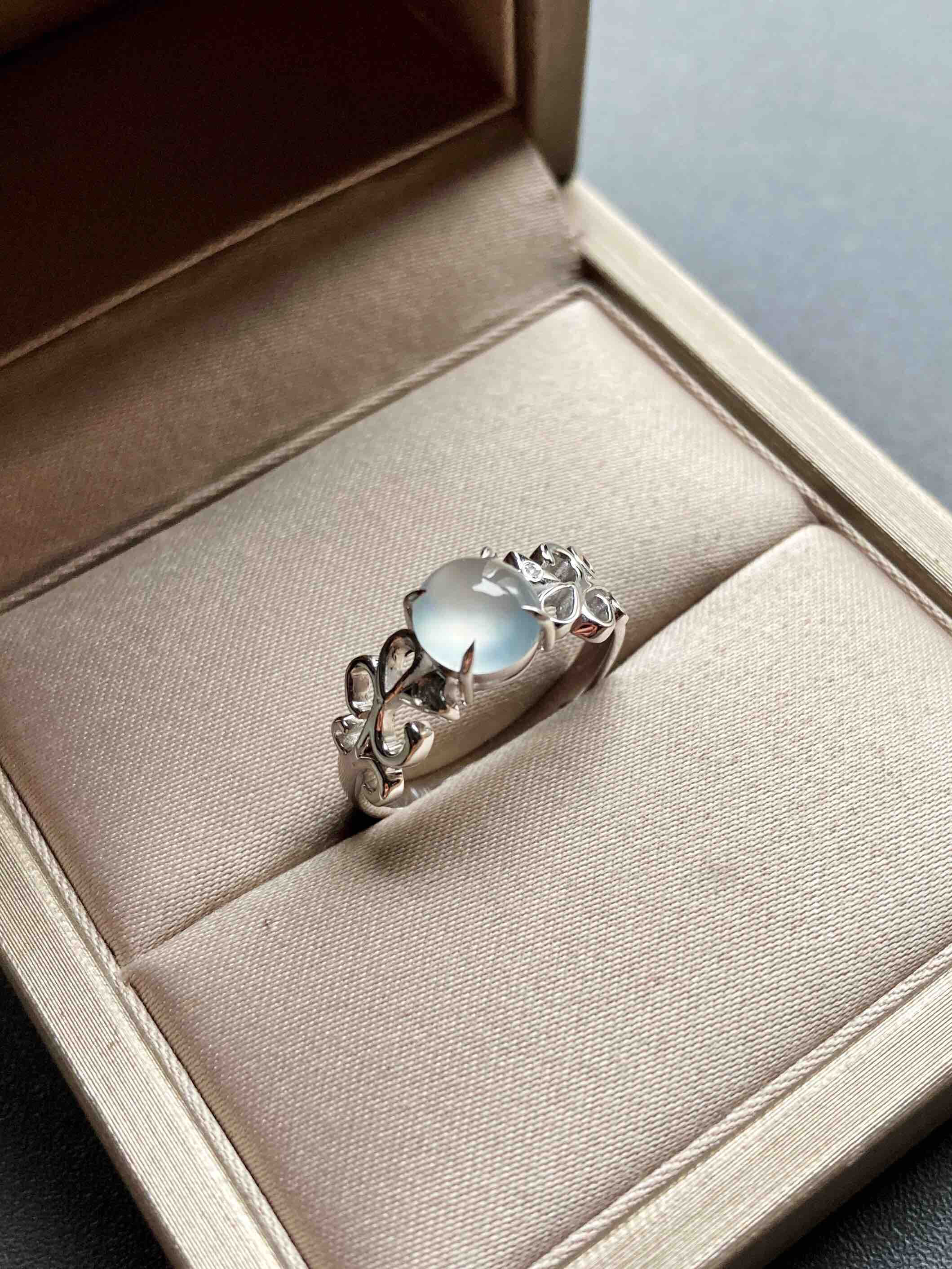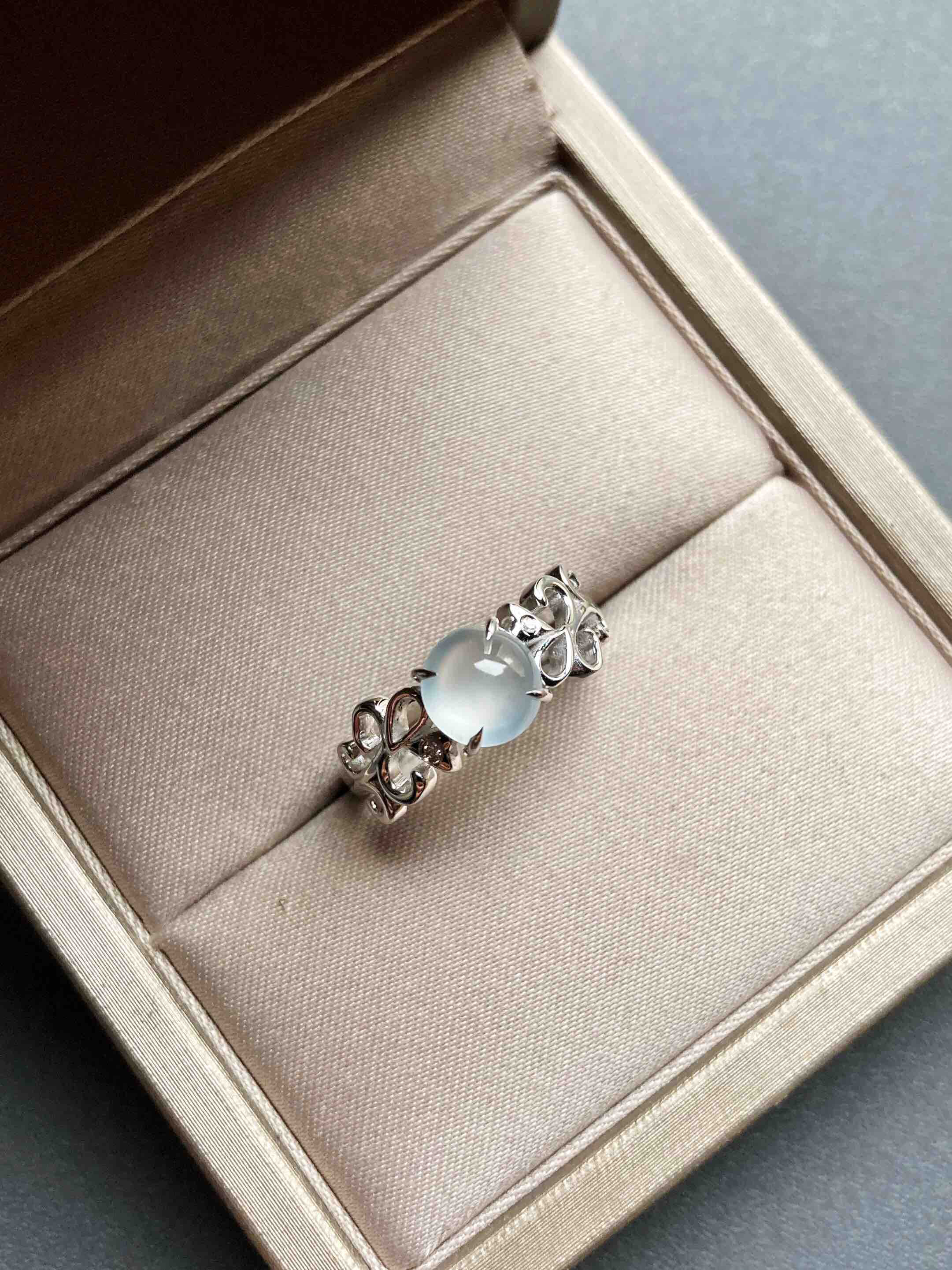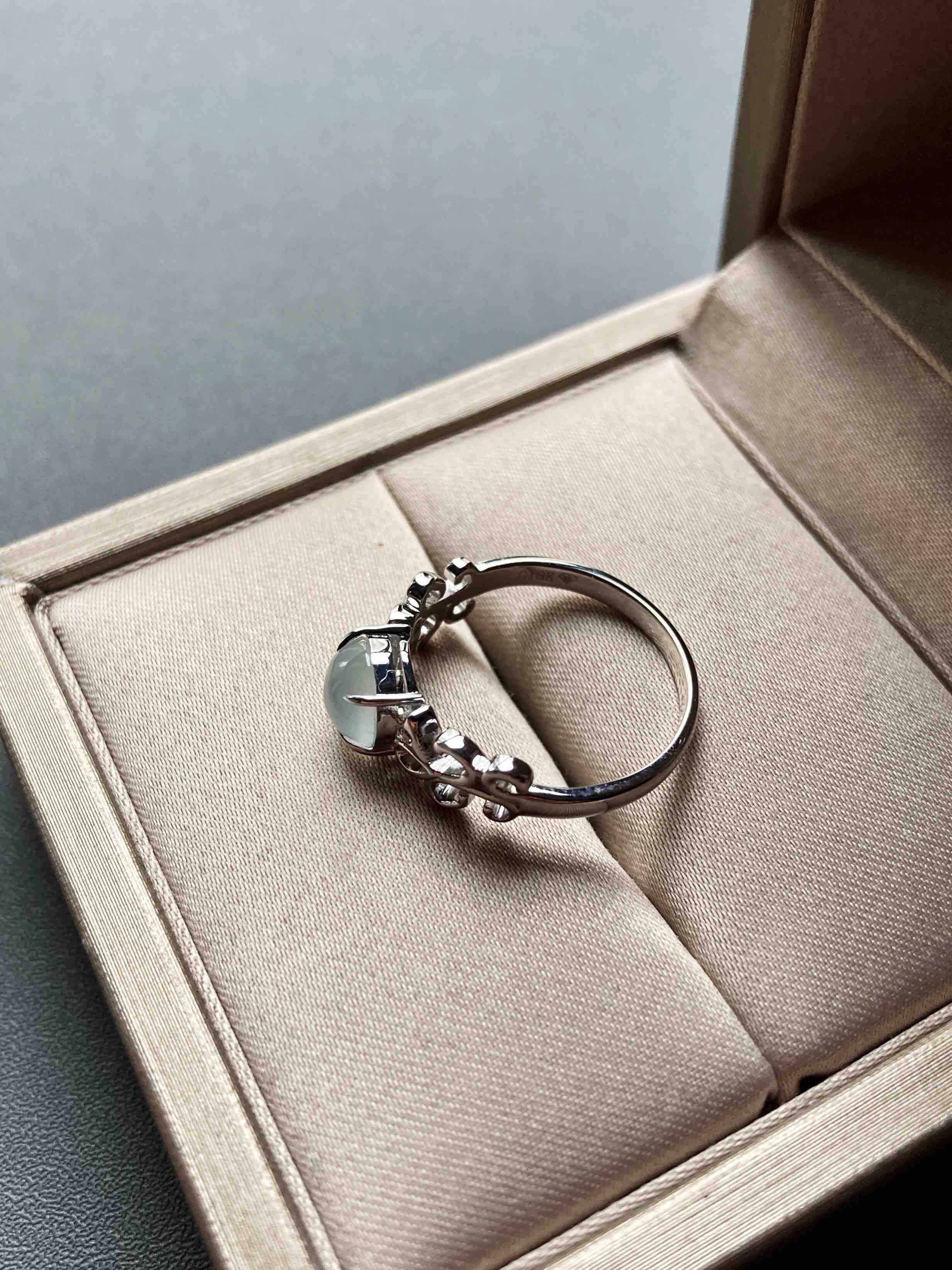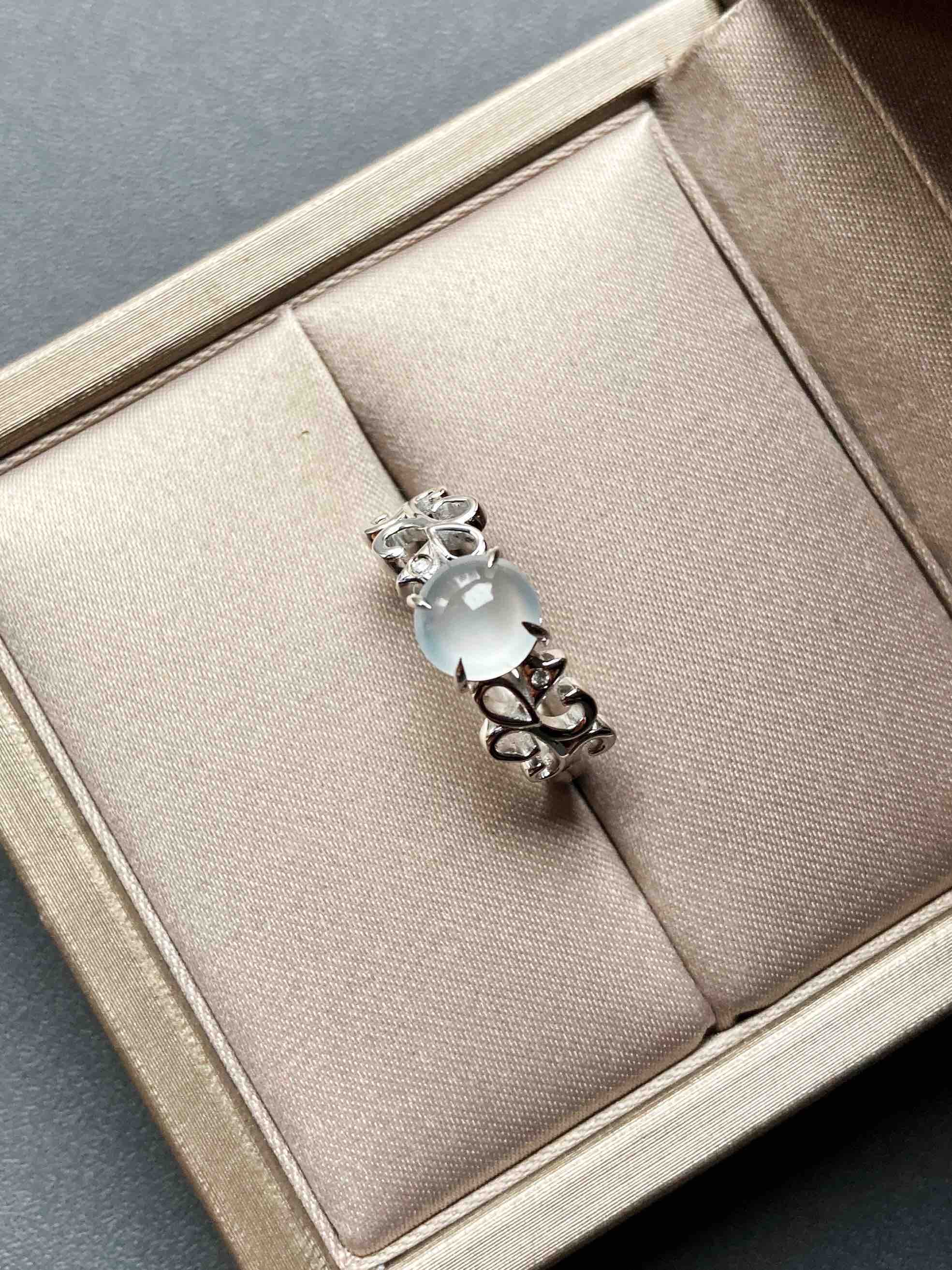 高冰到玻璃种翡翠蛋面戒指18k白金钻石镶嵌,蛋面6.5×6.4×3.2mm,机会还要错过?禄来家标本级的款式,高冰到玻璃种翡翠蛋面戒指,18k白金钻石镶嵌花式戒臂,蛋面荧光四射,寒气逼人,搭配白金,风格纯美,上手时尚靓丽风格,只要小四价位即可拥有,就一枚哦,圈号12可改大小
