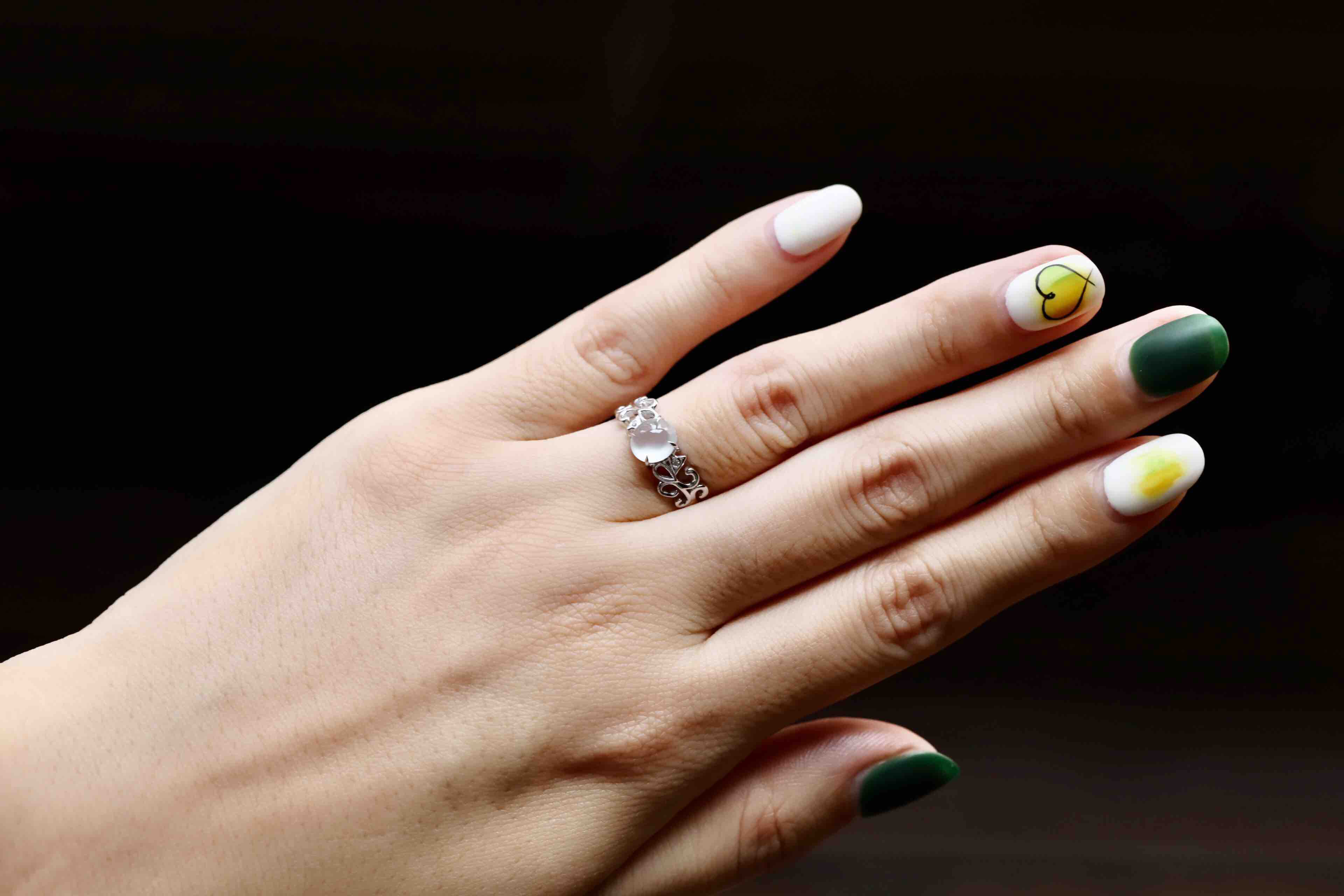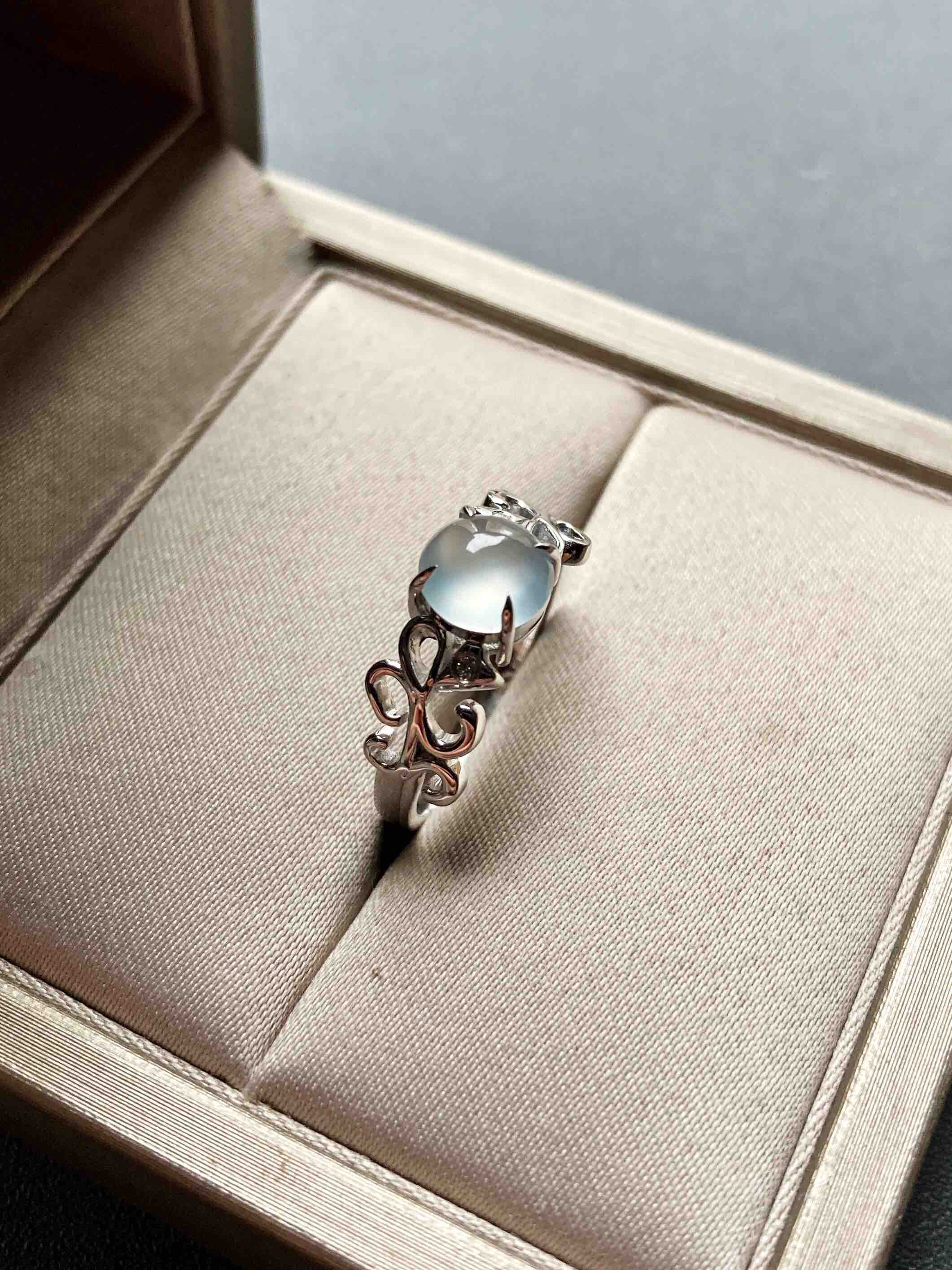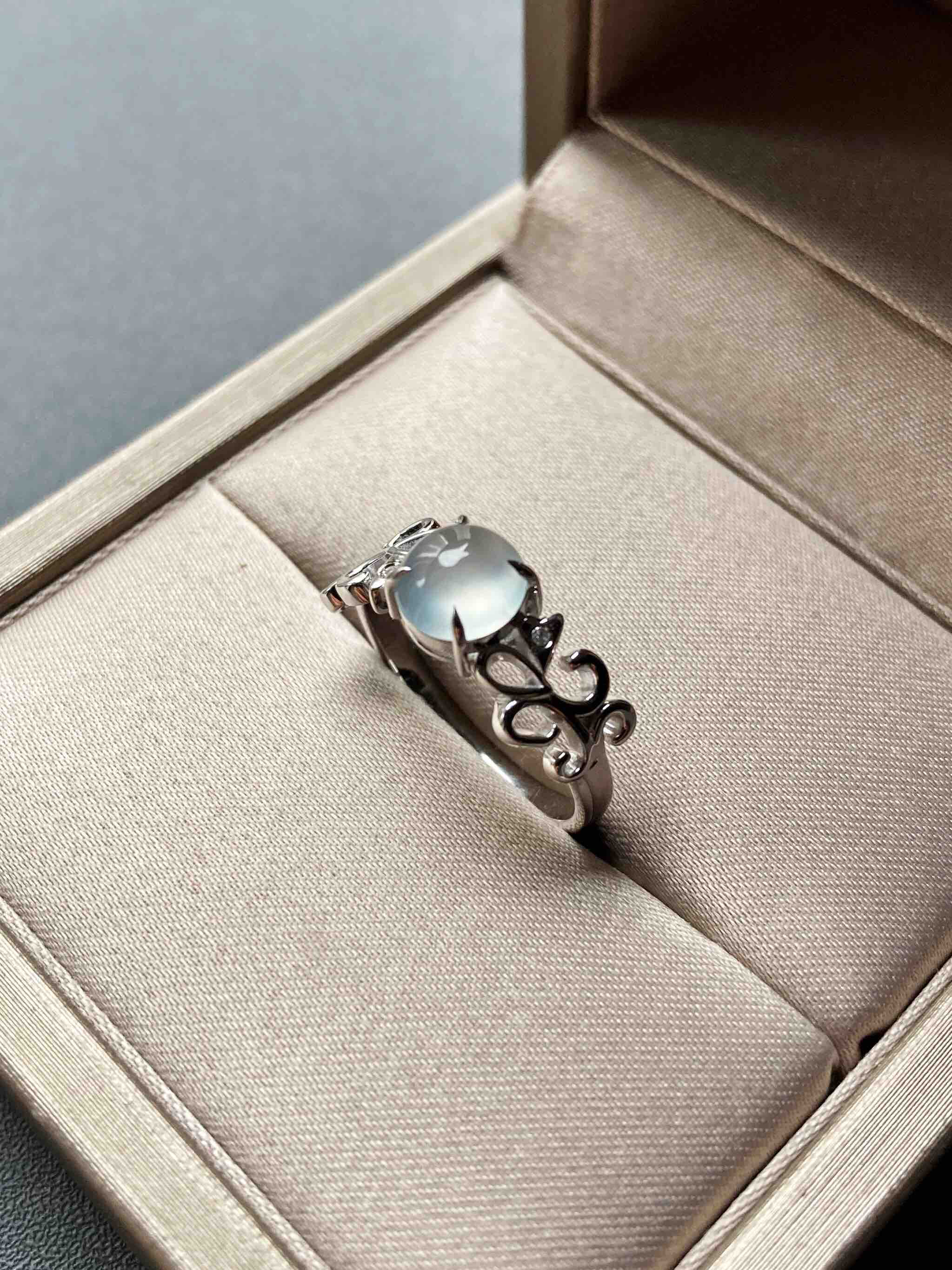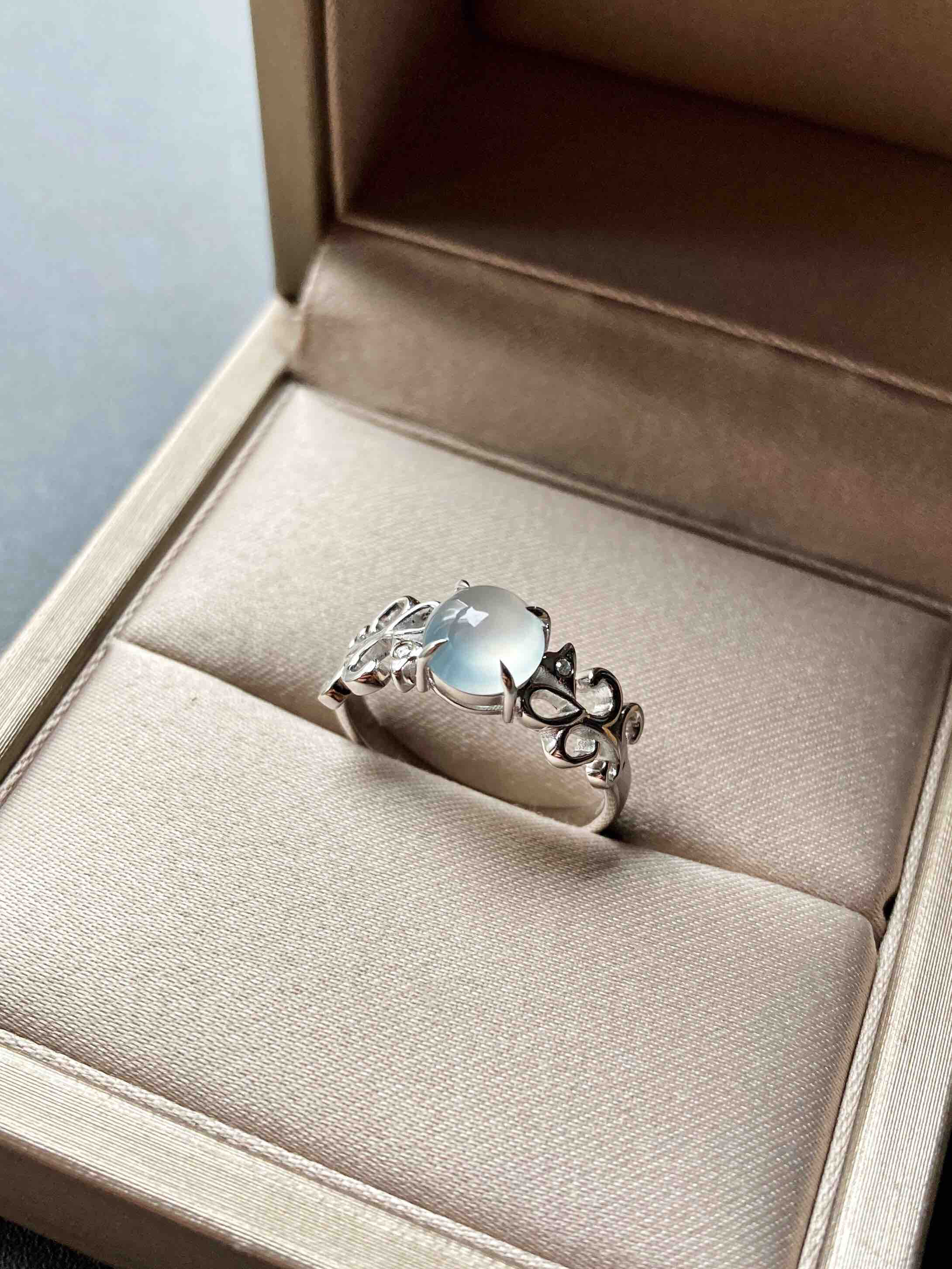 高冰到玻璃种翡翠蛋面戒指18k白金钻石镶嵌,蛋面6.5×6.4×3.2mm,机会还要错过?禄来家标本级的款式,高冰到玻璃种翡翠蛋面戒指,18k白金钻石镶嵌花式戒臂,蛋面荧光四射,寒气逼人,搭配白金,风格纯美,上手时尚靓丽风格,只要小四价位即可拥有,就一枚哦,圈号12可改大小