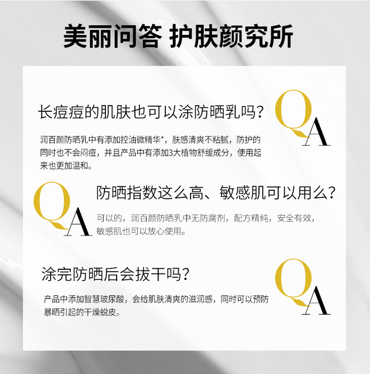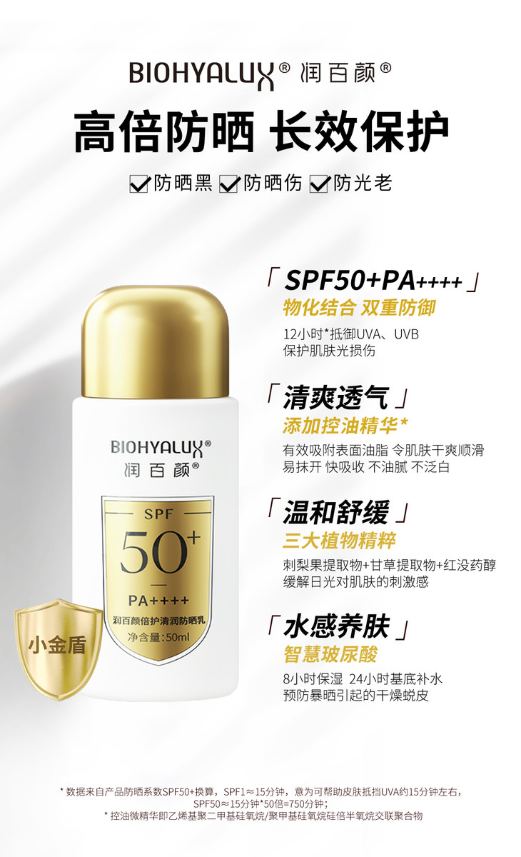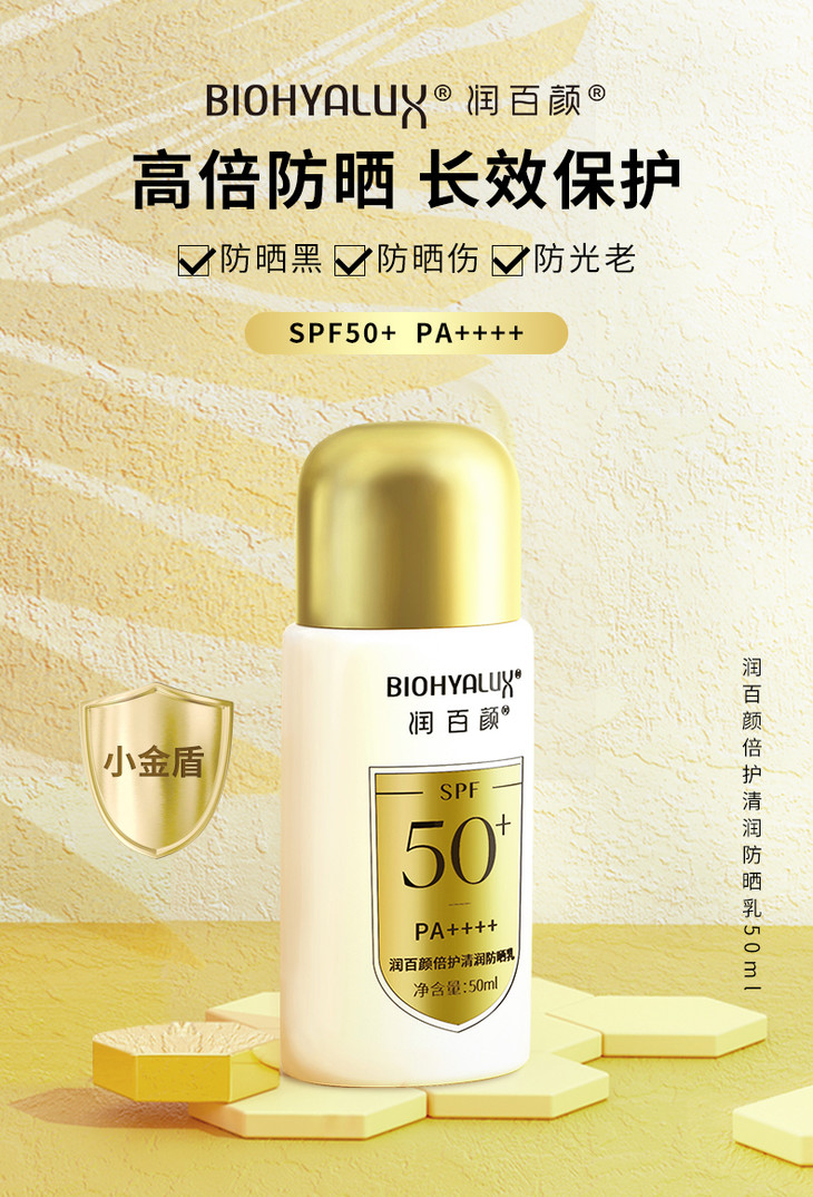 润百颜小金盾防晒乳就是用了物化结合的方式来达到一个全面不留死角的防护效果。