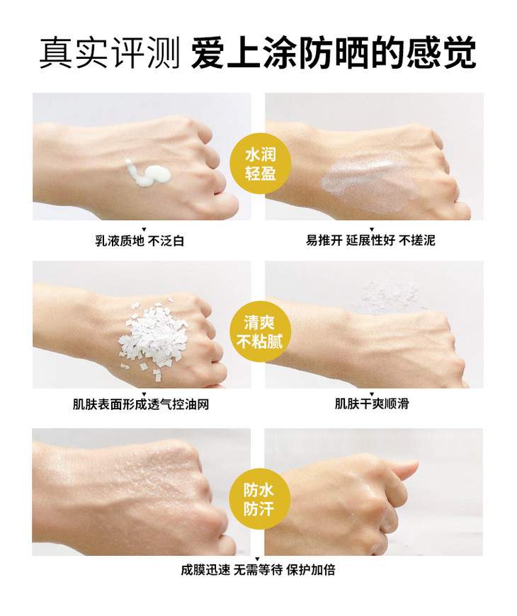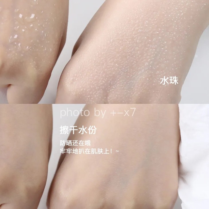 用水喷在涂抹防晒与未涂抹防晒的手背上,发现涂抹过防晒的手背上明显凝成一颗一颗的小水珠,足可见其防水效果。