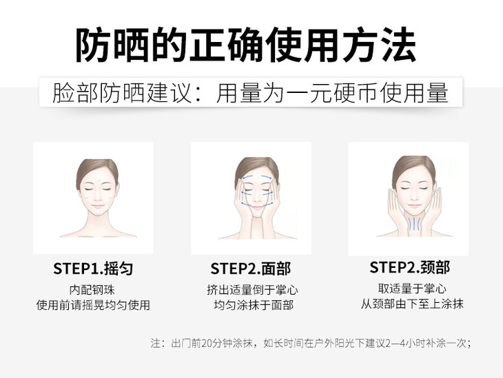 至于具体的用量,如果你只涂脸部和脖子,那么你大概需要一个硬币的量。