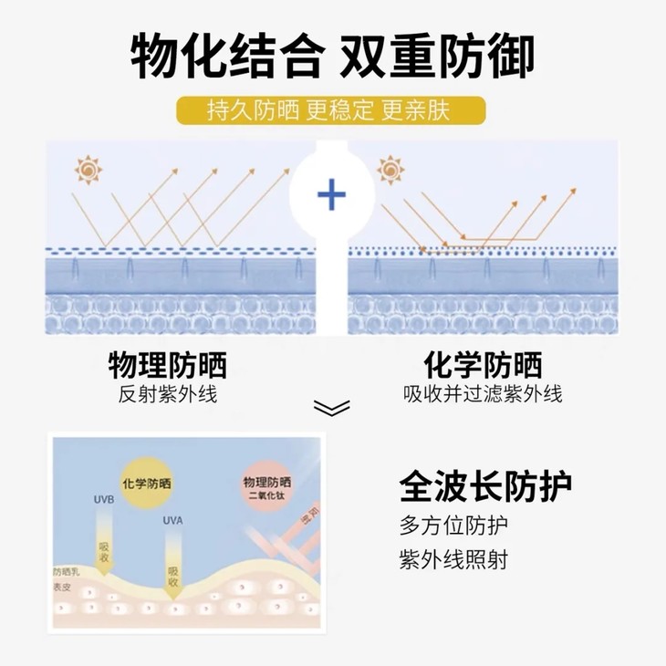 现在市面上很多的防晒基本都是采用物化结合,这么做是因为纯化学防晒防晒力容易缺失,而纯物理防晒肤感一般不太好。而物化结合的既能反射又能吸收,防护力更全面,既不会晒伤又不会晒黑。