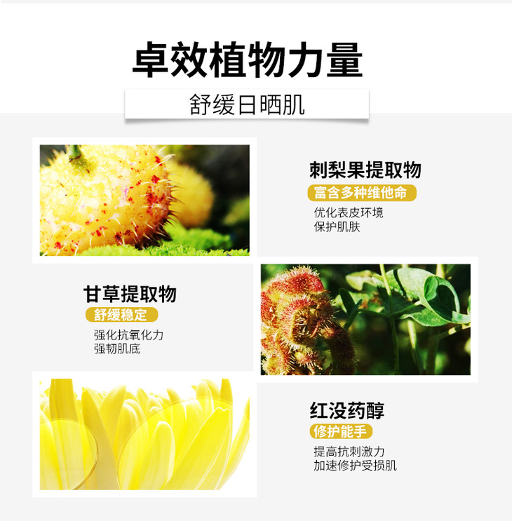 由于日晒后皮肤会变红,敏感,刺痛。为了缓解肌肤的各种不适,特意添加了刺梨果提取物+甘草提取物+红没药醇这三种缓解的植物提取物,可以有效针对于晒后不适。